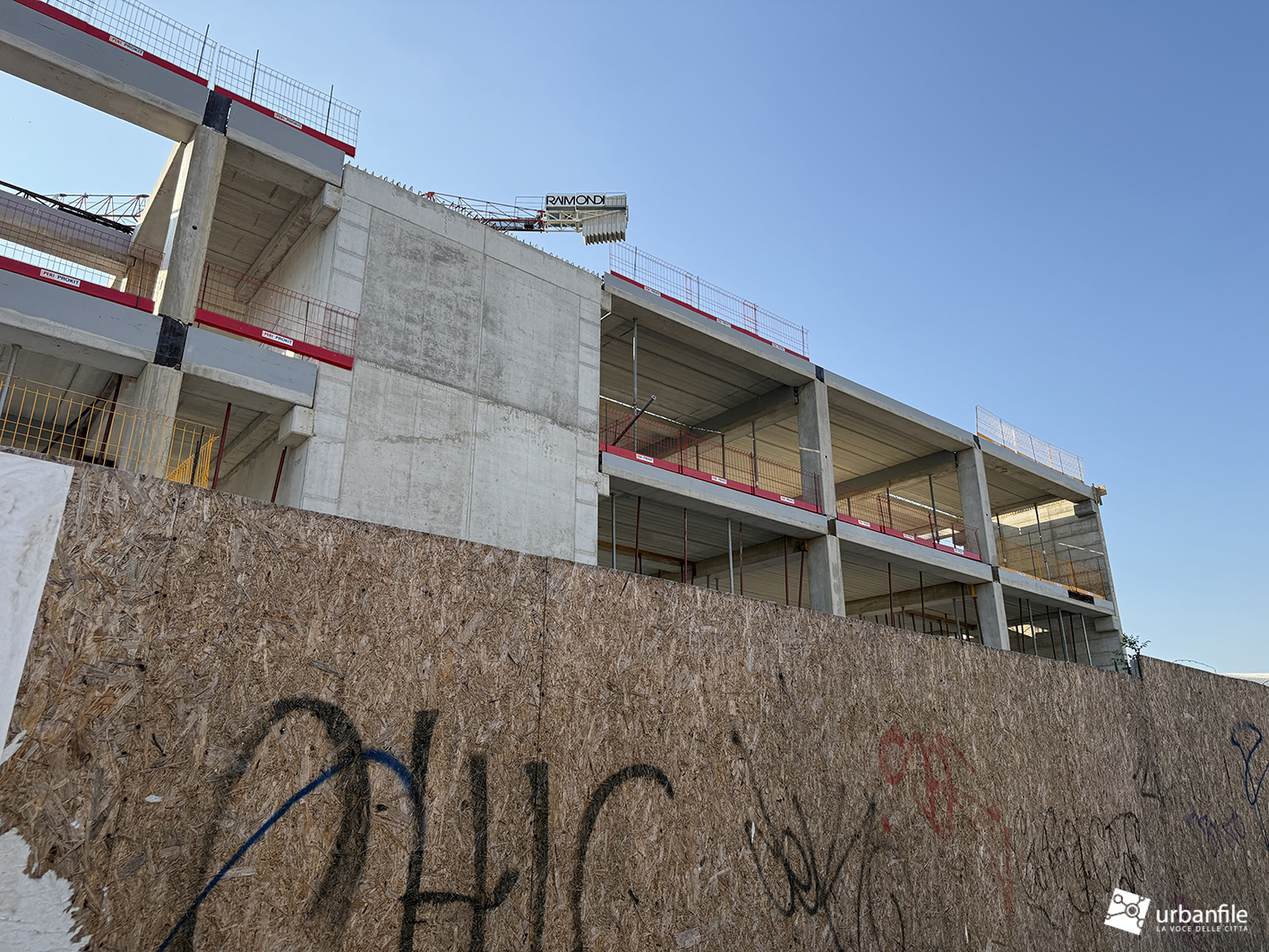 Da diverse settimane si può già vedere la struttura del nuovo centro sportivo salire con travi e pilastri lungo il lato di viale Elia.