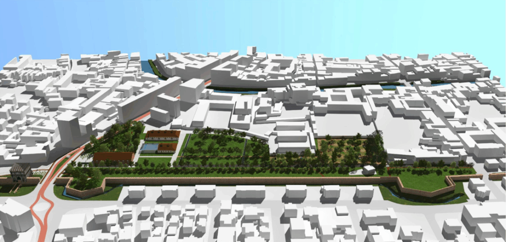 La realizzazione di questo nuovo parco prevede un passaggio di suolo permeabile all’80% contro il 50% di oggi, su un’area a parco di circa 50.000mq. Verranno realizzati 300 posti auto, vi sarà la demolizione di tutti gli edifici non vincolati dalla sopraintendenza per fare spazio al verde e ne resteranno in piedi solo tre degli attuali. Il progetto riguarda tutte le parti a verde e le aree occupate ancora per poco dalle costruzioni.