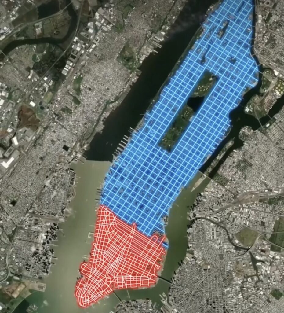 Manhattan, New York, USA – In rosso, uno sviluppo urbano “spontaneo” e poco regolato. In blu, uno sviluppo urbano più regolamentato.