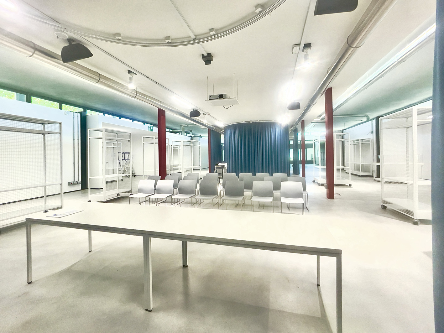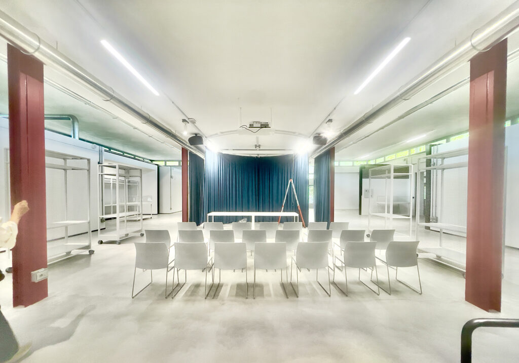 Gli spazi includono sale espositive, laboratori, bookshop, bar, uffici e aree per conferenze e attività di quartiere; al piano interrato si trovano deposito, laboratorio e sale di consultazione. All’esterno, terrazze e cortili sono pensati per ospitare eventi culturali.