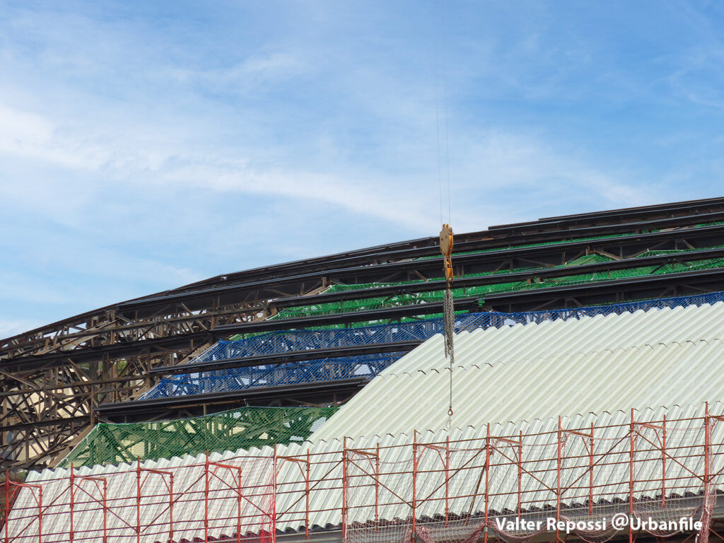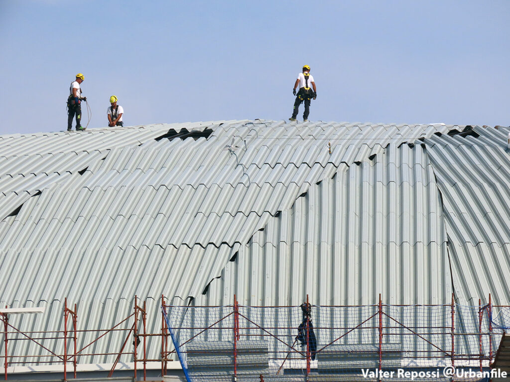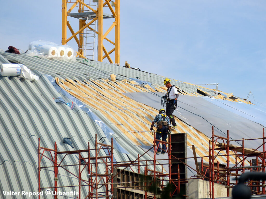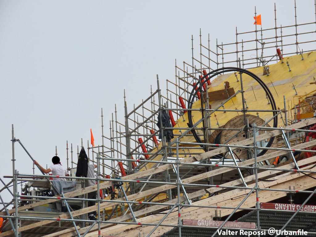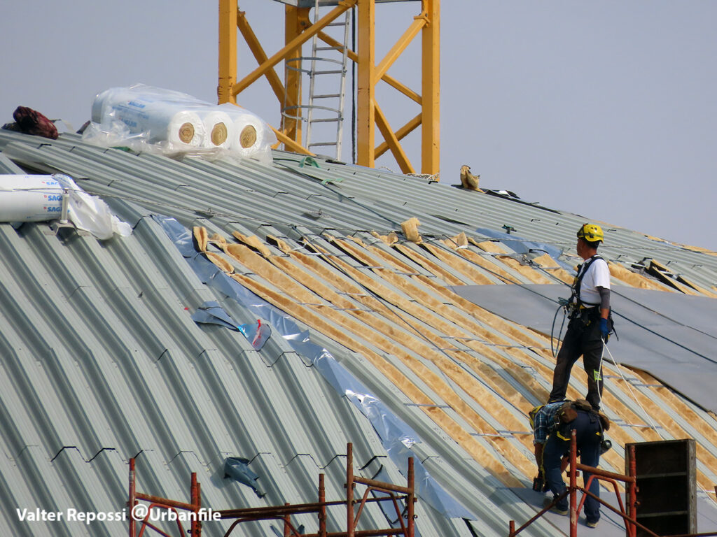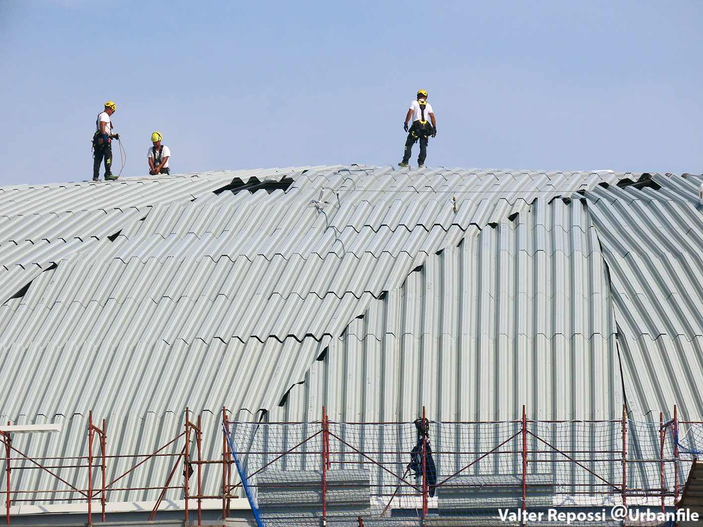 Dopo che la vecchia copertura della grande cupola del CityOval è stata completamente rimossa mostrando l’anima in acciaio della struttura ovale a fine luglio, ora è in fase di realizzazione la nuova copertura con pannelli ondulati nuovi di zecca.