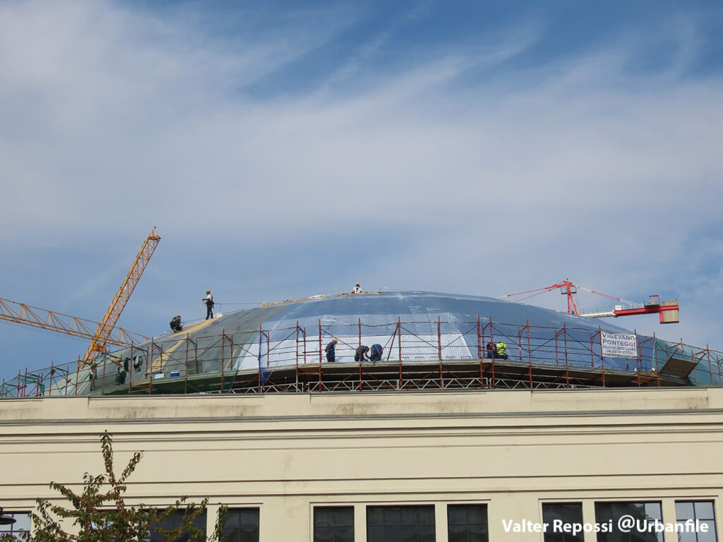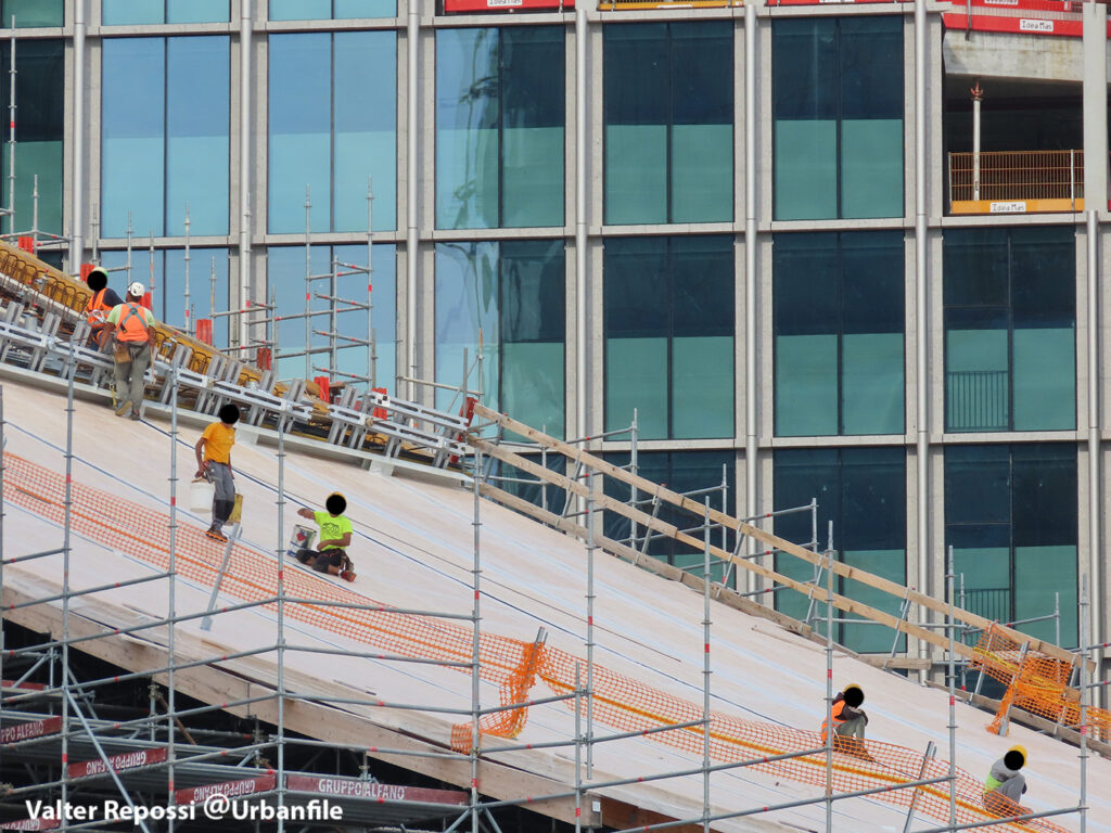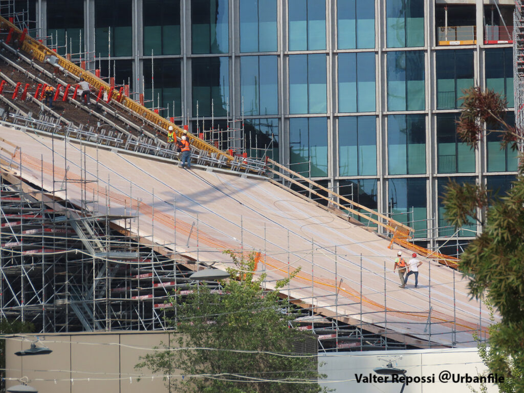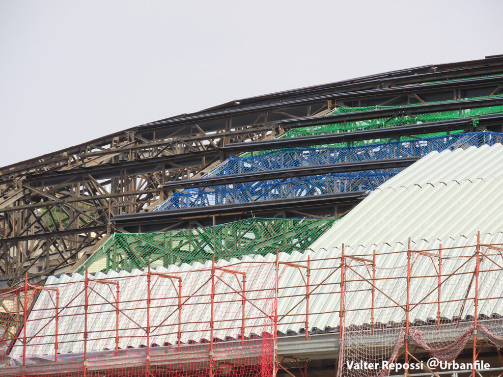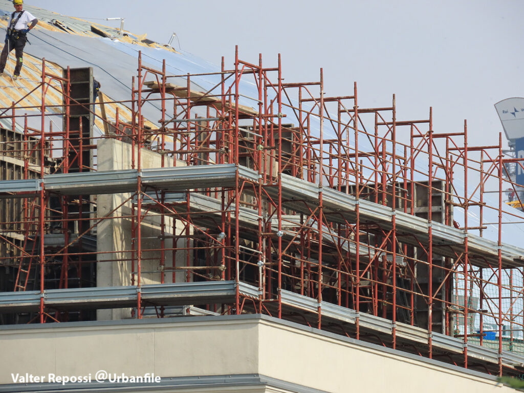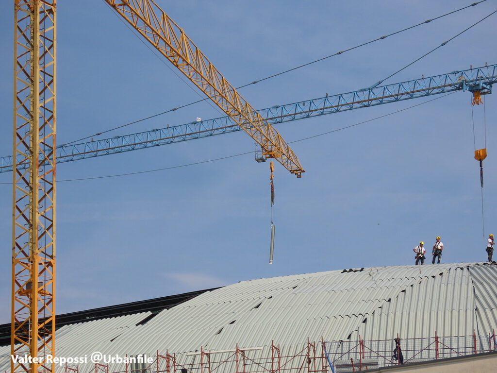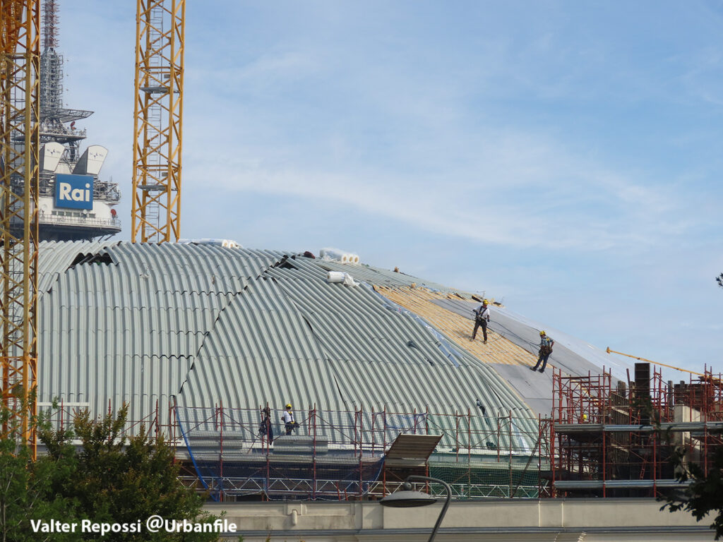 Dopo che la vecchia copertura della grande cupola del CityOval è stata completamente rimossa mostrando l’anima in acciaio della struttura ovale a fine luglio, ora è in fase di realizzazione la nuova copertura con pannelli ondulati nuovi di zecca.