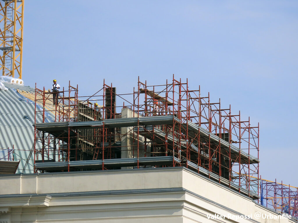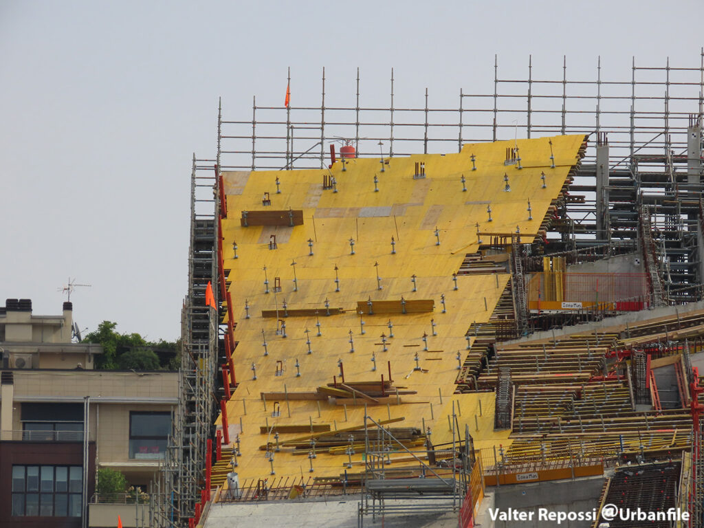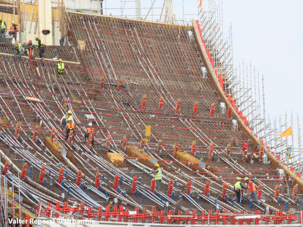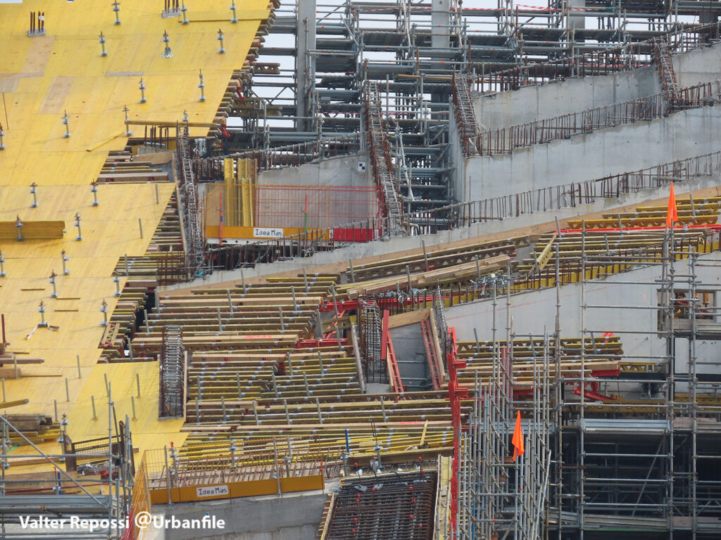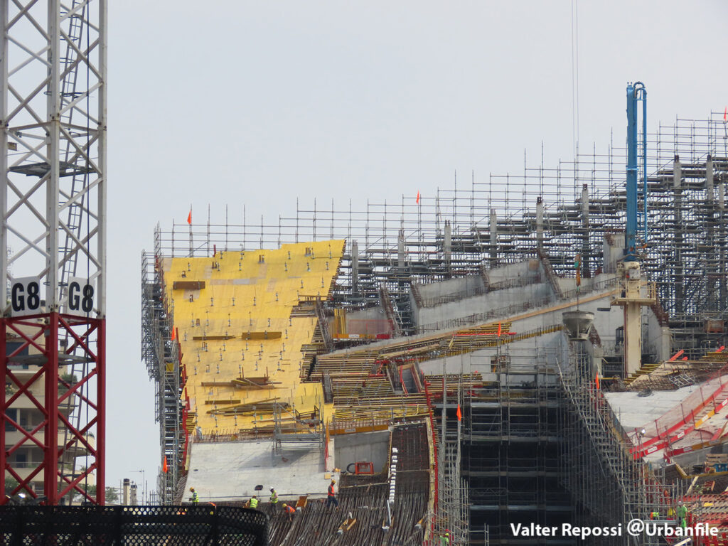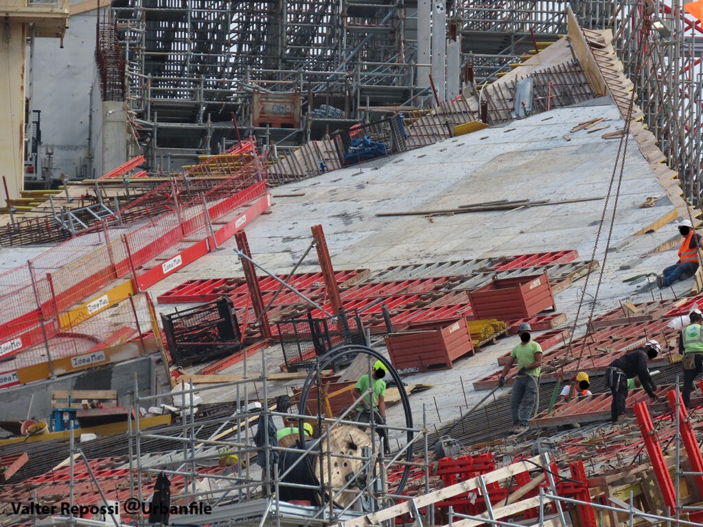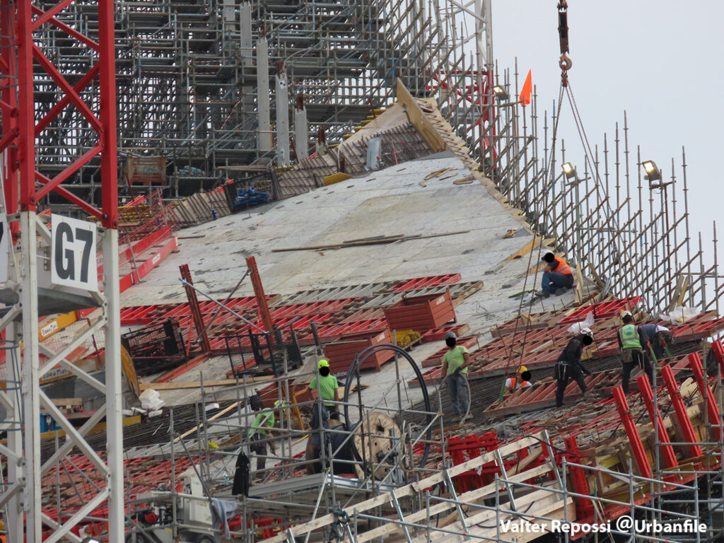 Spettacolari le foto che riguardano la copertura e la realizzazione del “canopy”, che mostrano l’intricata maglia metallica e di tiranti che terranno assieme la struttura.