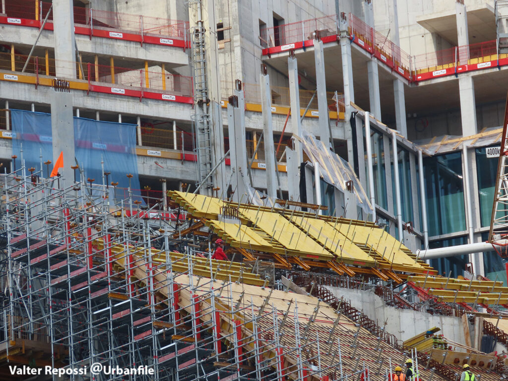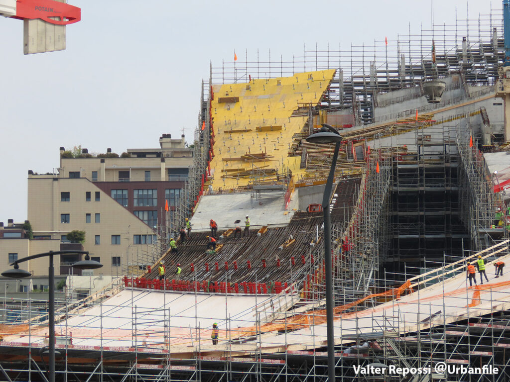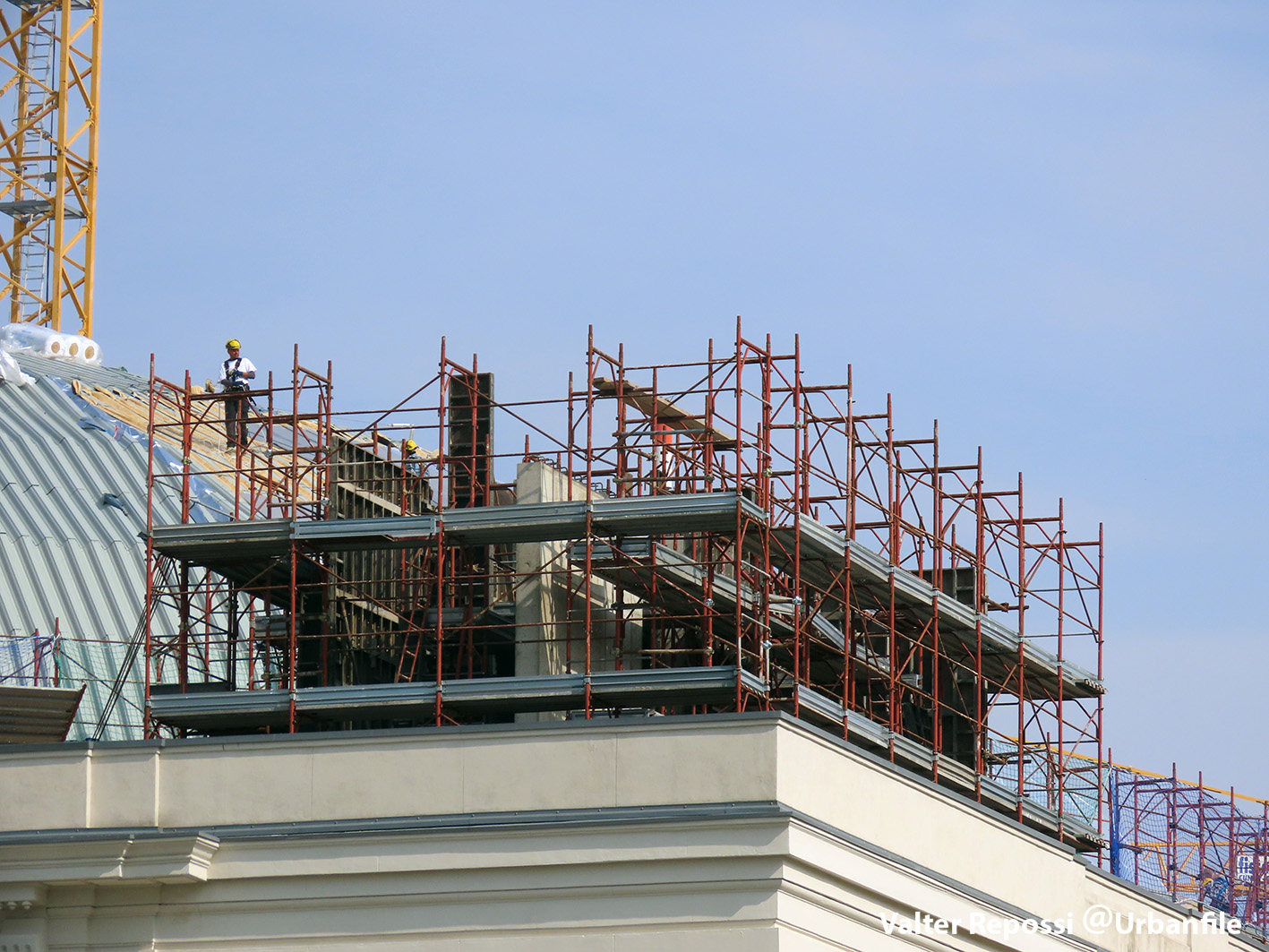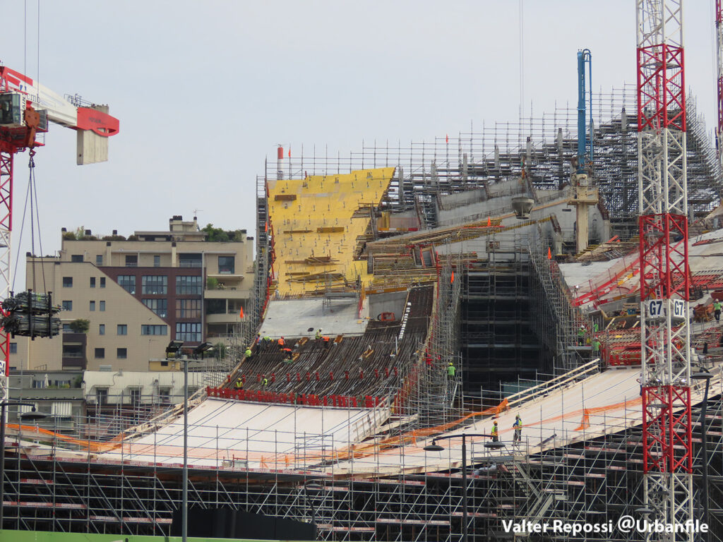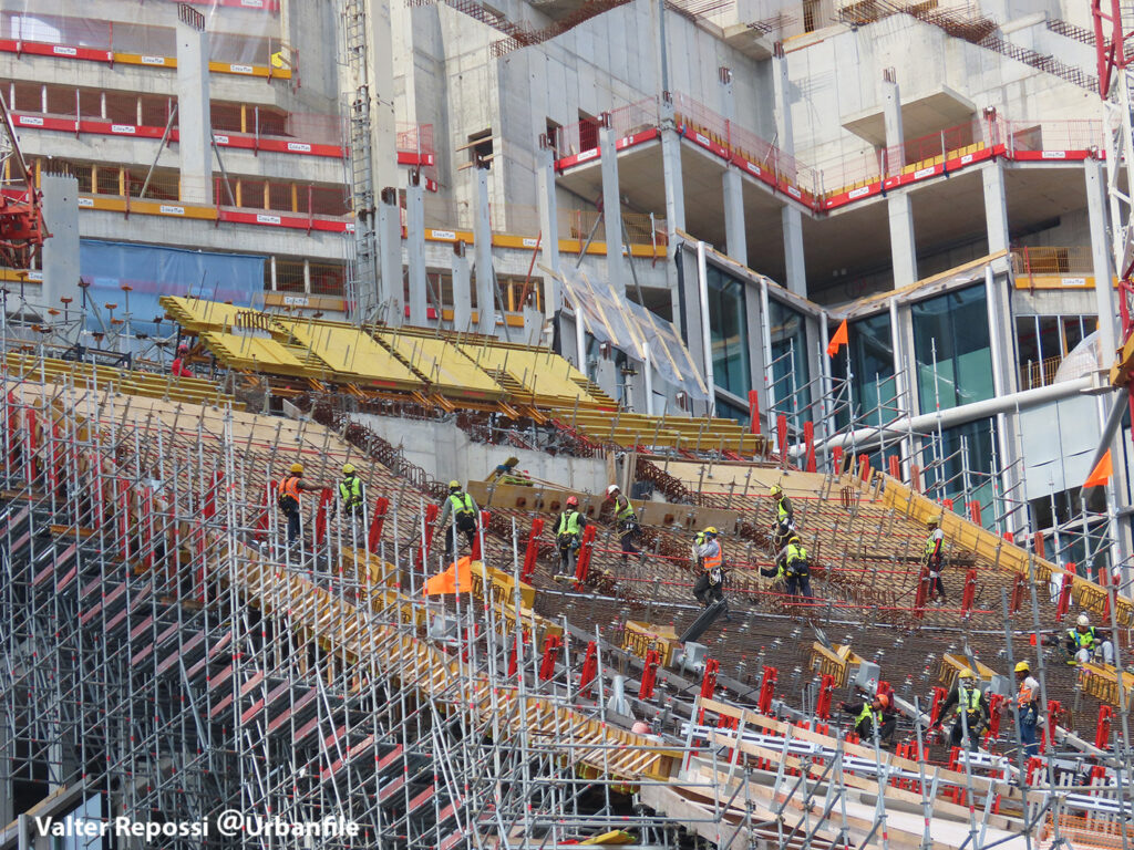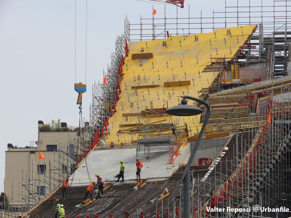 Spettacolari le foto che riguardano la copertura e la realizzazione del “canopy”, che mostrano l’intricata maglia metallica e di tiranti che terranno assieme la struttura.
