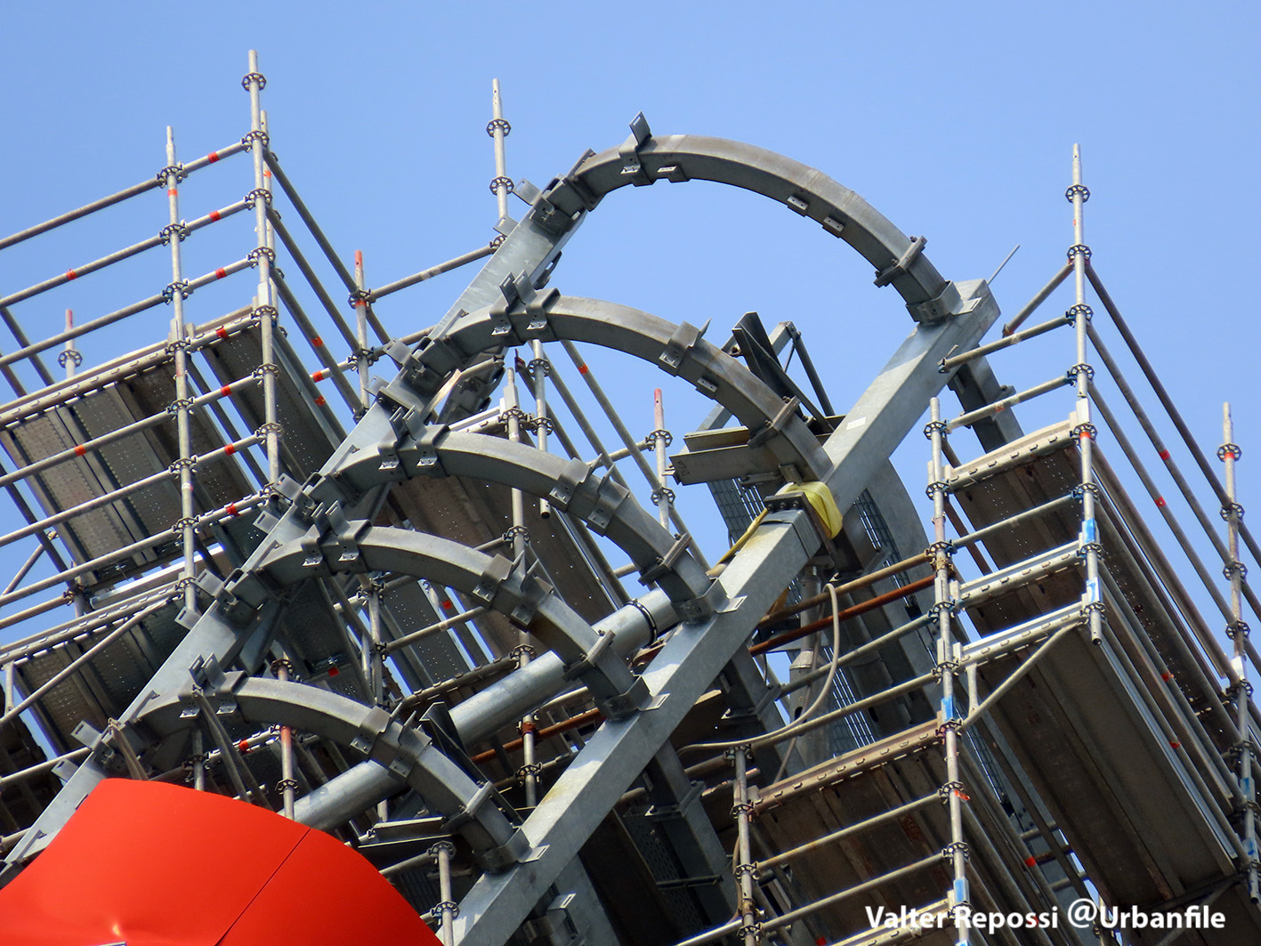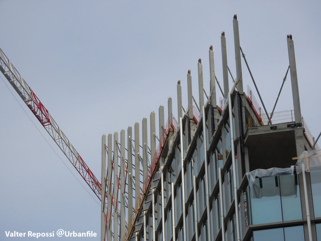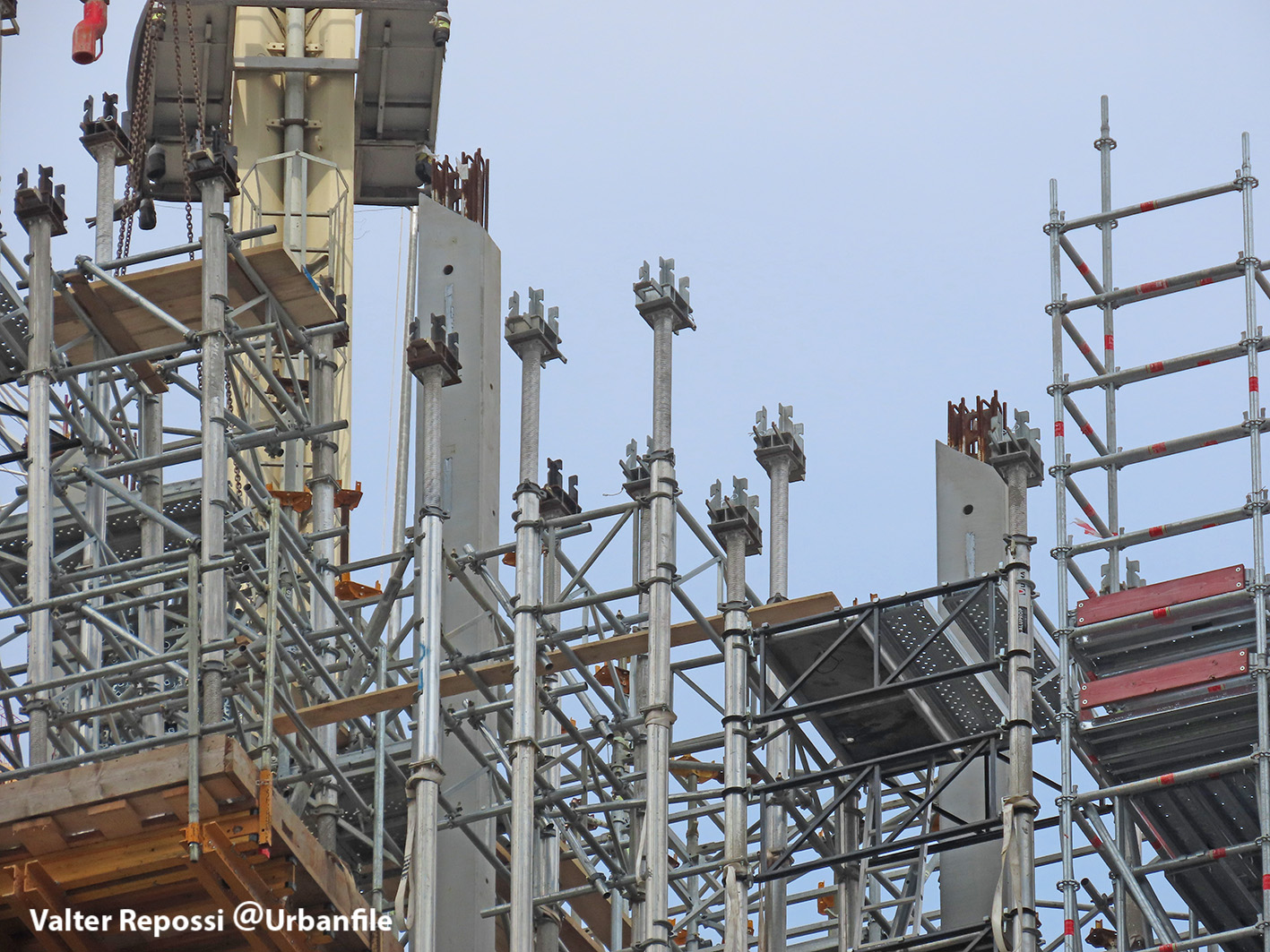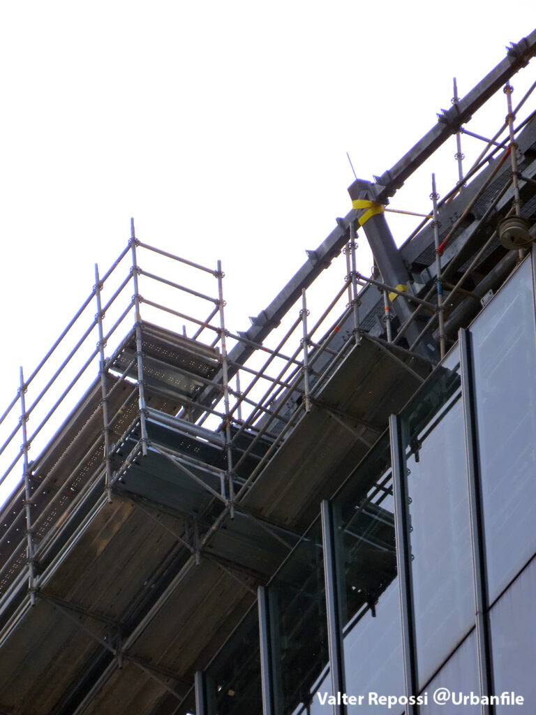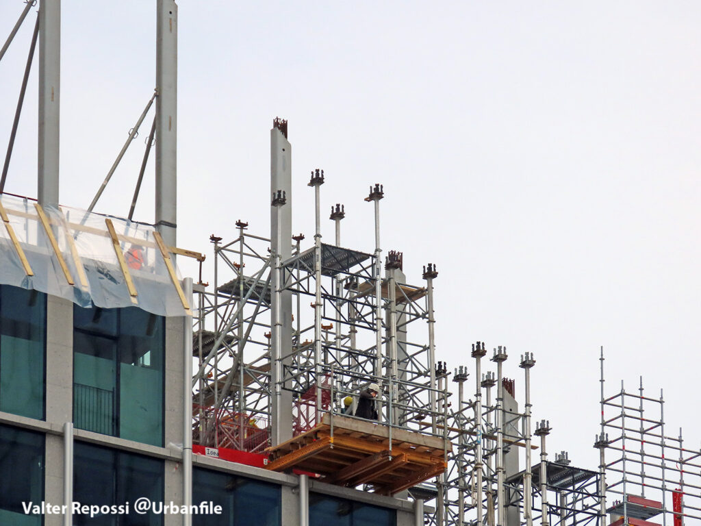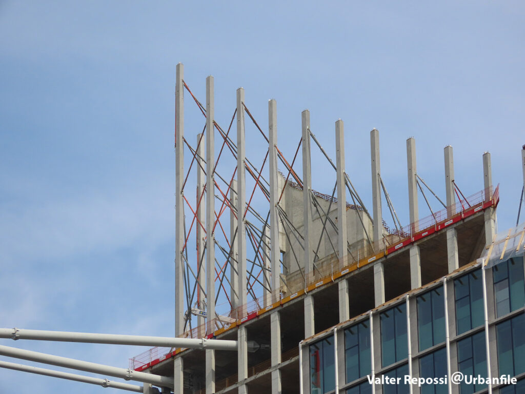 Anche nel cantiere di CityWave proseguono i lavori, oltre al montaggio delle vetrate delle facciate, anche quelli per completare la struttura che servirà a realizzare l’incredibile e complessa tettoia (canopy) che come un “telo” unirà le due torri del nuovo edificio per uffici in realizzazione verso largo Domodossola.