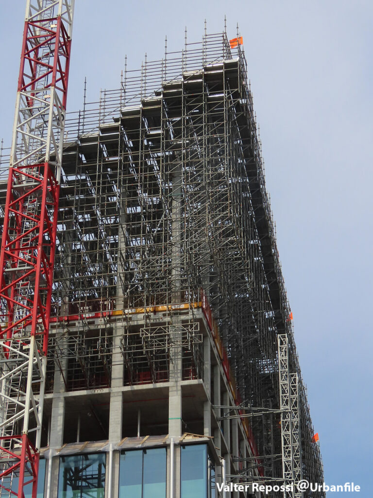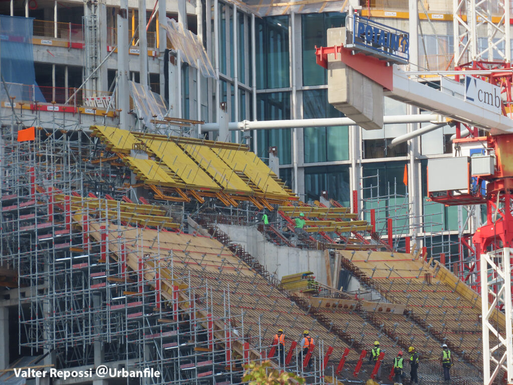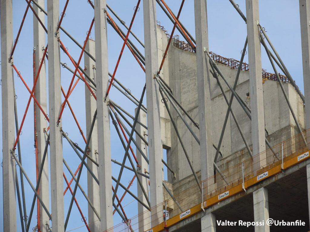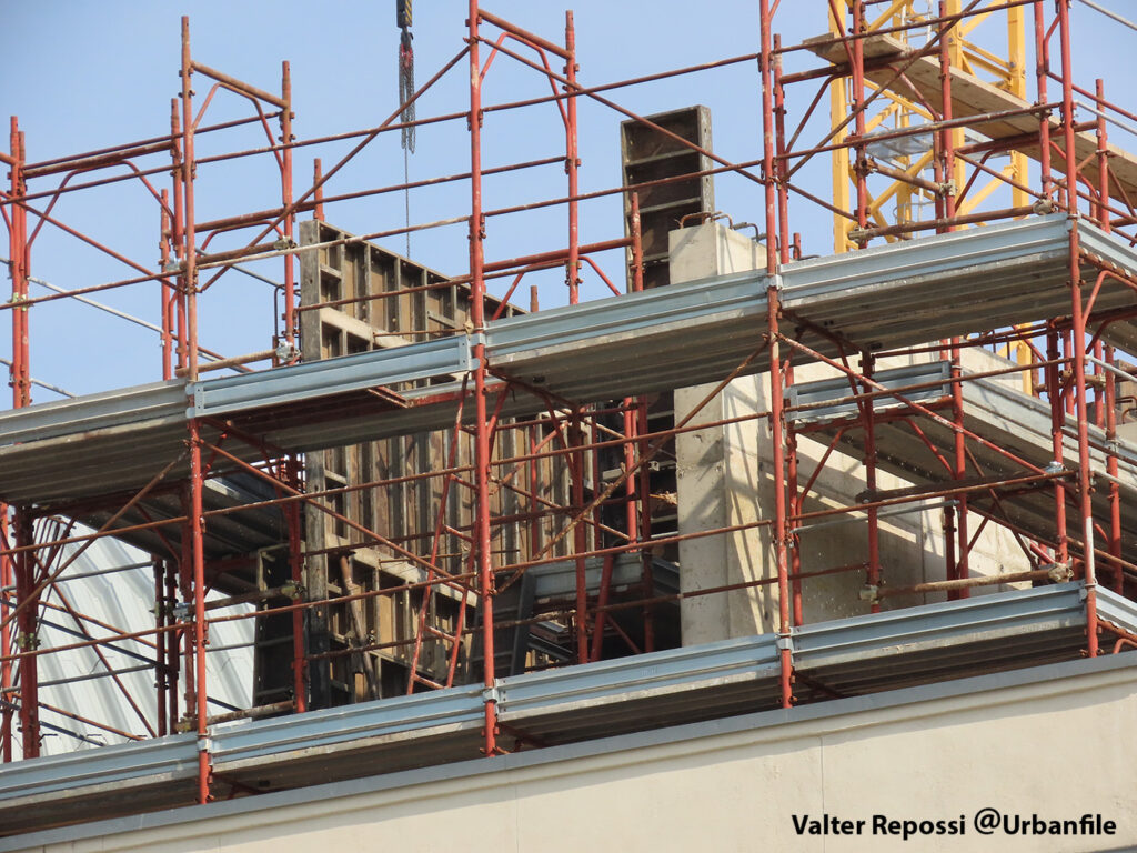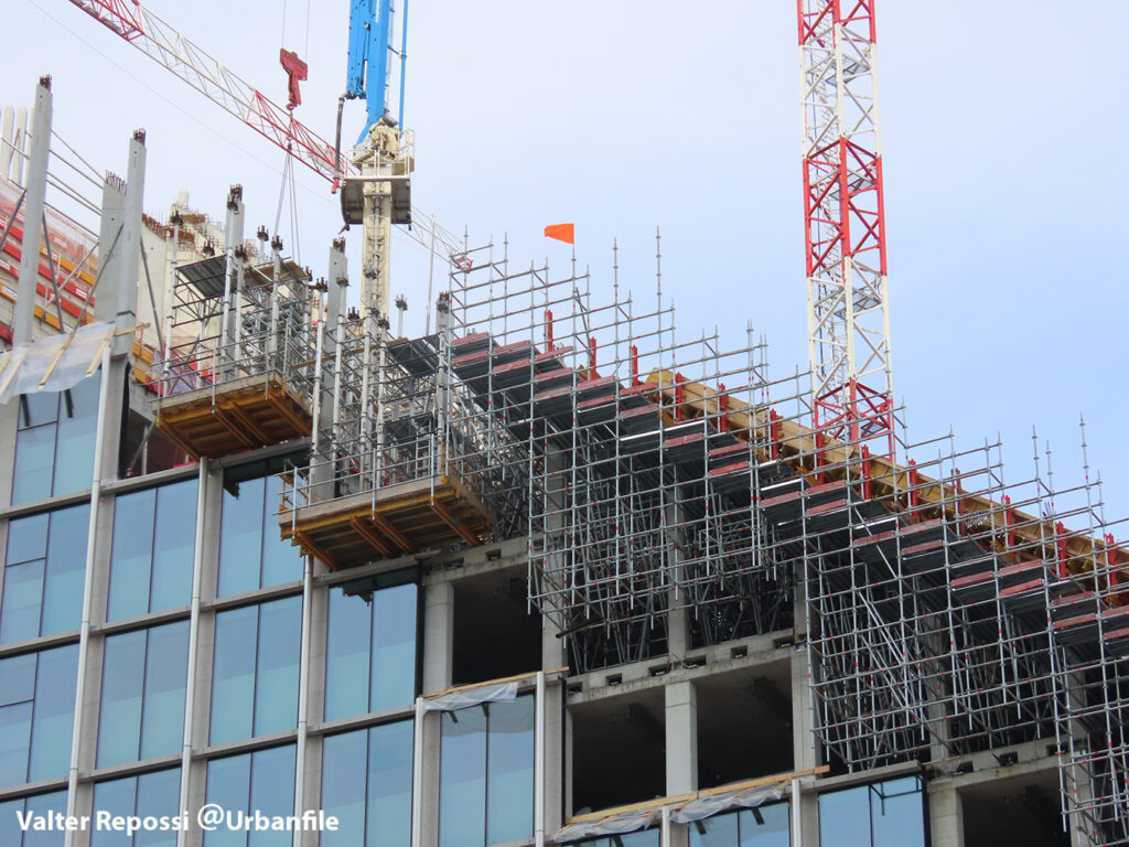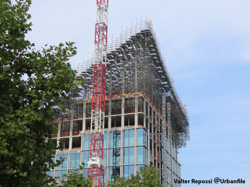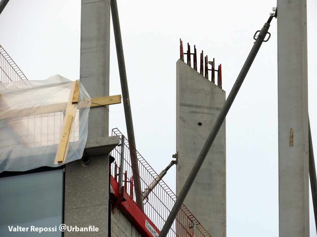 Anche nel cantiere di CityWave proseguono i lavori, oltre al montaggio delle vetrate delle facciate, anche quelli per completare la struttura che servirà a realizzare l’incredibile e complessa tettoia (canopy) che come un “telo” unirà le due torri del nuovo edificio per uffici in realizzazione verso largo Domodossola.