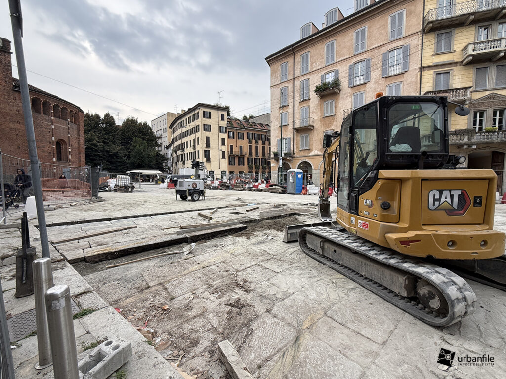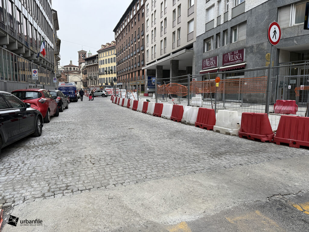 Proseguiamo giungendo in Largo Francesco Richini, dove proseguono i lavori di livellatura della vecchia pavimentazione (sollevata all’altezza dei marciapiedi) e il completamento dei lavori di abbellimento in pietra alle aree in precedenza pavimentate in asfalto. E’ stato creato anche un bel foro verso il vicolo di Santa Caterina pronto ad ospitare una nuova alberatura.