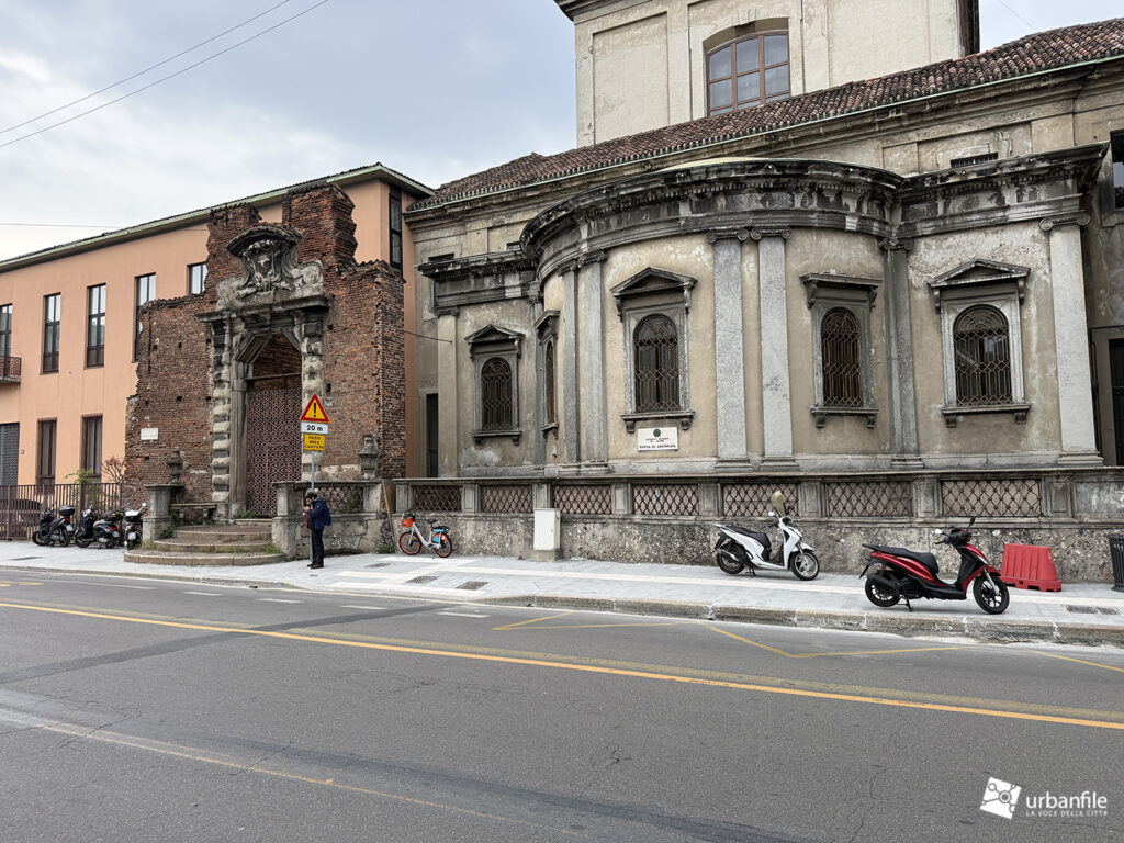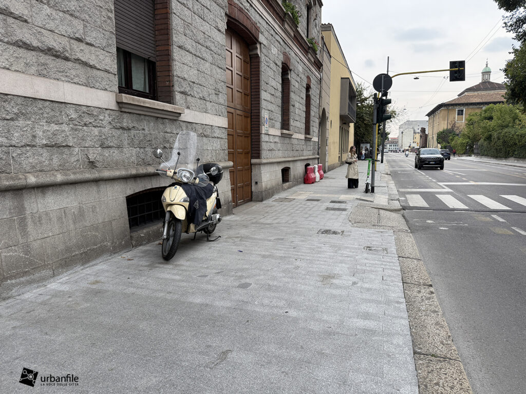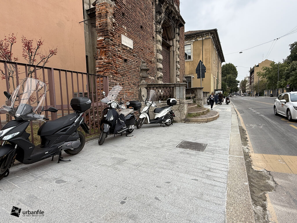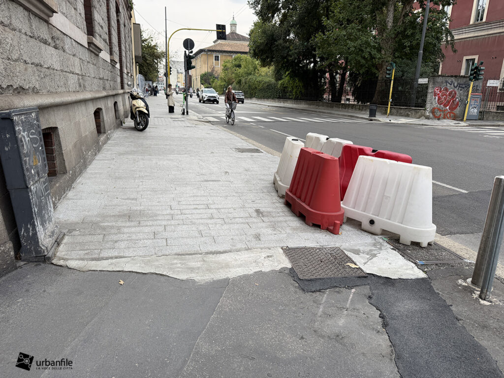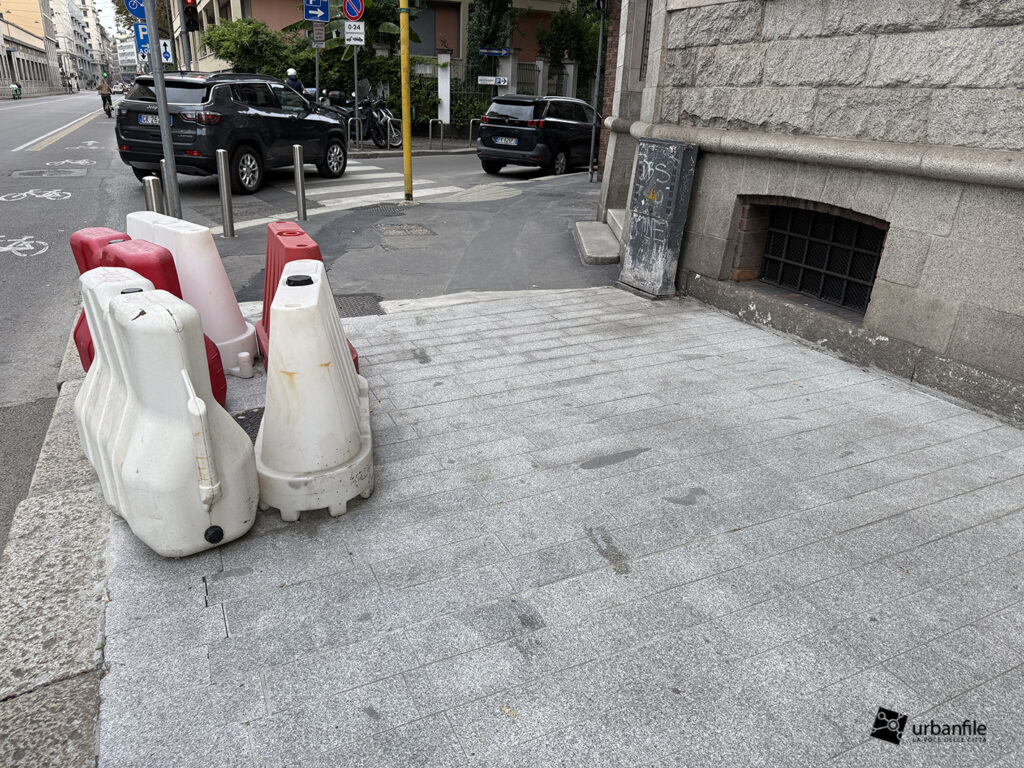 Ed ecco l’area pedoanle che si trova dove sono state realizzate le uscite della stazione M4 Sforza Policlinico. Sappiamo che gli edifici ai civici 44 e 46 di via Francesco Sforza sono privati, quindi spetterebbe a loro “decorare le enormi pareti cieche, ma non è brutto vedere quei muri privi di decoro? Almeno ci fosse quel po’ di alberature che mitigassero la presenza.Sperando magari nella costruzione di un bel edificio quando ripareranno e restaureranno l’ex obitorio del Policlinico.