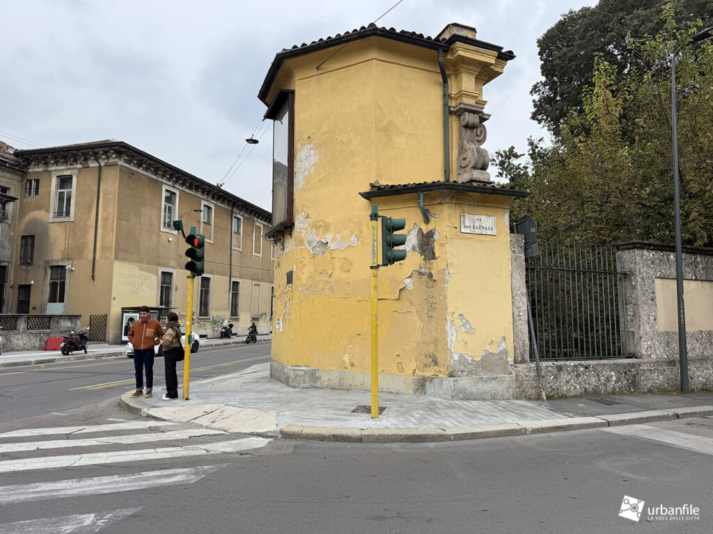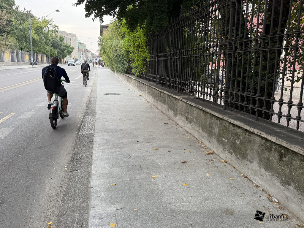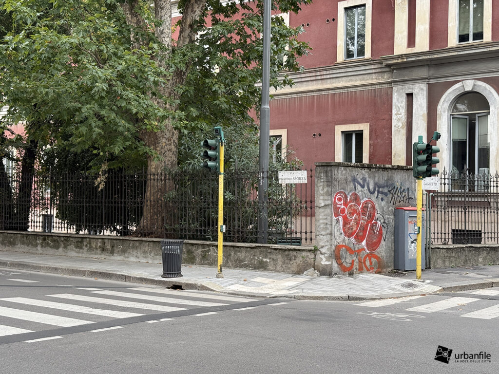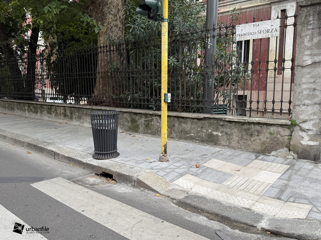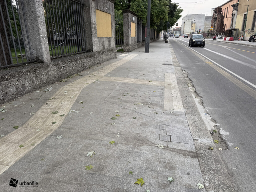 Ed ecco l’area pedoanle che si trova dove sono state realizzate le uscite della stazione M4 Sforza Policlinico. Sappiamo che gli edifici ai civici 44 e 46 di via Francesco Sforza sono privati, quindi spetterebbe a loro “decorare le enormi pareti cieche, ma non è brutto vedere quei muri privi di decoro? Almeno ci fosse quel po’ di alberature che mitigassero la presenza.Sperando magari nella costruzione di un bel edificio quando ripareranno e restaureranno l’ex obitorio del Policlinico.