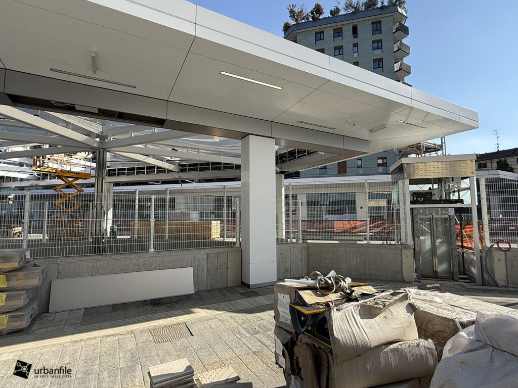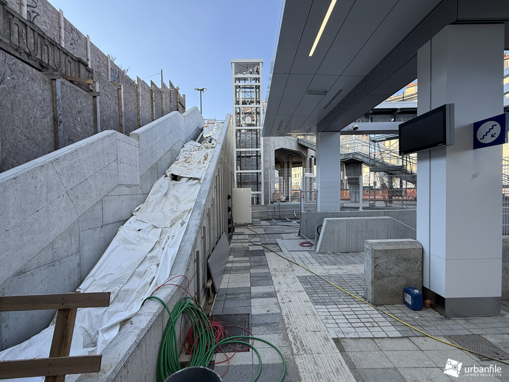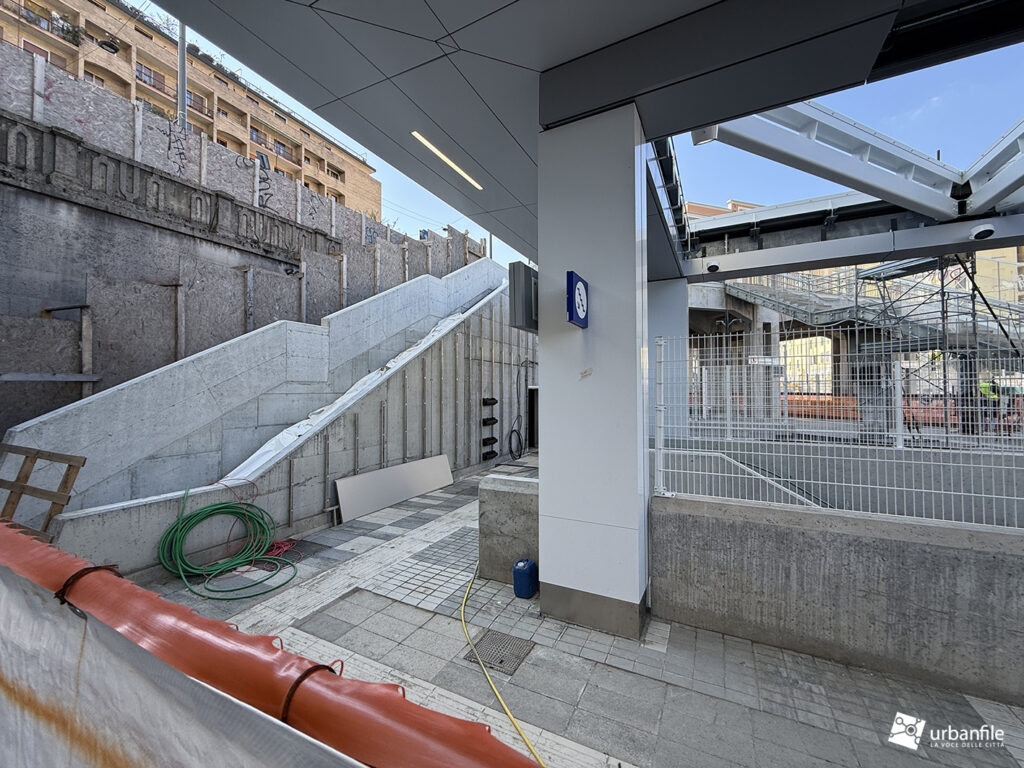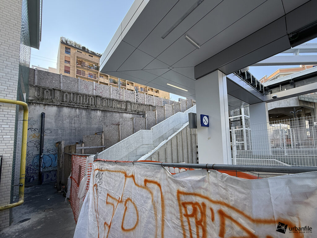 Siamo sempre in via Leo Longanesi dove è stata creata un’area più ampia per la stazione dove si trovano le scale che portano a Corso Lodi, che in questo punto sovrasta via Longanesi di almeno 5 metri. Scale storiche affiancate ora dalla rampa di scale mobili. In questo punto è stato anche realizzata una tettoia che copre anche le scale per accedere all’altro lato della banchina.