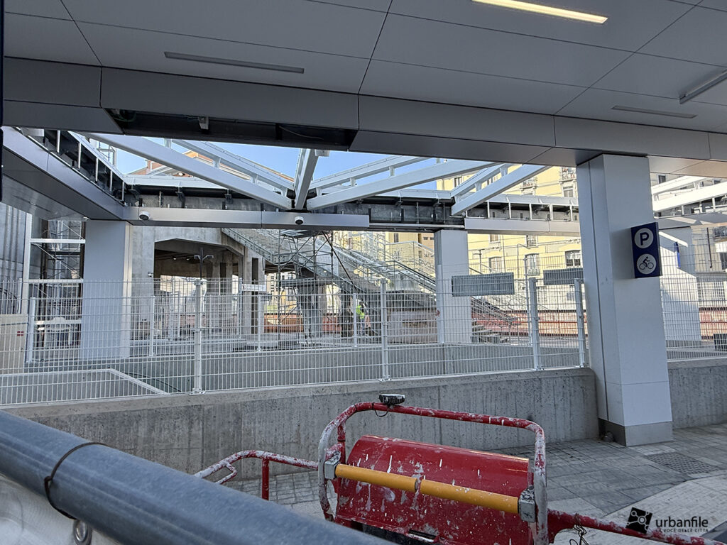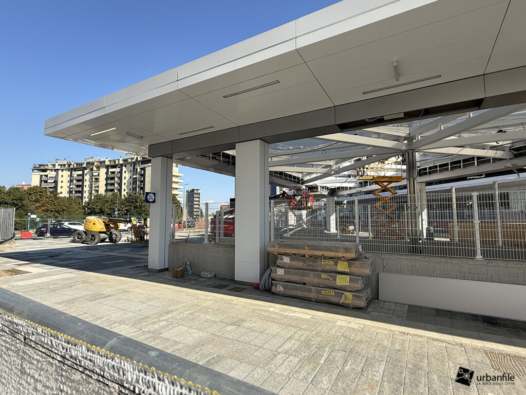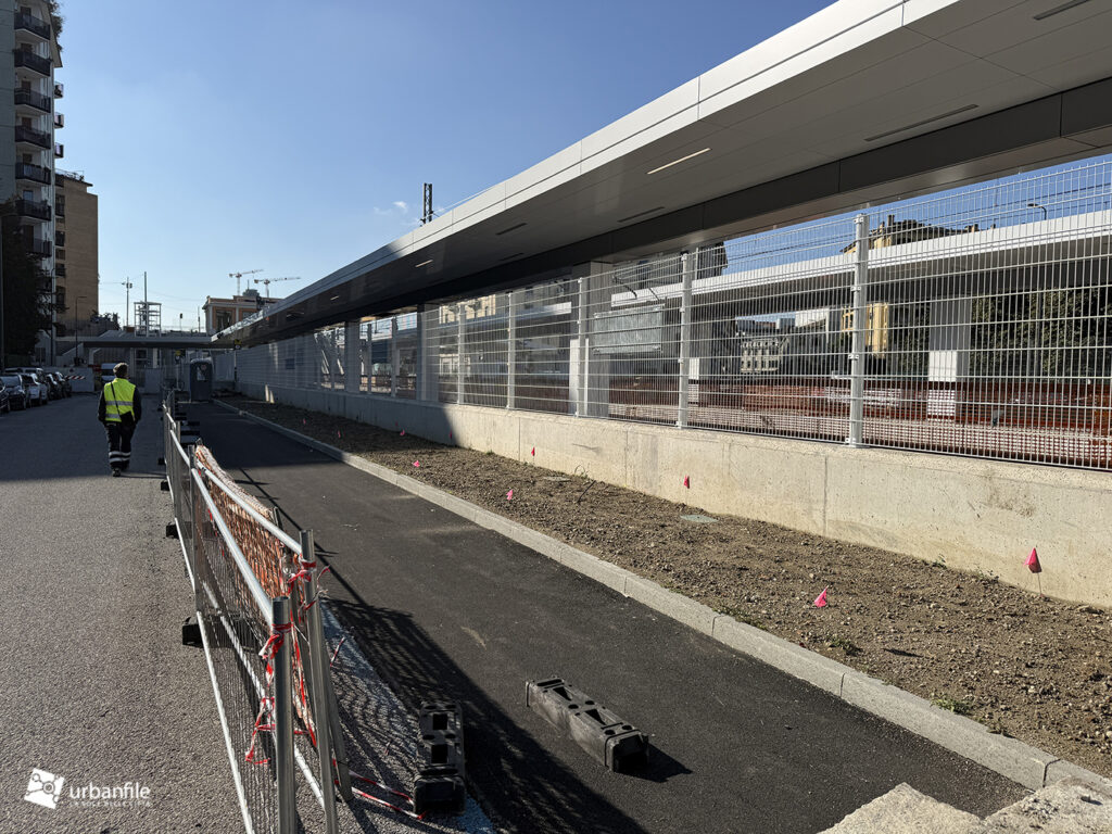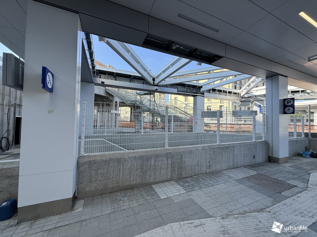 Siamo sempre in via Leo Longanesi dove è stata creata un’area più ampia per la stazione dove si trovano le scale che portano a Corso Lodi, che in questo punto sovrasta via Longanesi di almeno 5 metri. Scale storiche affiancate ora dalla rampa di scale mobili. In questo punto è stato anche realizzata una tettoia che copre anche le scale per accedere all’altro lato della banchina.