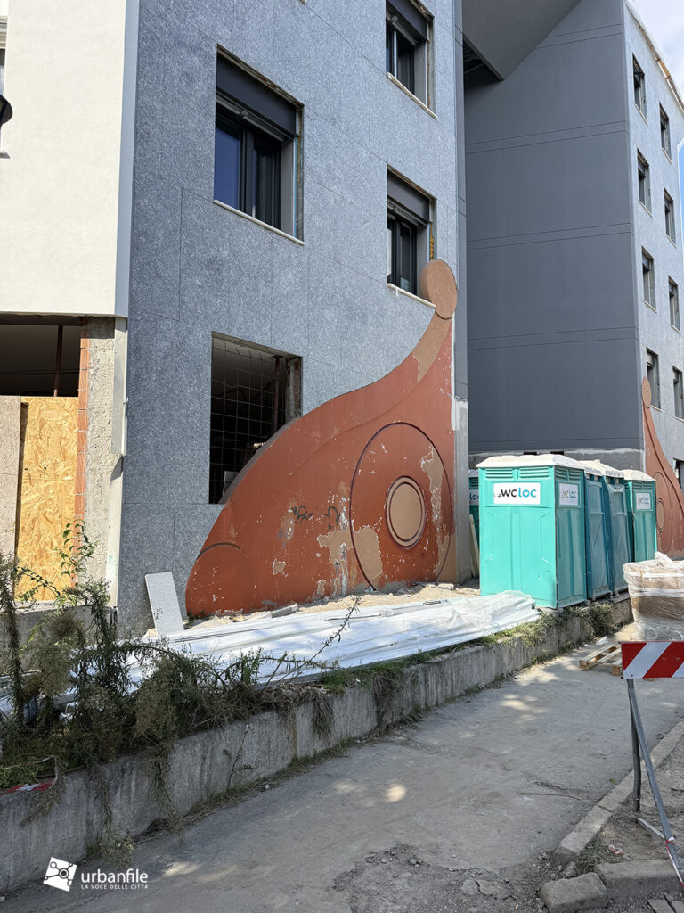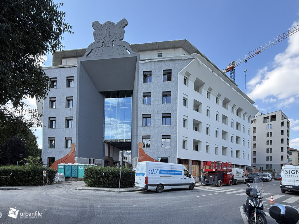 Cominciamo col più complesso e importante, quello di via Nizzoli 8, dove troviamo l’edificio simbolo dello stile post-moderno a Milano, quello dalla pianta semi ottagonale (solo cinque lati dell’ottagono sono stati presi in considerazione) e caratterizzato da un grande portale sormontato da due figure femminili che reggono un medaglione in stile greco-romano tutto realizzato in due dimensioni, classico esempio del postmoderno. Edificio per uffici realizzato nel 1981 su progetto di Nizzoliarchitettura (Arch. G. Mario Oliveri, Paolo Viola e Giusi Giuliani). Ora è in fase di riqualificazione e trasformazione per essere convertito in un complesso residenziale secondo un progetto di Asti Architetti.