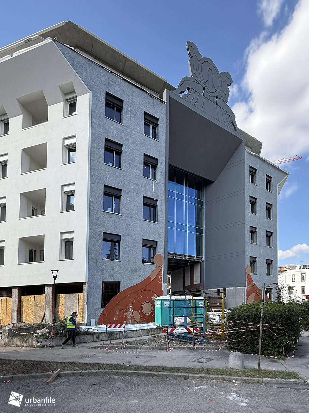 Cominciamo col più complesso e importante, quello di via Nizzoli 8, dove troviamo l’edificio simbolo dello stile post-moderno a Milano, quello dalla pianta semi ottagonale (solo cinque lati dell’ottagono sono stati presi in considerazione) e caratterizzato da un grande portale sormontato da due figure femminili che reggono un medaglione in stile greco-romano tutto realizzato in due dimensioni, classico esempio del postmoderno. Edificio per uffici realizzato nel 1981 su progetto di Nizzoliarchitettura (Arch. G. Mario Oliveri, Paolo Viola e Giusi Giuliani). Ora è in fase di riqualificazione e trasformazione per essere convertito in un complesso residenziale secondo un progetto di Asti Architetti.
