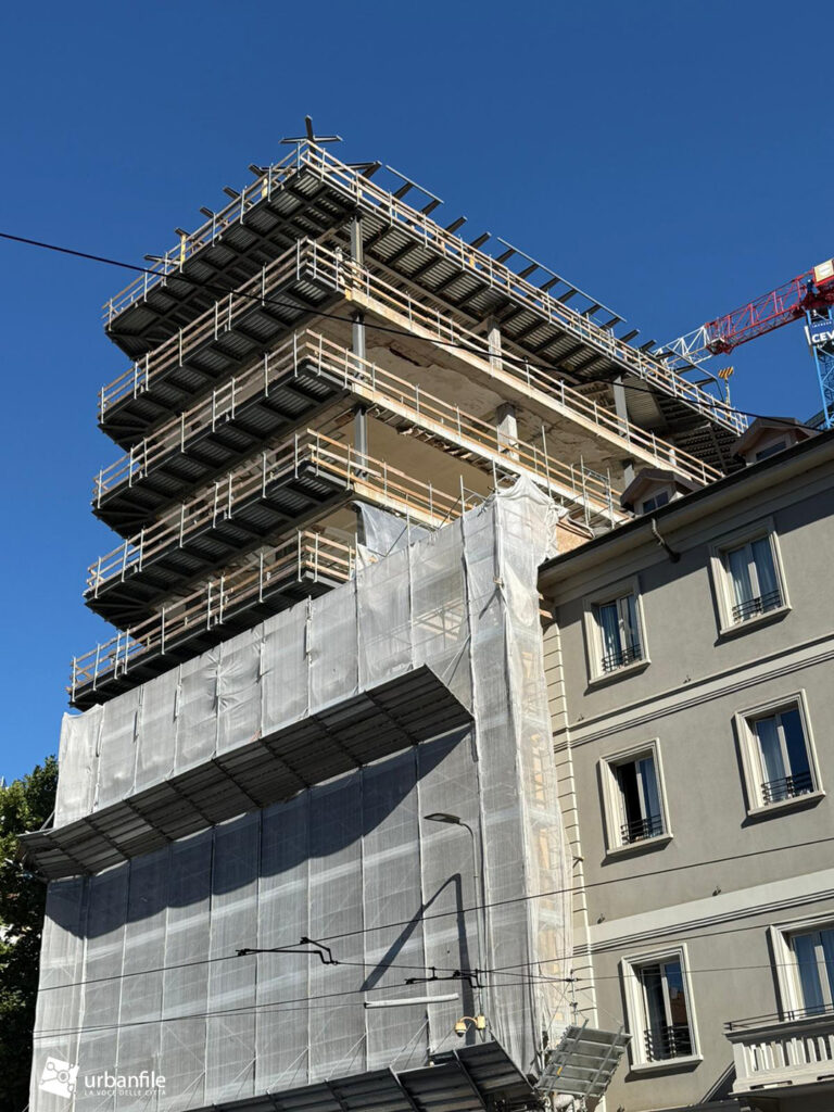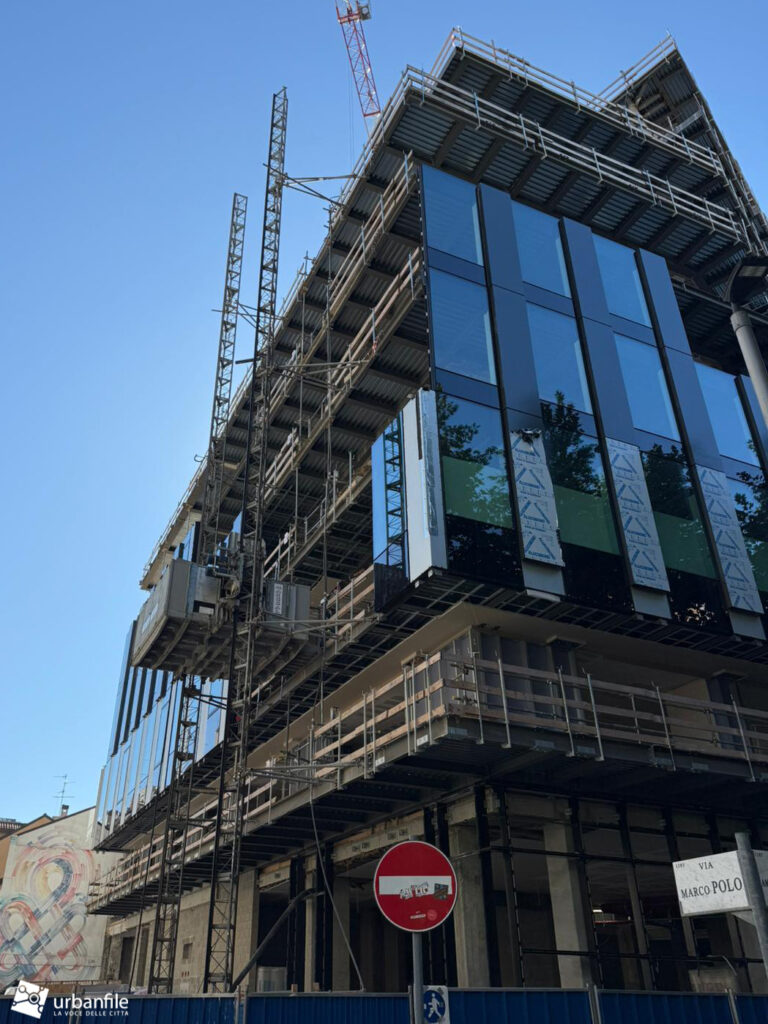 Prosegue il montaggio dei pannelli che formeranno le facciate (agganciate) al palazzo in riqualificazione di via Vespucci 2, Piazza Principessa Clotilde e via Marco Polo a Porta Nuova. Su via Marco Polo è stato aggiunto un piano, come si vede dalle foto a seguire.