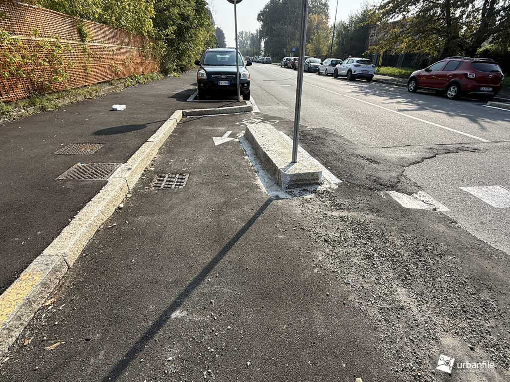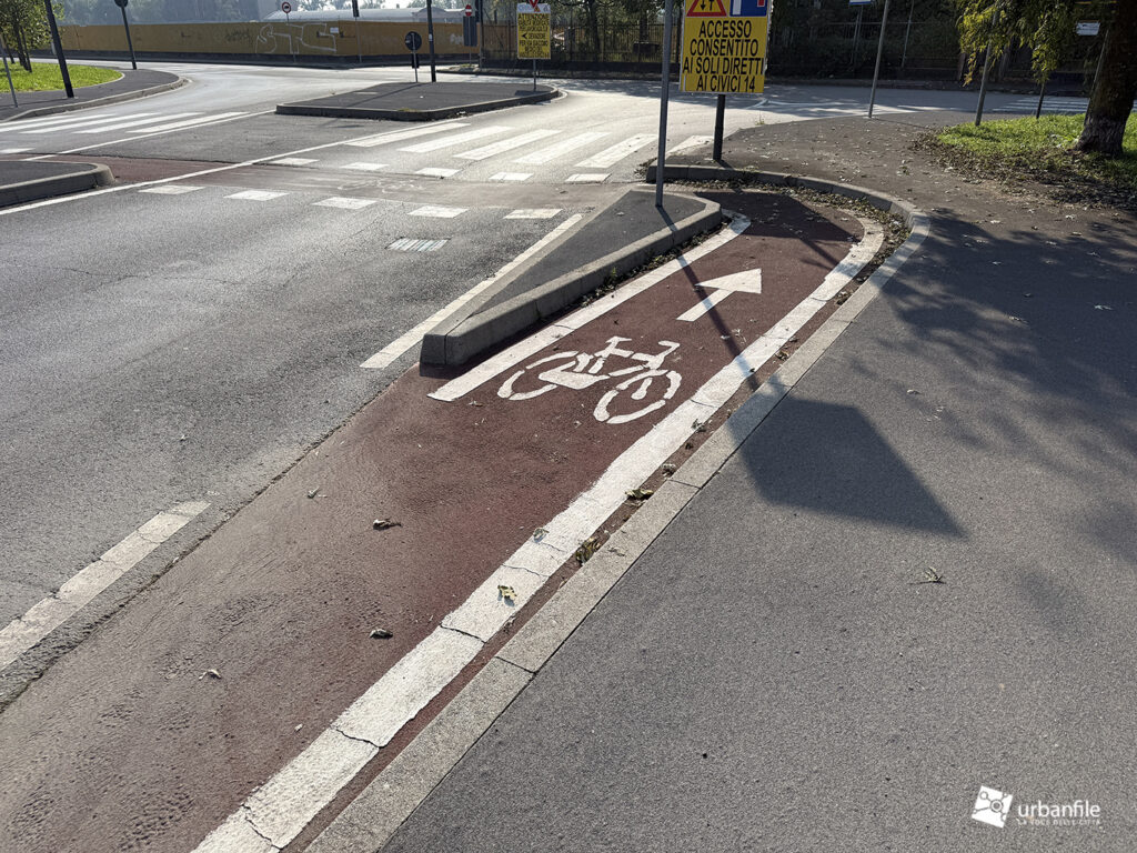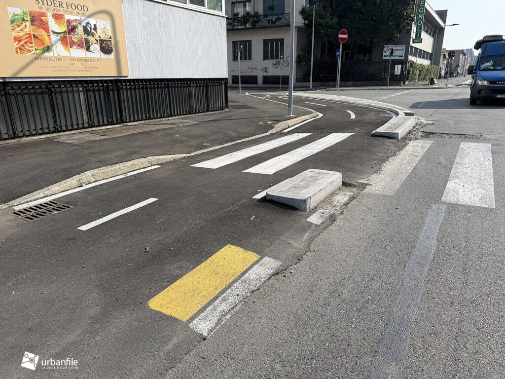 Ogni volta rimaniamo comunque perplessi di come, per ragioni di “sicurezza” le ciclabili dove si innestano in punti di attraversamento o come in questo caso con il termine della ciclabile protetta, venga adottato questo assurdo sistema di incanalazione che sicuramente non verrà MAI USATO da qualcuno, come succede negli altri esempi sparsi in città (chi si infila con la bicicletta in quel mini tratto per riprendere la corsa? Suvvia!)