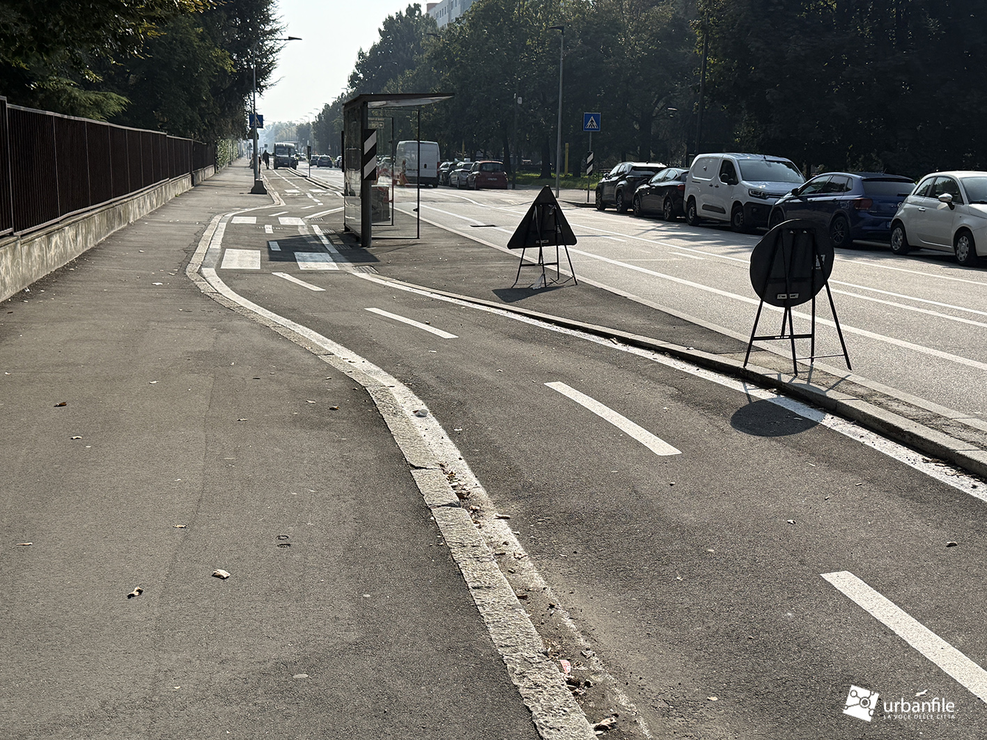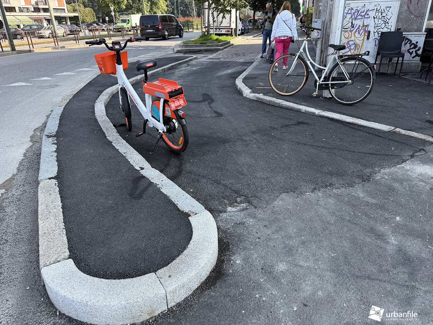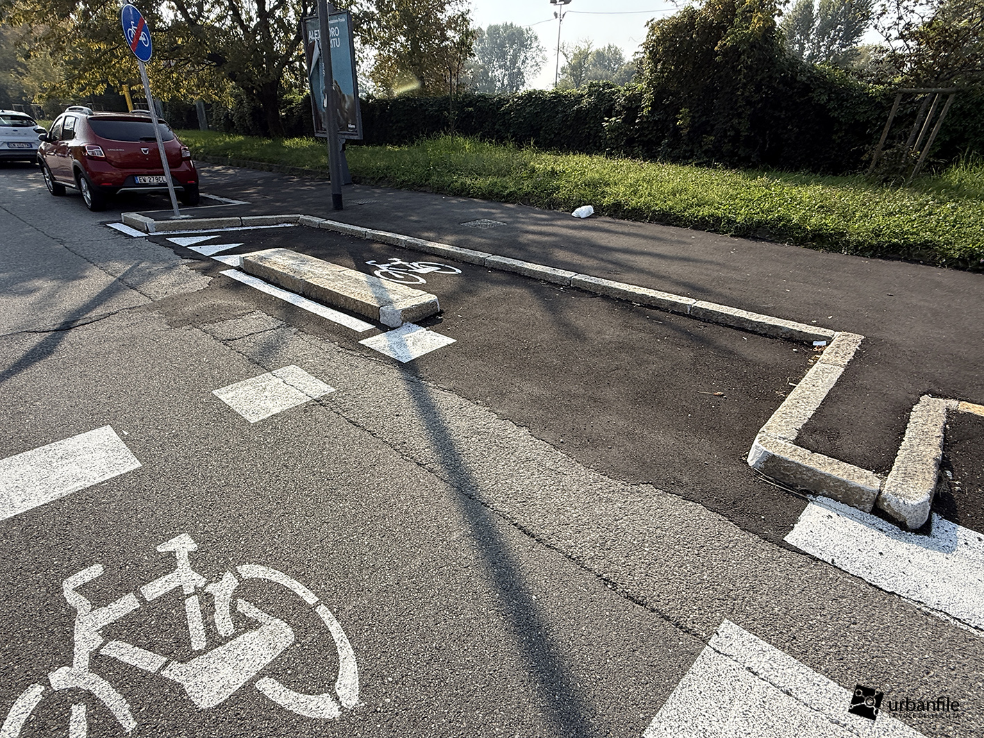Ogni volta rimaniamo comunque perplessi di come, per ragioni di “sicurezza” le ciclabili dove si innestano in punti di attraversamento o come in questo caso con il termine della ciclabile protetta, venga adottato questo assurdo sistema di incanalazione che sicuramente non verrà MAI USATO da qualcuno, come succede negli altri esempi sparsi in città (chi si infila con la bicicletta in quel mini tratto per riprendere la corsa? Suvvia!)