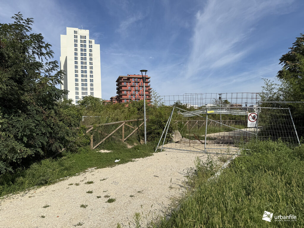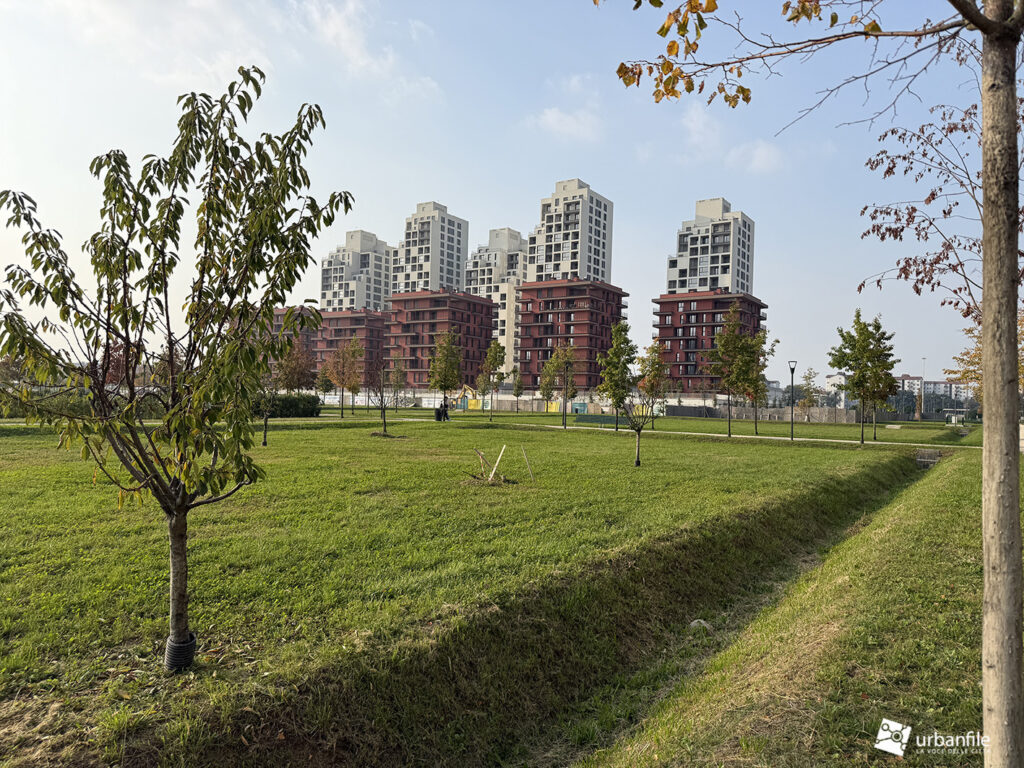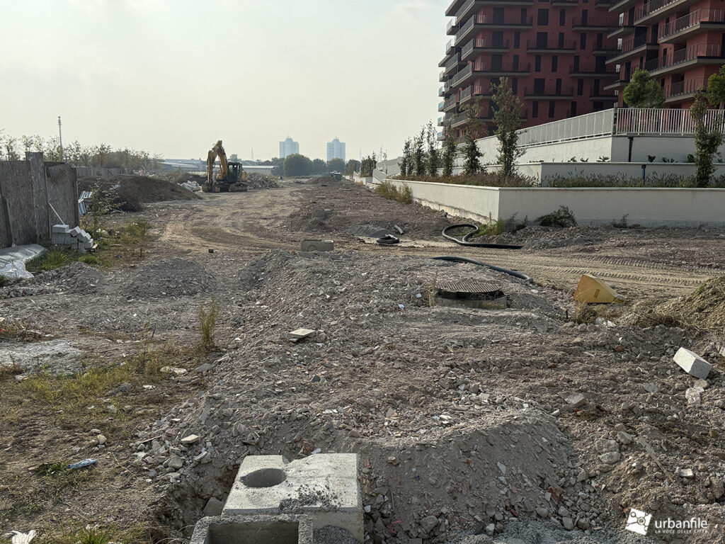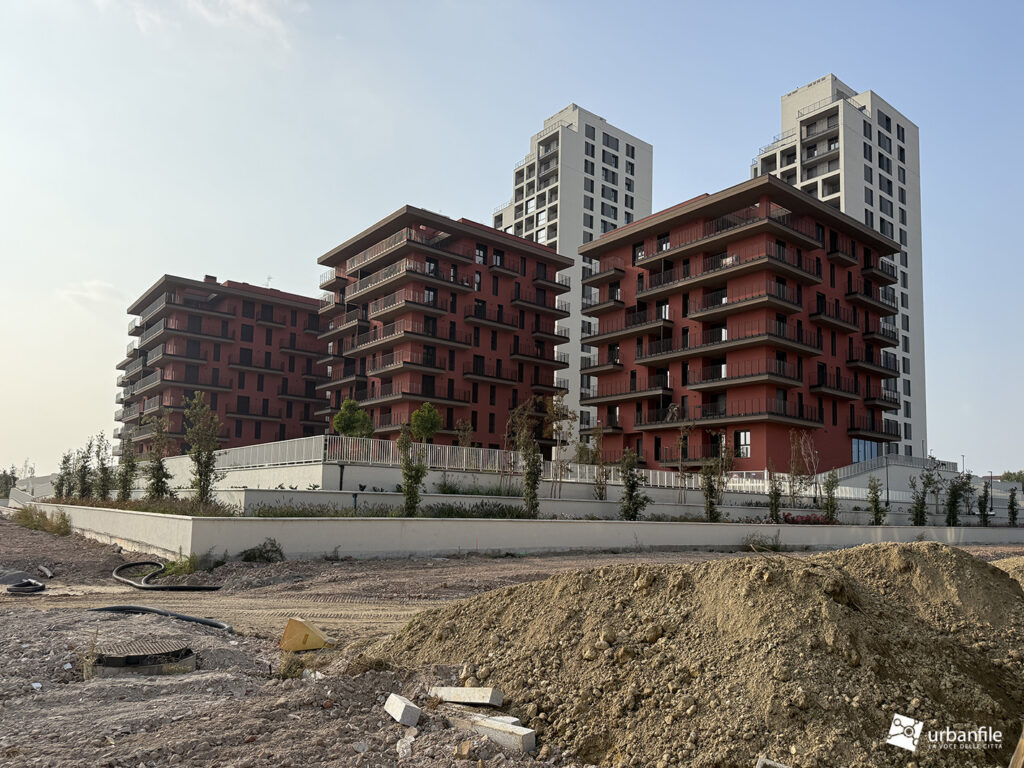 L’altra porzione da completare e ora in cantiere è quella che circonda le residenze (rosse e torri bianche) di via Calchi Taeggi.