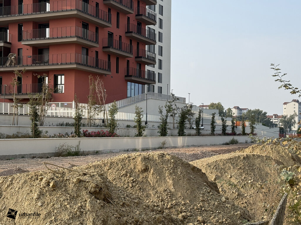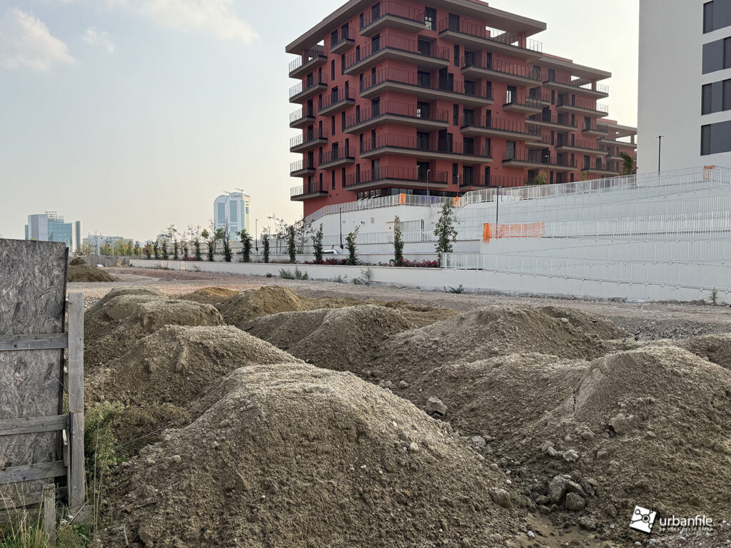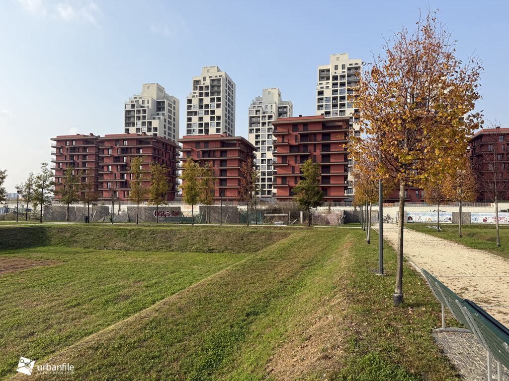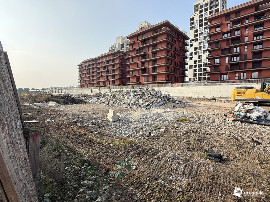 Ottobre 2025. Mentre la porzione di parco aperto ai cittadini si tinge di colori caldi autunnali, il cantiere per il completamento del nuovo parco prosegue e inizia a delinearsi anche verso via Calchi Taeggi. Siamo nel nuovo quaritere di SeiMilano a Sella Nuova (m1 Bisceglie).