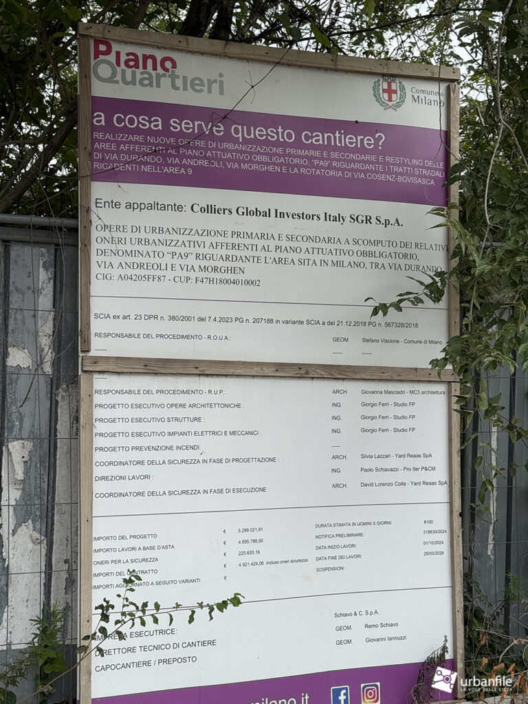 All’incrocio tra via Bovisasca e via Enrico Cosenz è stato allestito un cantiere per la realizzazione di una nuova rotatoria e la sistemazione a verde dell’area adiacente. L’intervento prevede la costruzione di nuove opere di urbanizzazione primaria e secondaria, oltre alla riqualificazione delle aree comprese nel piano attuativo obbligatorio “PA9”. Il progetto interessa i tratti stradali di via Durando, via Andreoli, via Morghen e, appunto, la futura rotatoria tra via Cosenz e via Bovisasca, all’interno del Municipio 9. Ente appaltante: Colliers Global Investors Italy SGR S.p.A.