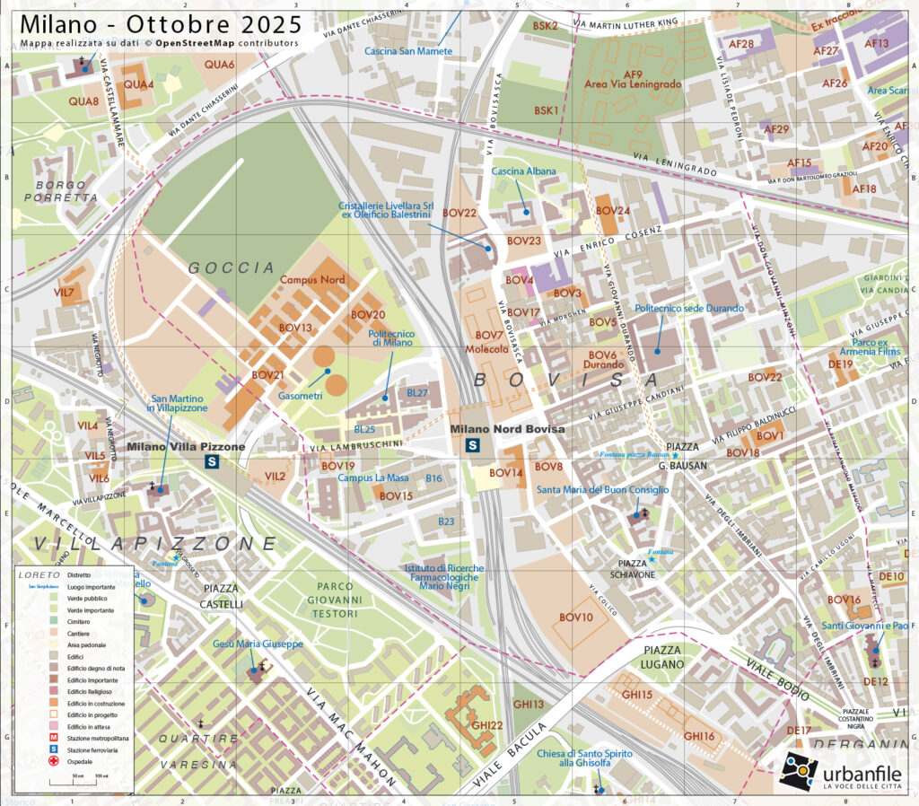 - Bovisa, via Arrivabene, PA Architettura, Borio Mangiarotti, Piazzale Lugano, Piazza Schiavone, via degli Imbriani, via Angelo del Bon, Politecnico di Milano, Goccia, Campus Politecnico, Renzo Piano Building Workshop: RPBW Architects, Studentato, Beretta Associati, via Bellagio, piazza Alfieri