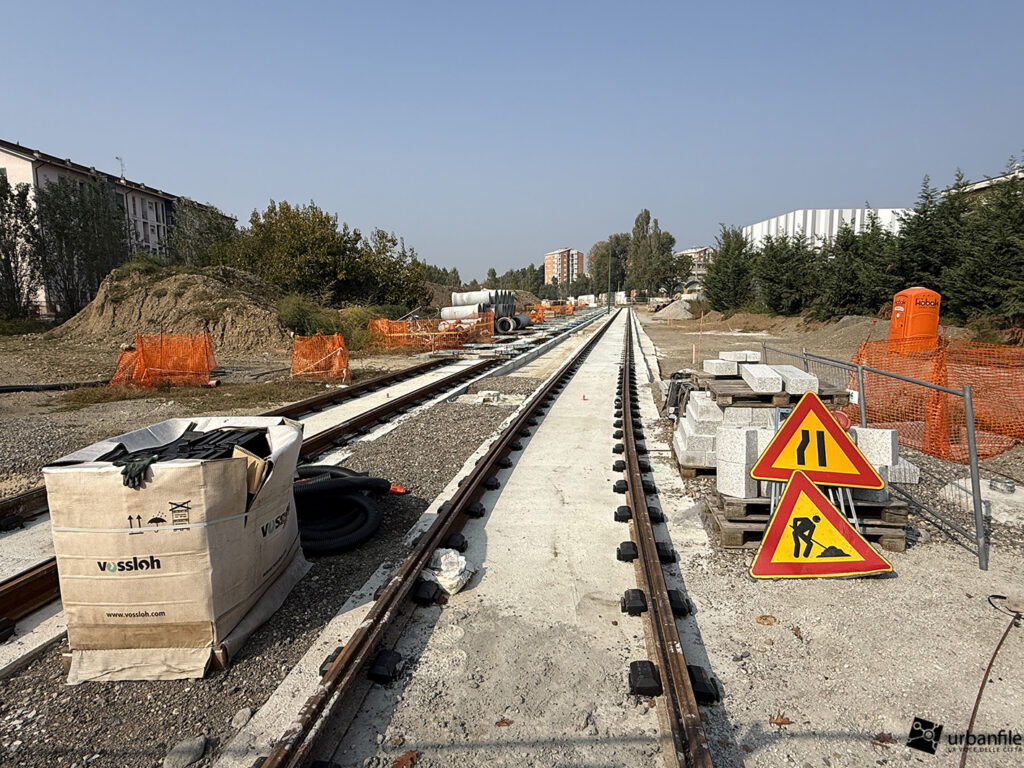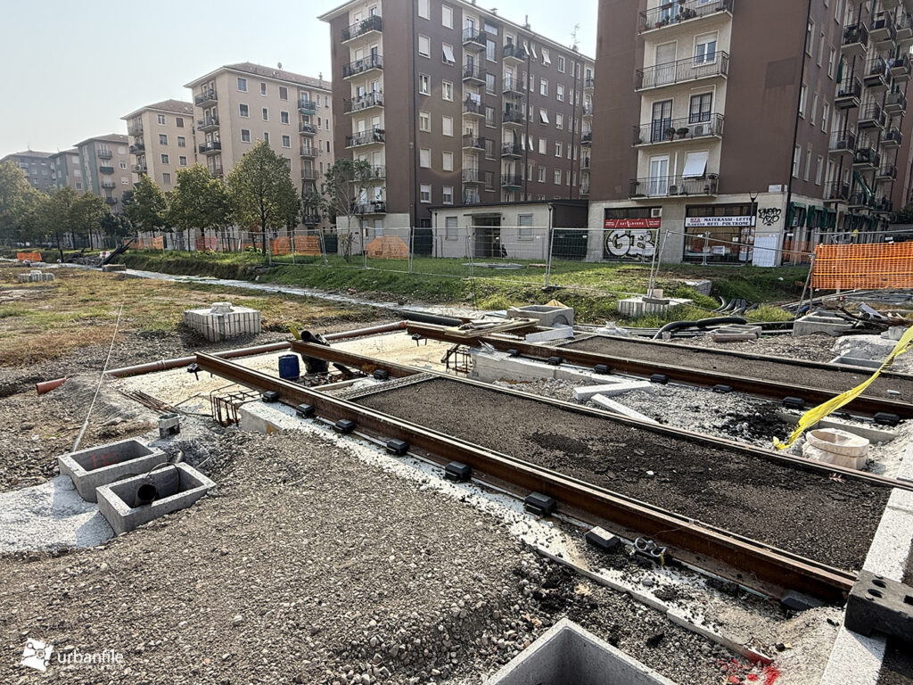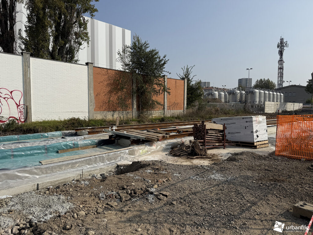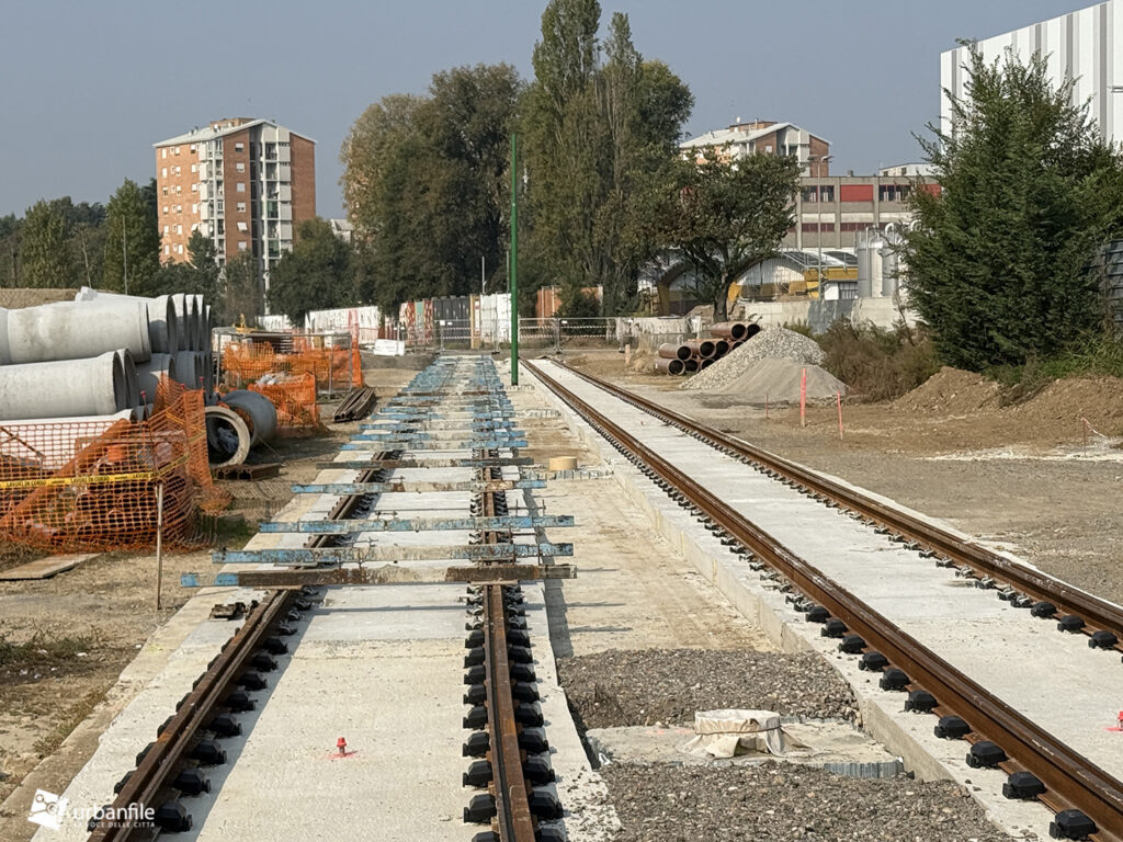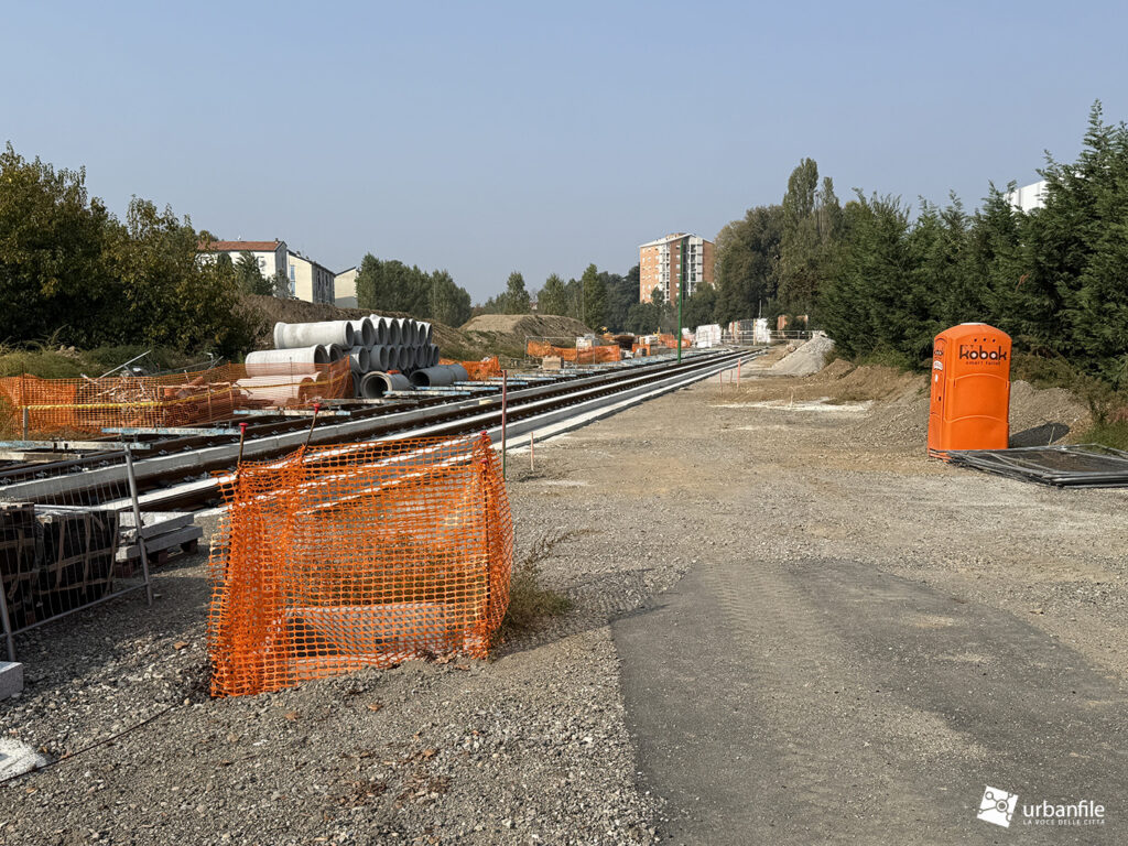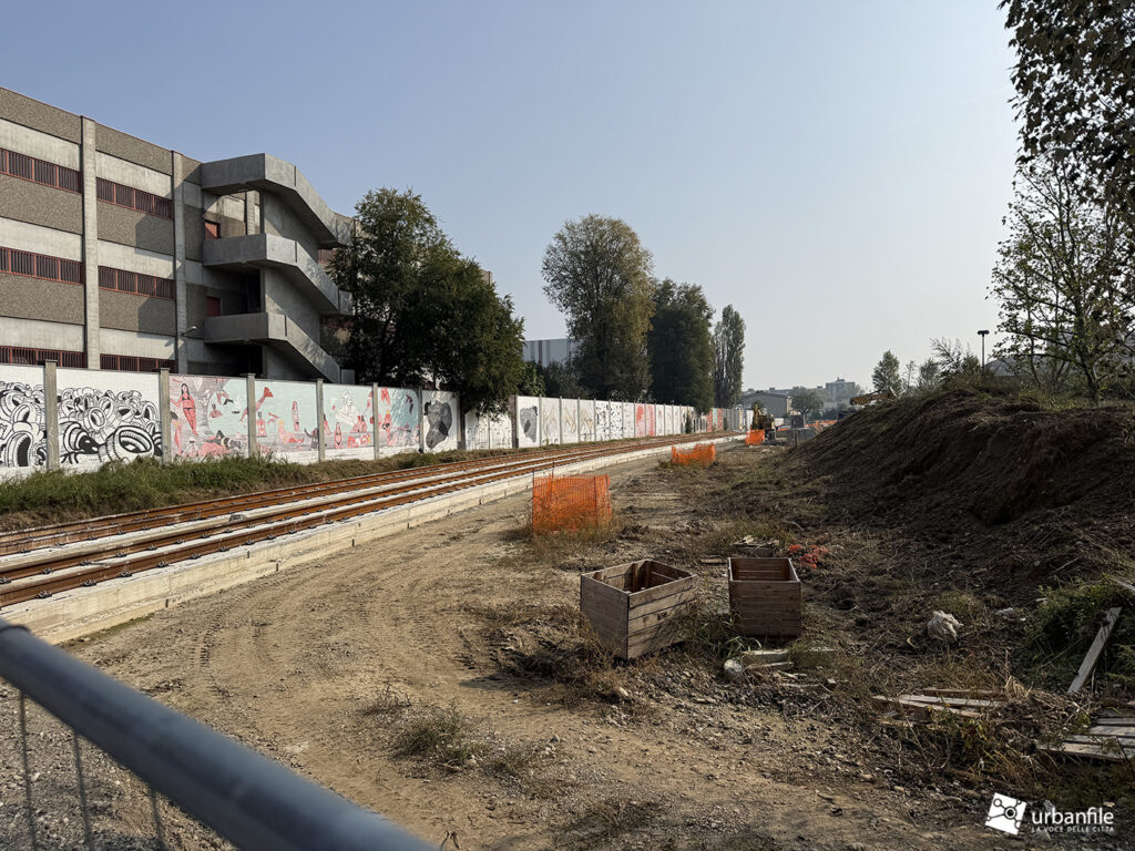 In via Racconigi sono stati posati i binari nel tratto centrale, che tende a compiere una leggera curva verso l’area degli archivi comunali di Via Gregorovius, per allontanare l’infrastruttura dalle vicine case del quartiere Ca’ Granda Nord.