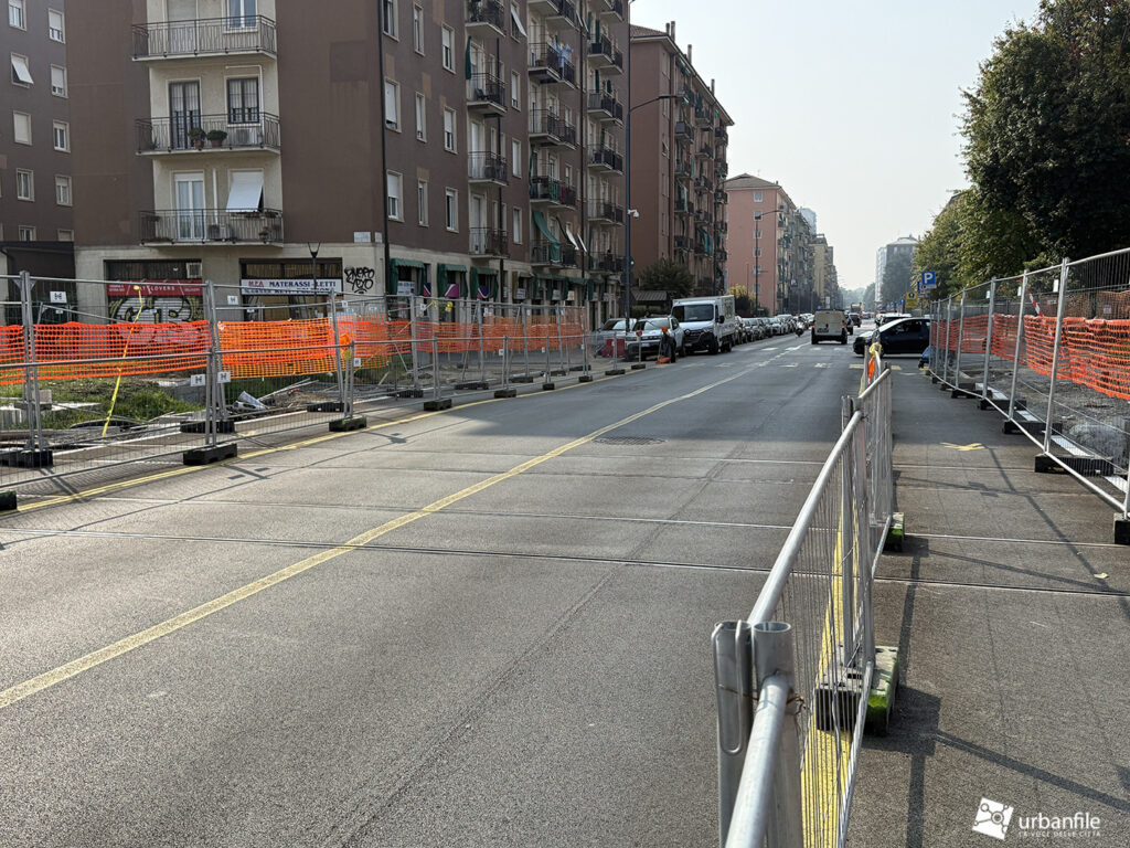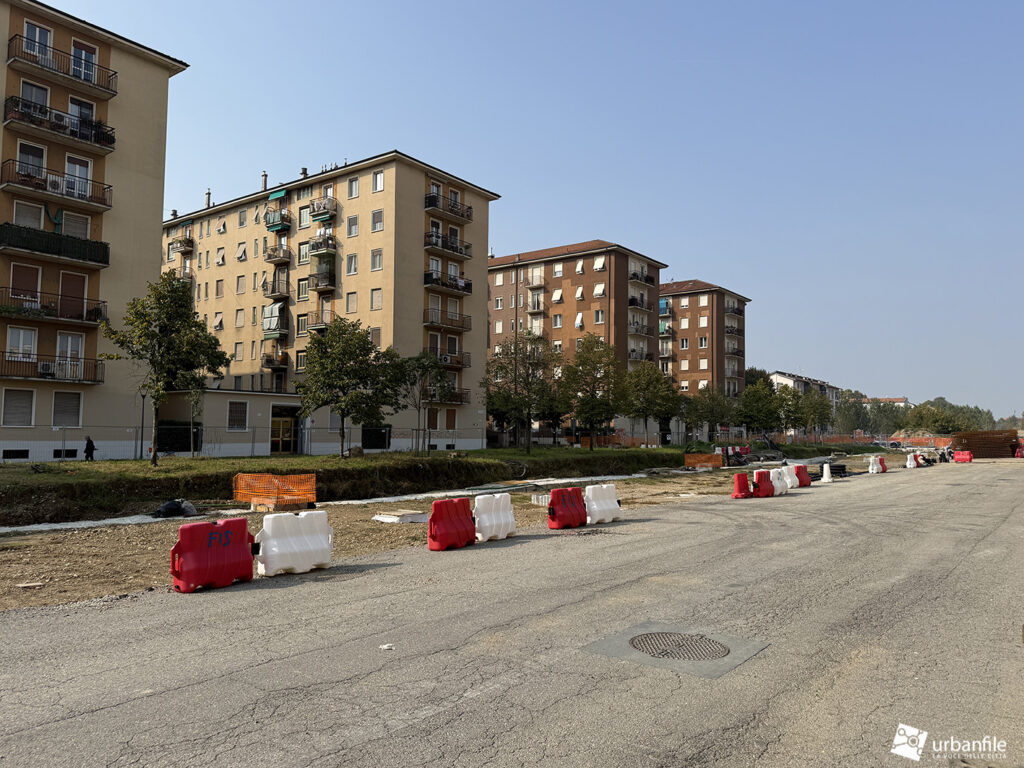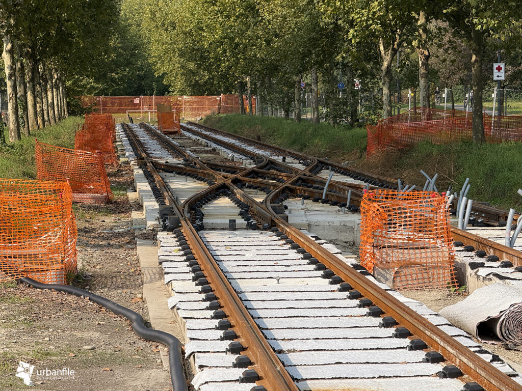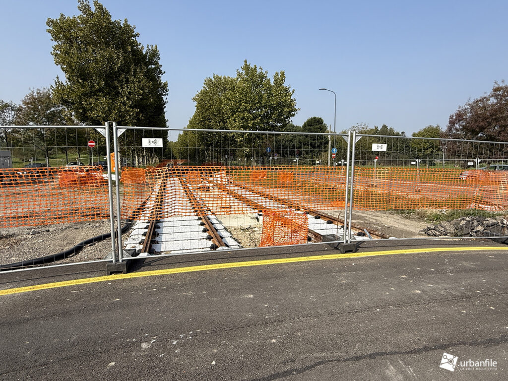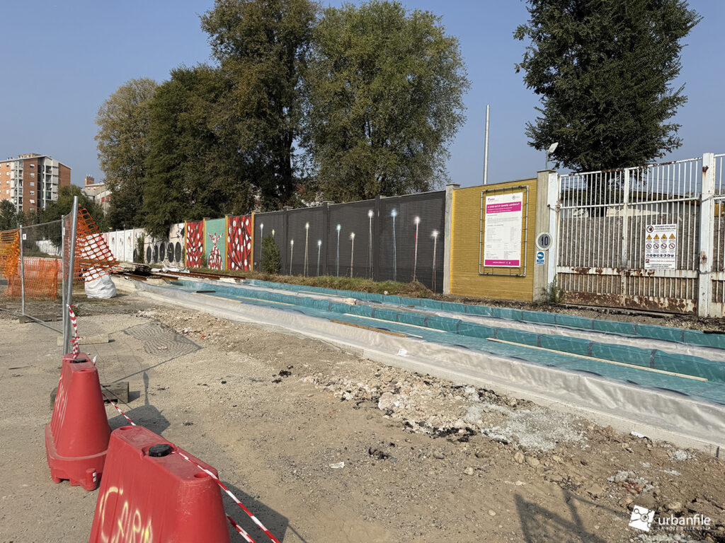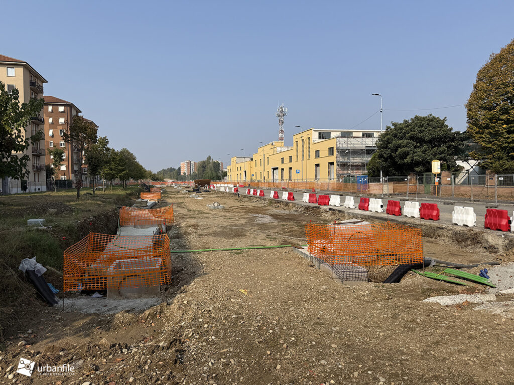 In via Racconigi sono stati posati i binari nel tratto centrale, che tende a compiere una leggera curva verso l’area degli archivi comunali di Via Gregorovius, per allontanare l’infrastruttura dalle vicine case del quartiere Ca’ Granda Nord.