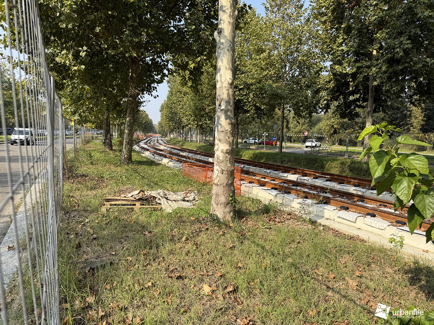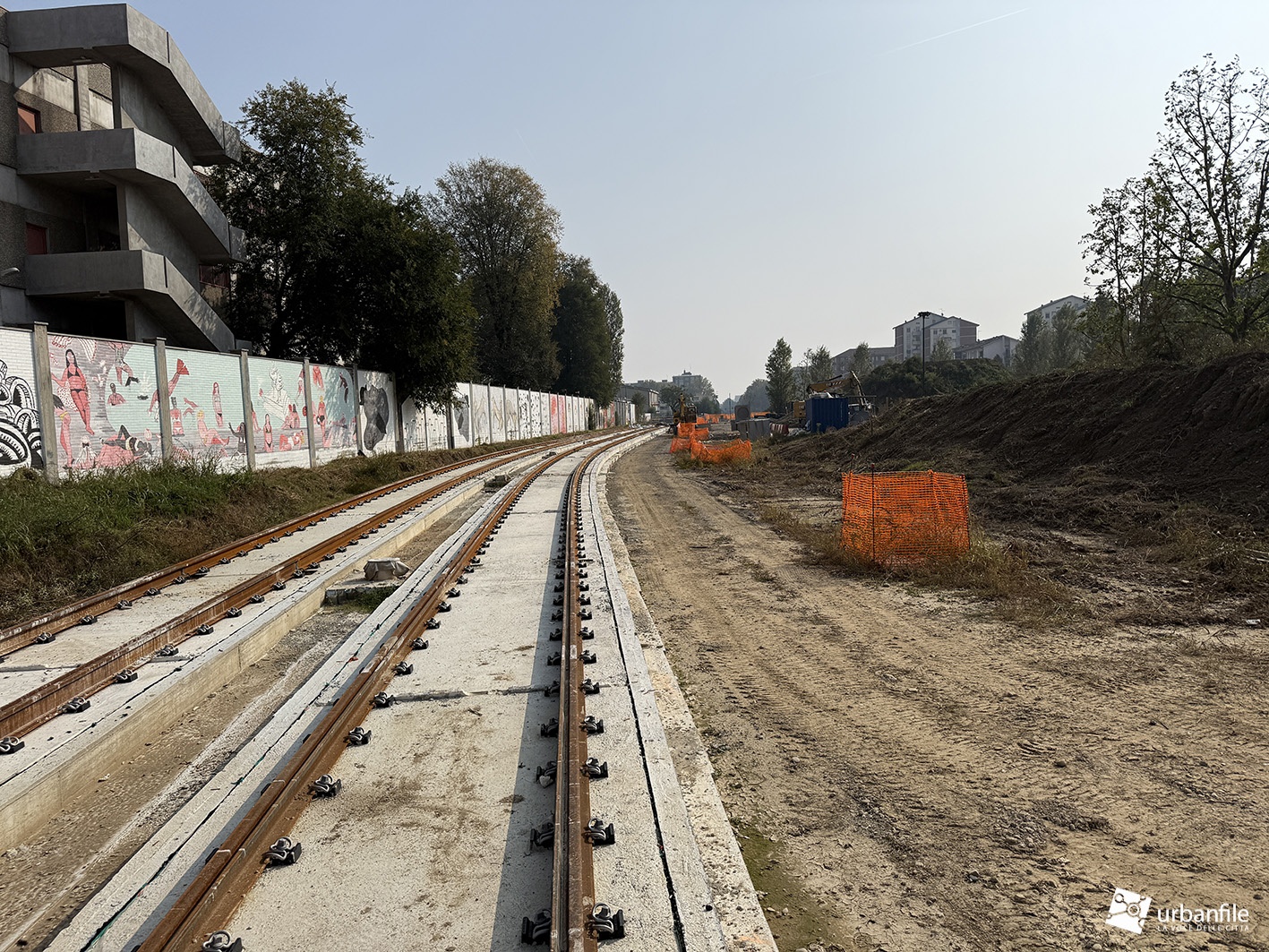 In via Racconigi sono stati posati i binari nel tratto centrale, che tende a compiere una leggera curva verso l’area degli archivi comunali di Via Gregorovius, per allontanare l’infrastruttura dalle vicine case del quartiere Ca’ Granda Nord.