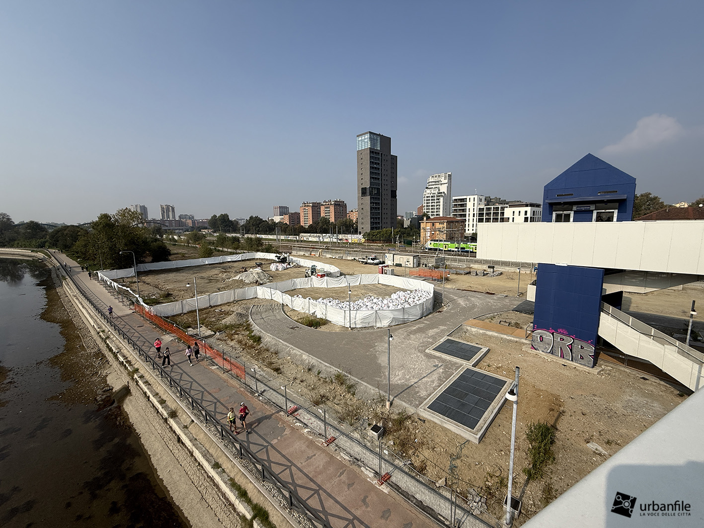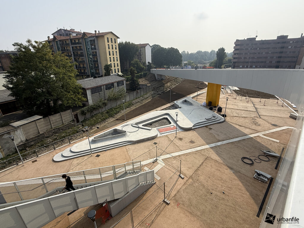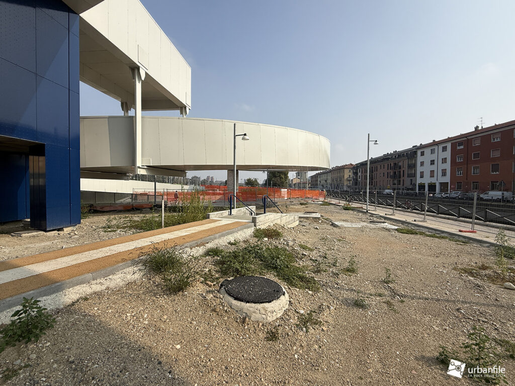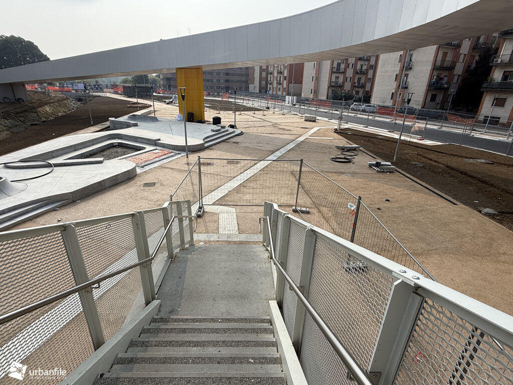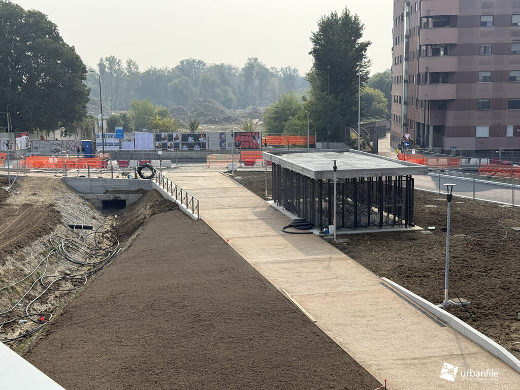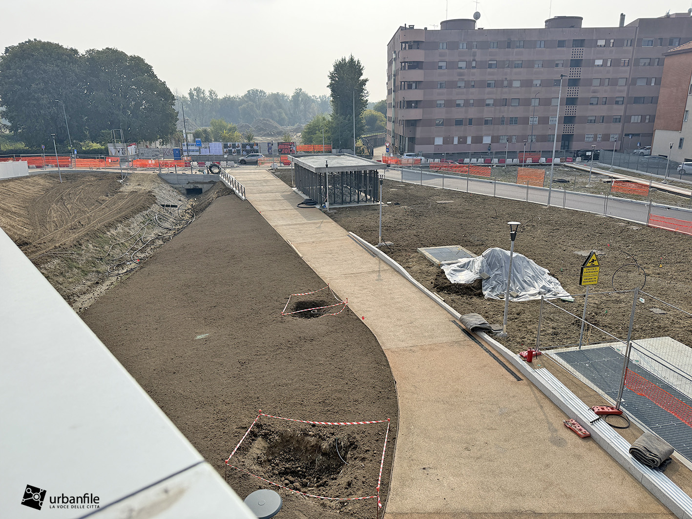 Vi portiamo alla scoperta del cantiere partendo da piazza Tirana, salendo sulla passerella dal lato del naviglio Grande e poi siamo ridiscesi sul versante di Ronchetto. Qui il piazzale nuovo sta prendendo forma e finalmente si possono vedere le aree che saranno a verde.
