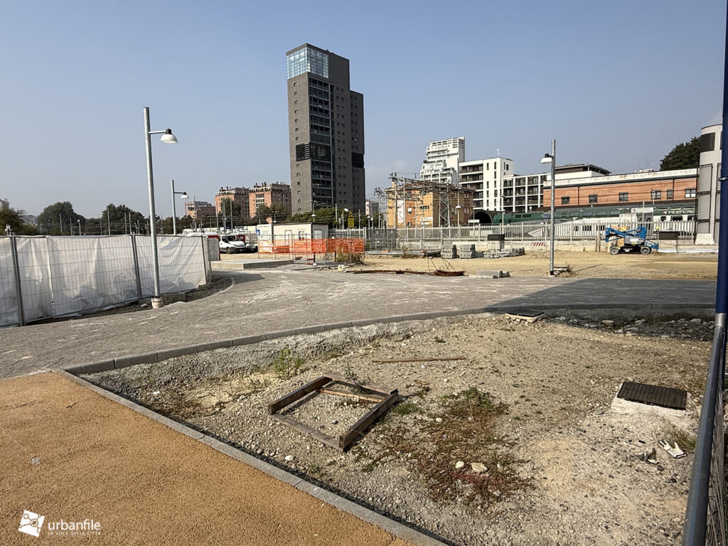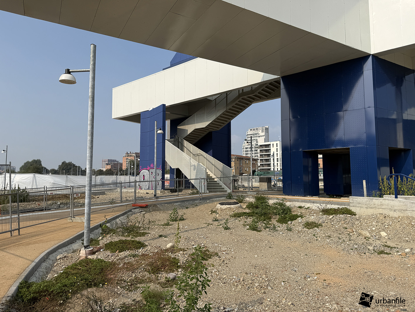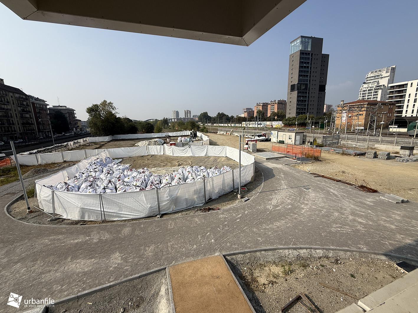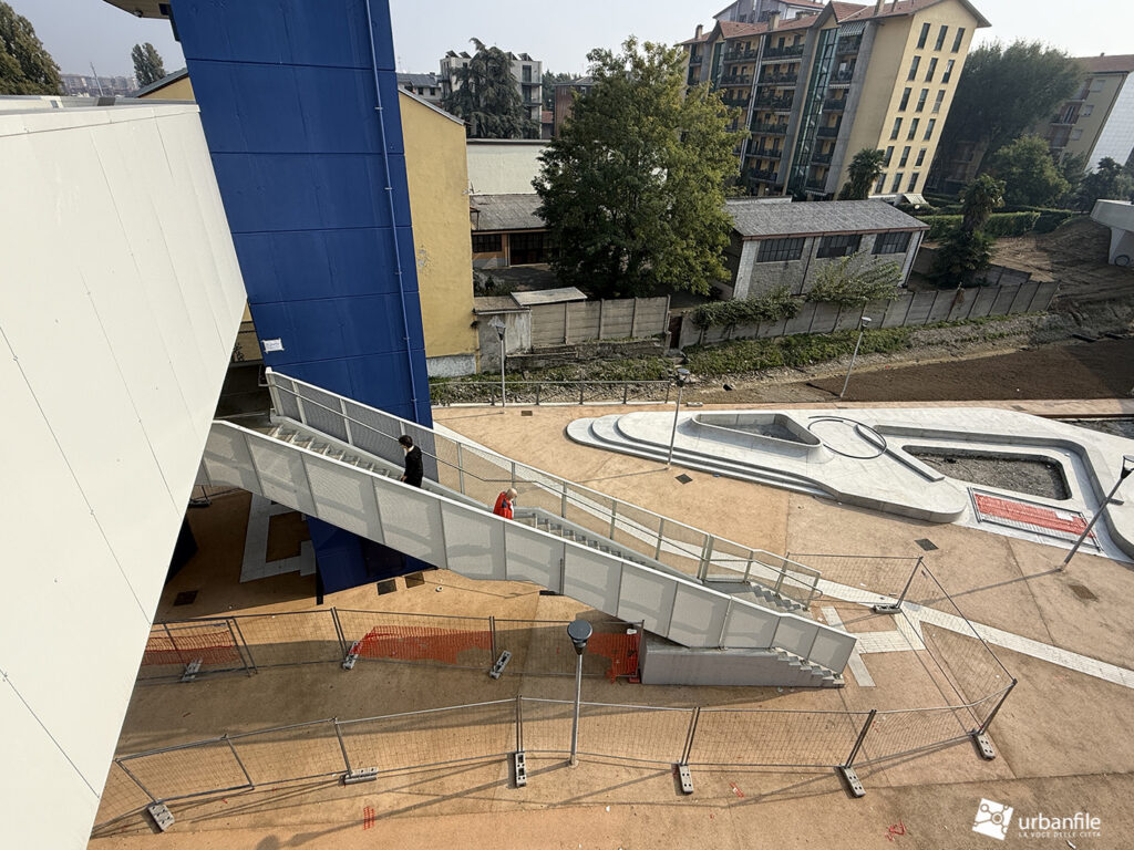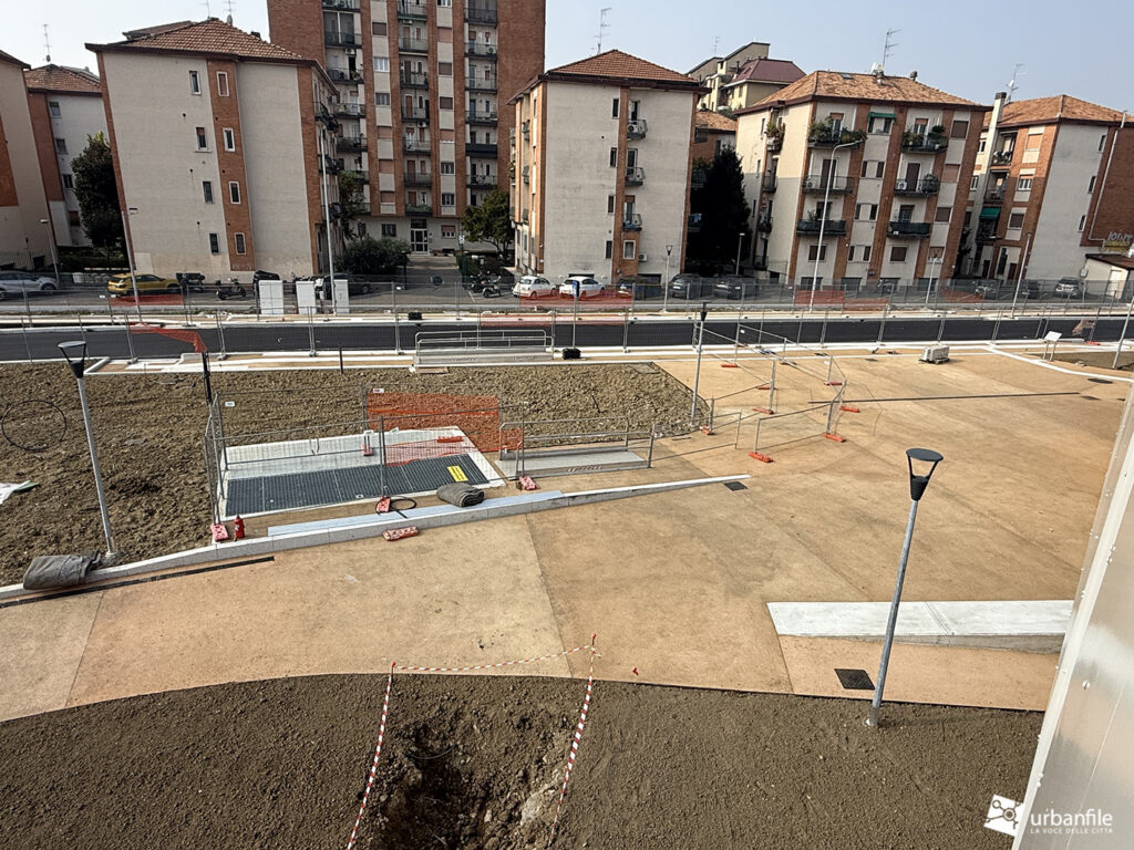Vi portiamo alla scoperta del cantiere partendo da piazza Tirana, salendo sulla passerella dal lato del naviglio Grande e poi siamo ridiscesi sul versante di Ronchetto. Qui il piazzale nuovo sta prendendo forma e finalmente si possono vedere le aree che saranno a verde.