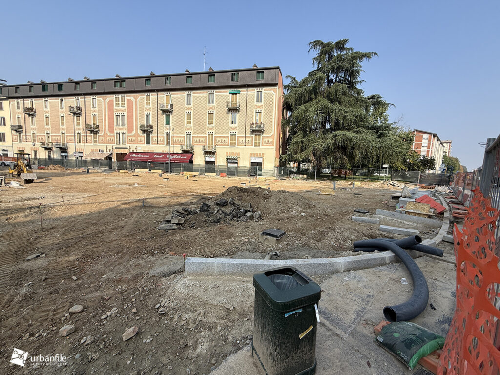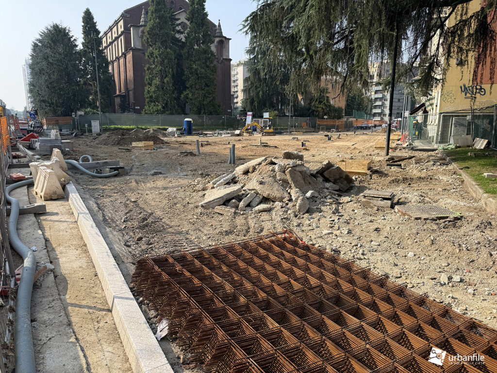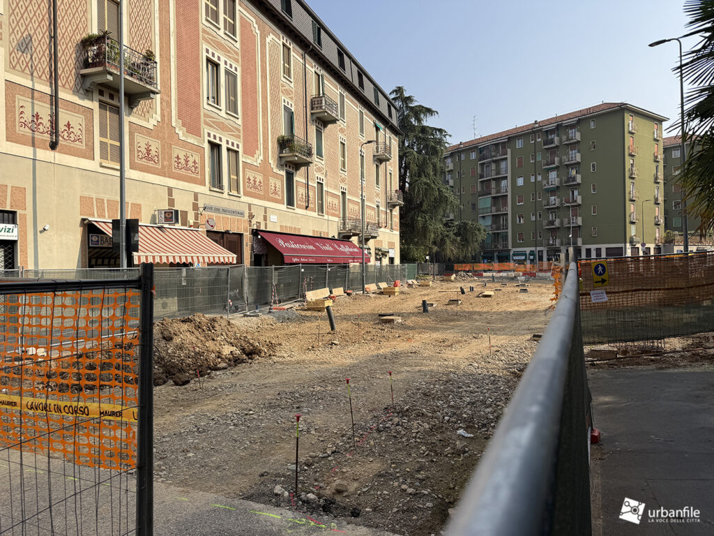 Ottobre 2025. Un aggiornamento dalla piazza antistante la graziosa chiesa di San Dionigi in Pratocentenaro e da via De Angelis. Da giugno sono in corso i lavori di riqualificazione di due aree situate a Pratocentenaro, l’antico borgo e frazione di Niguarda oggi scomparso, ma ancora ricordato nei nomi di alcuni luoghi della zona.