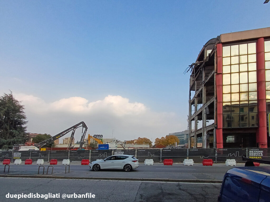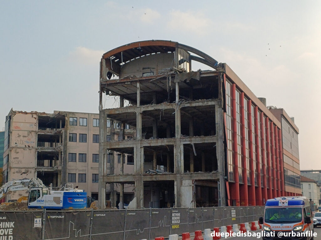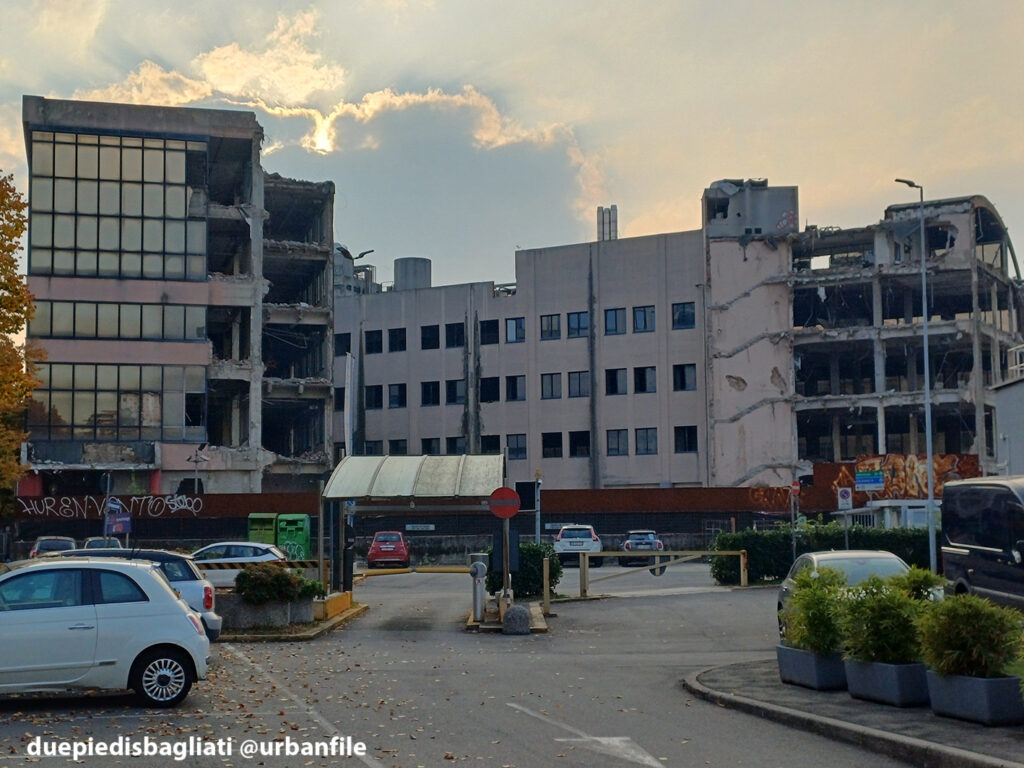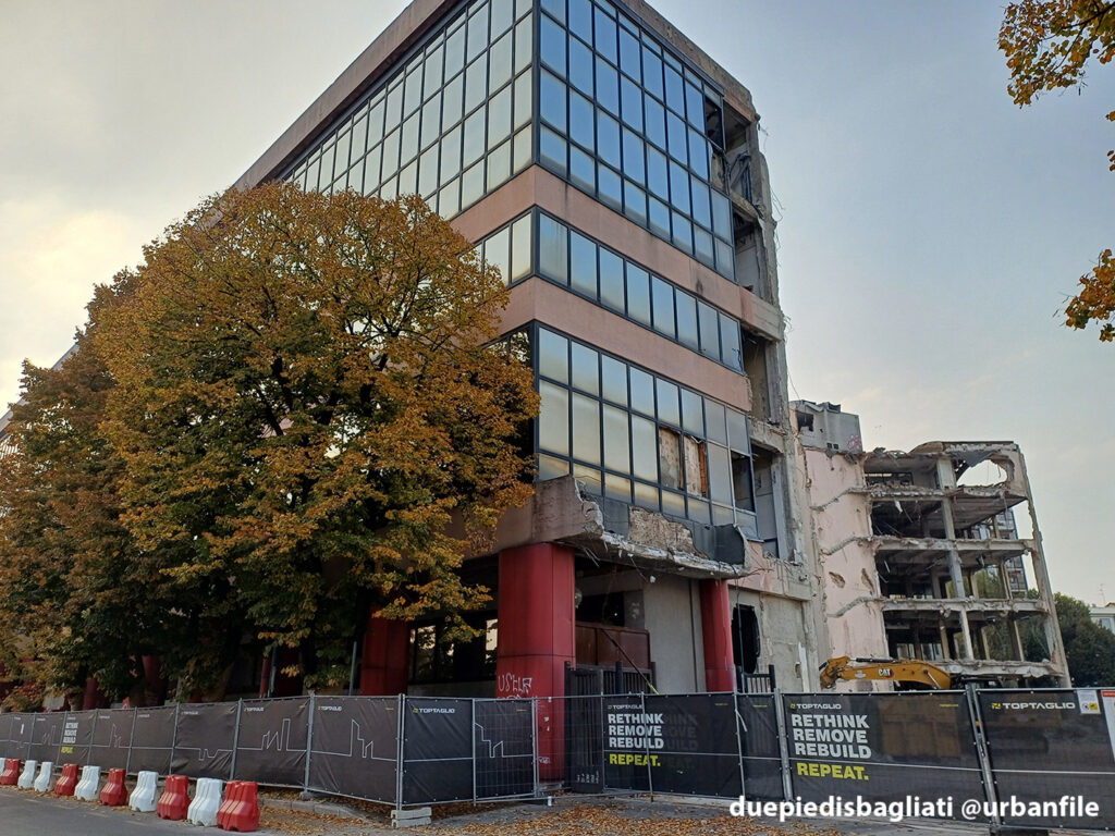 Ottobre 2025. Dopo un decennio di abbandono, l’edificio “scarlatto” che accoglie chi entra a Sesto San Giovanni da Milano, sito all’angolo tra via Ercole Marelli e Viale Italia si appresta a scomparire. Infatti da qualche settimana sono cominciati i lavori di demolizione dello stabile realizzato negli anni Ottanta per gli uffici della Magneti Marelli.