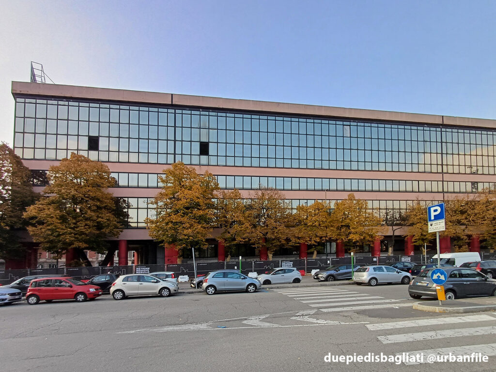 L’edificio in demolizione non è certo una perdita per l’architettura italiana. Linee semplici e caratterizzate dalla “pesantezza” architettonica degli anni Ottanta: vetrate continue, due marcapiano rosa e colonne rosse carminio sottolineavano un’inutile portico.