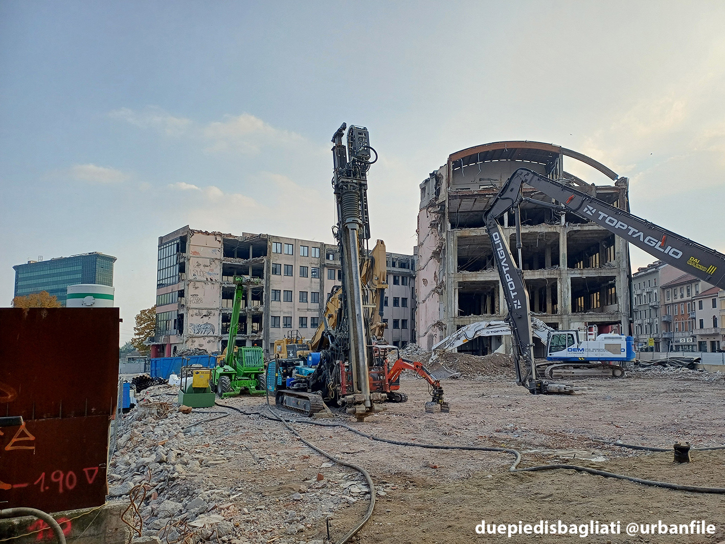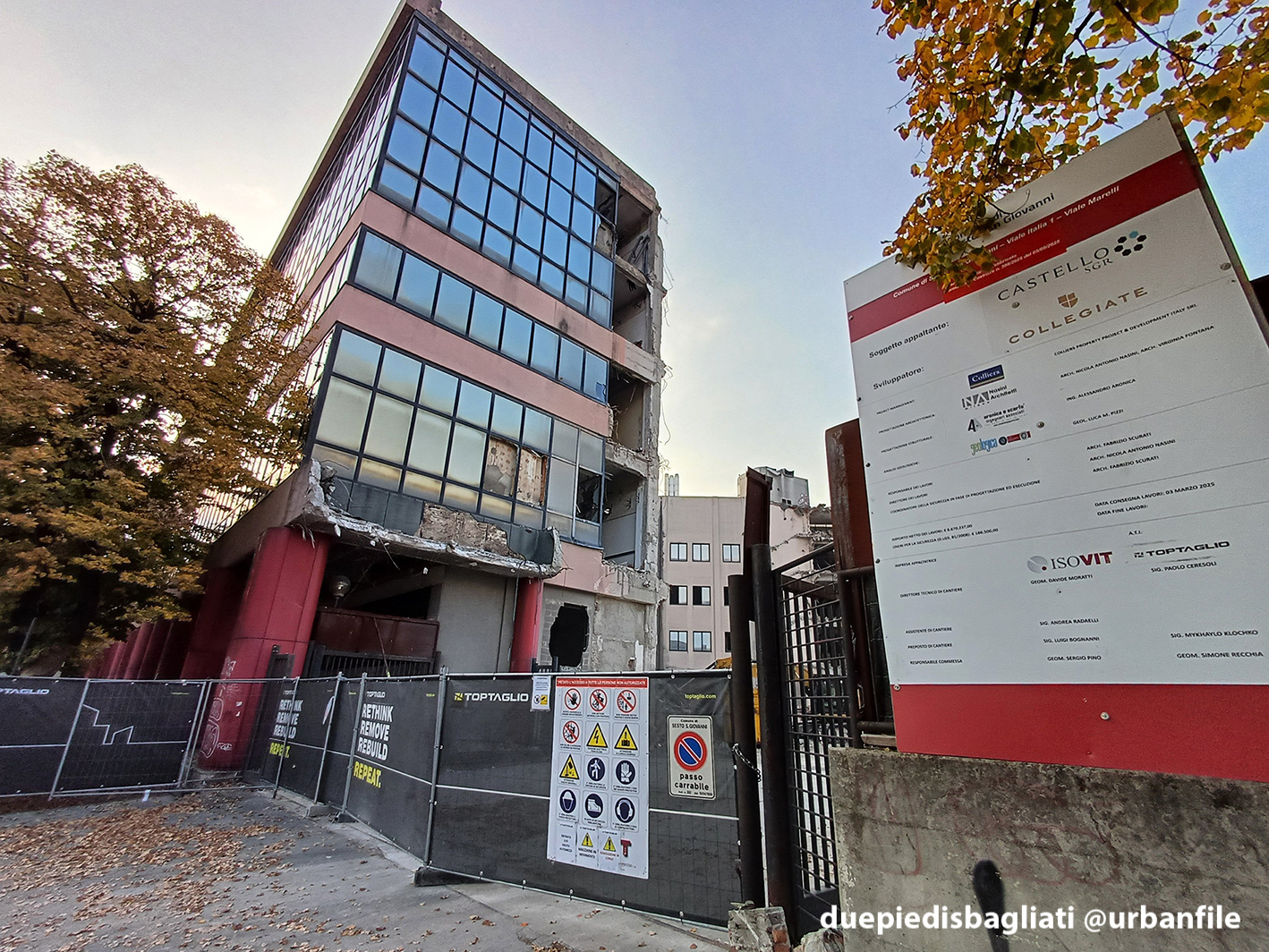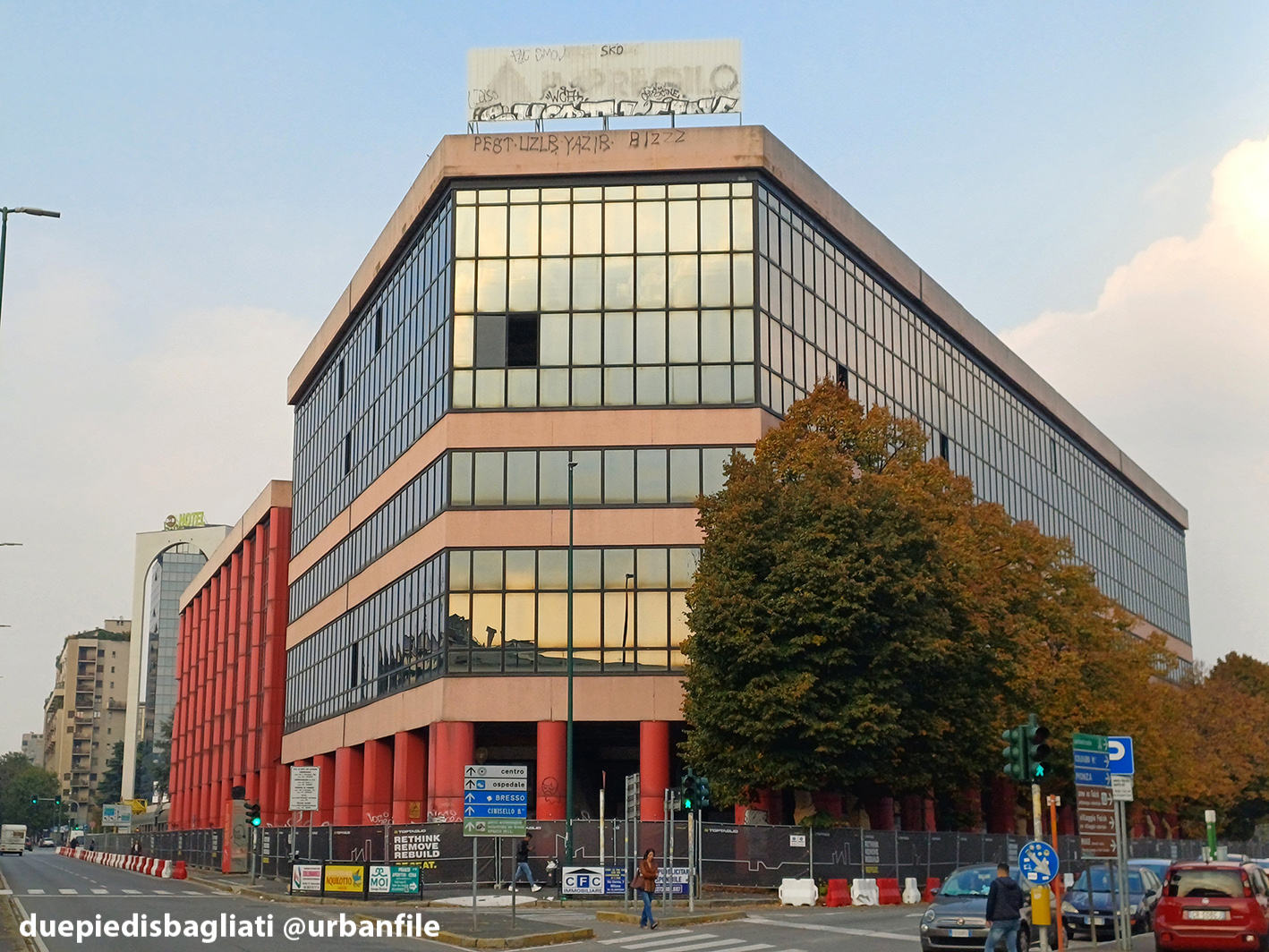 Ottobre 2025. Dopo un decennio di abbandono, l’edificio “scarlatto” che accoglie chi entra a Sesto San Giovanni da Milano, sito all’angolo tra via Ercole Marelli e Viale Italia si appresta a scomparire. Infatti da qualche settimana sono cominciati i lavori di demolizione dello stabile realizzato negli anni Ottanta per gli uffici della Magneti Marelli.