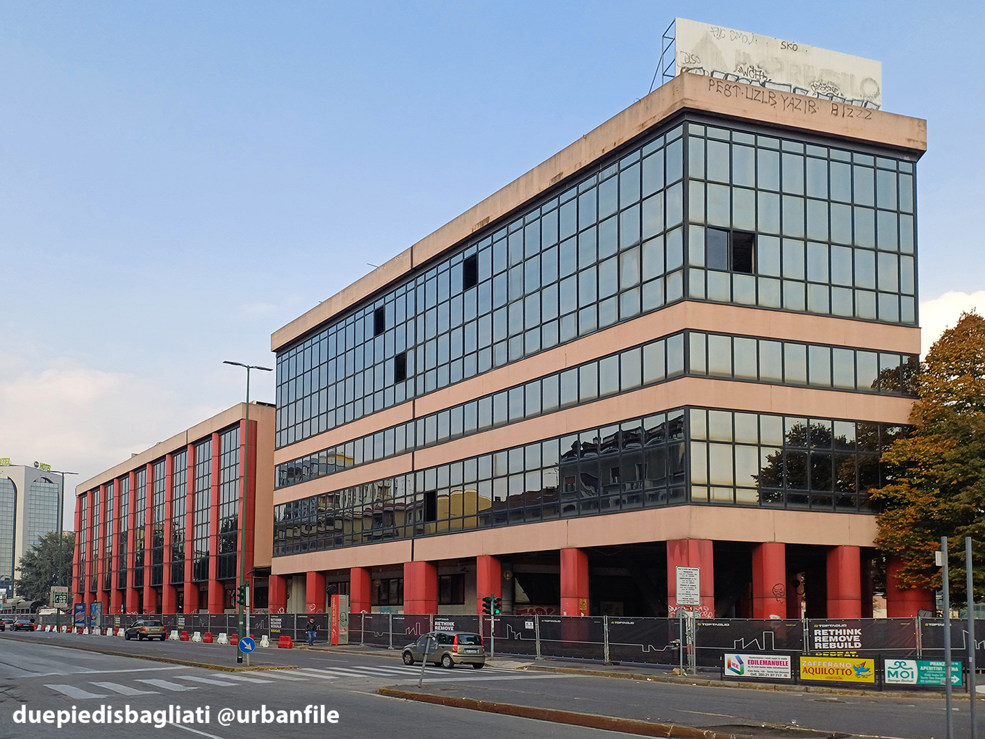 L’edificio in demolizione non è certo una perdita per l’architettura italiana. Linee semplici e caratterizzate dalla “pesantezza” architettonica degli anni Ottanta: vetrate continue, due marcapiano rosa e colonne rosse carminio sottolineavano un’inutile portico.