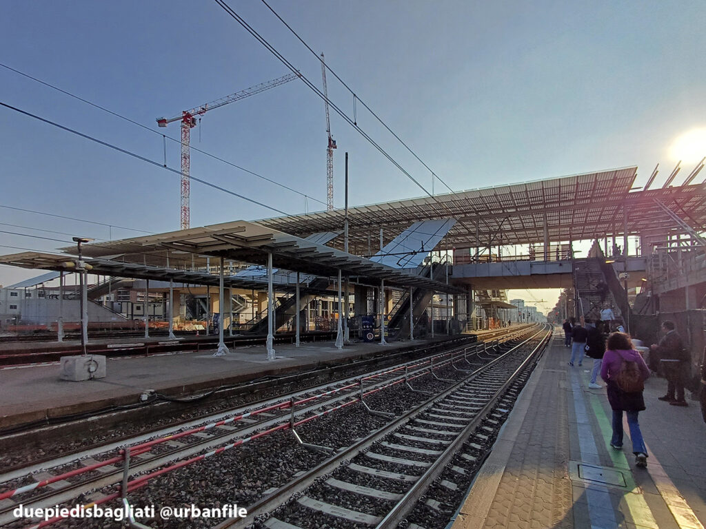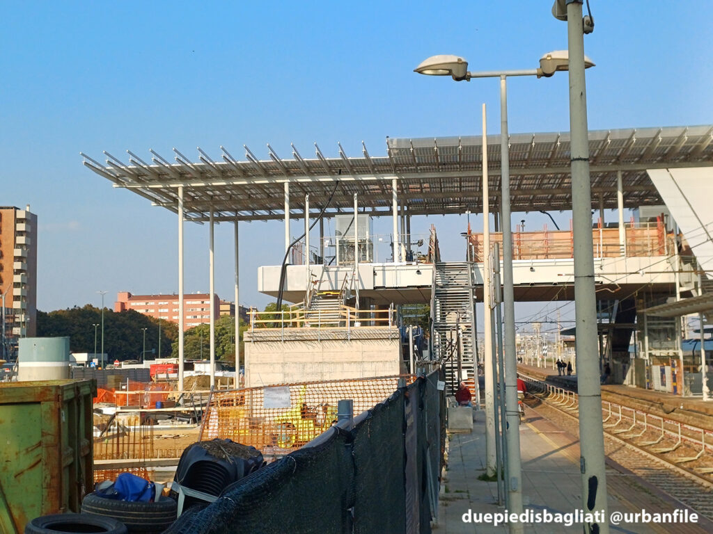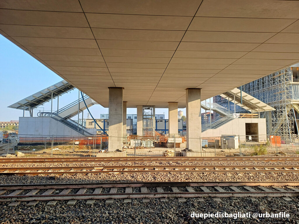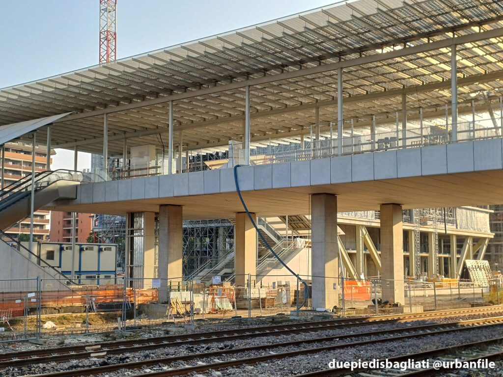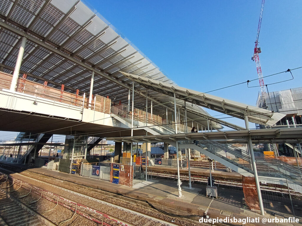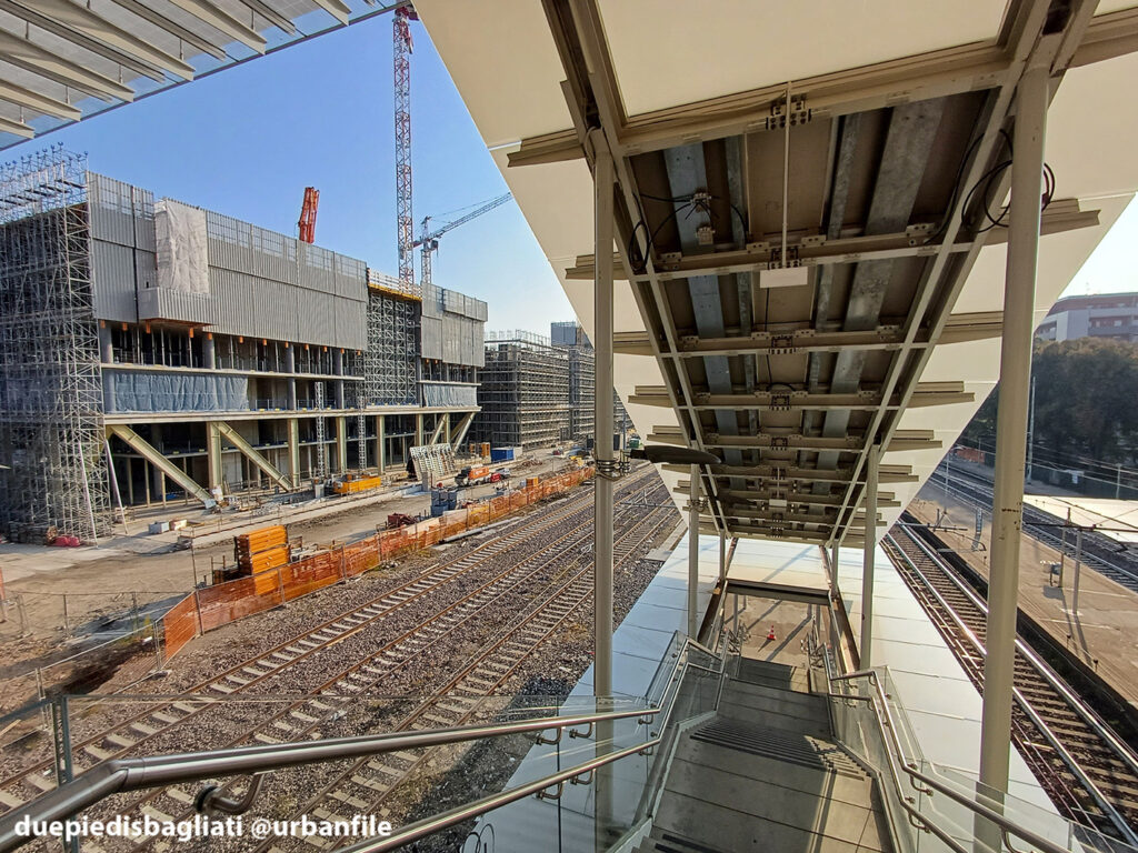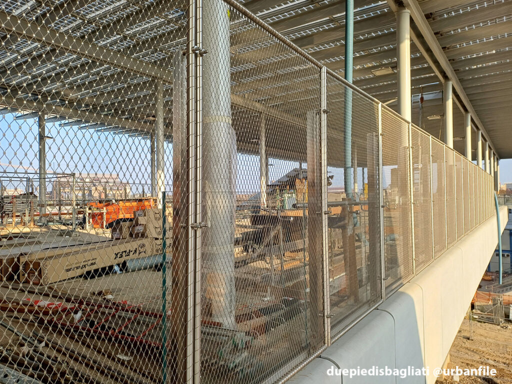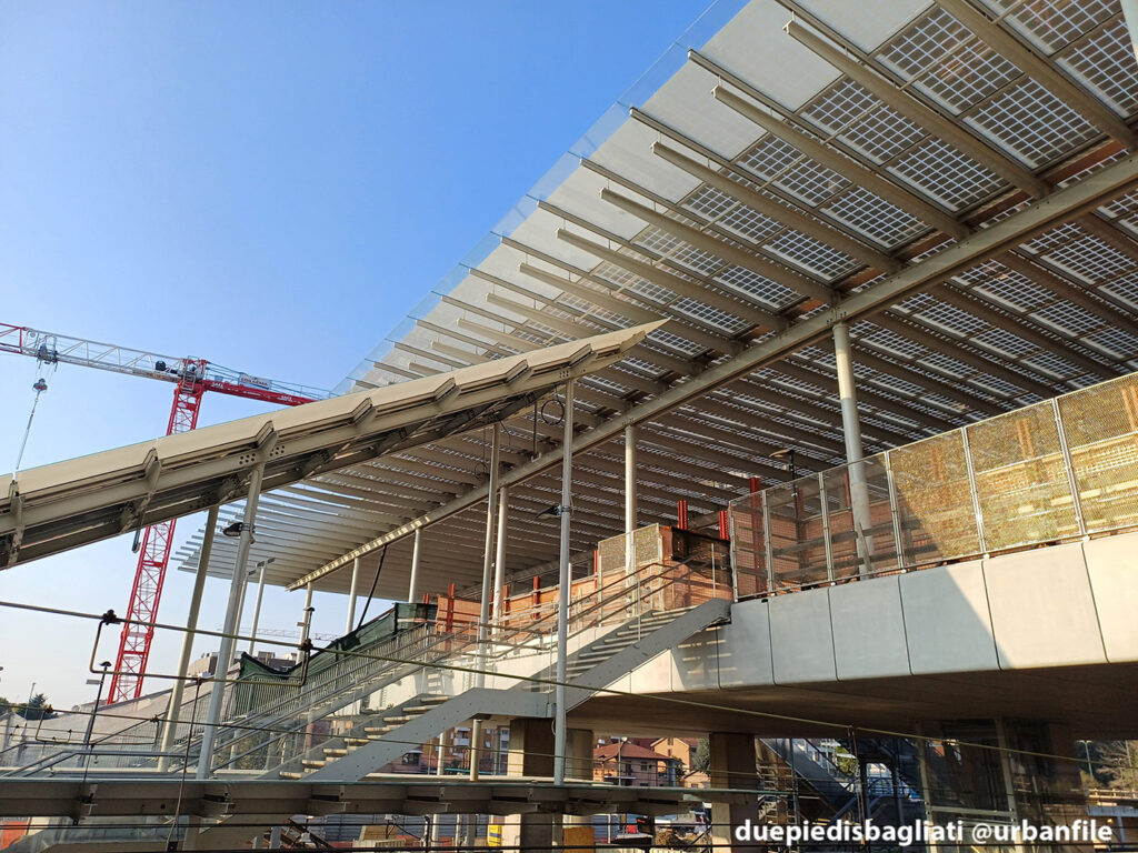 Mentre la stazione di Sesto San Giovanni ha proseguito nello svolgere la sua funzione i lavori, come si vede, sono andati avanti. Si percepisce bene la firma di Renzo piano, con la sua architettura “tecnica” e leggera. Noterete anche che la struttura a ponte ha una maglia metallica invece dei parapetti in cristallo, sicuramente una soluzione esteticamente meno bella, ma posta forse a evitare atti vandalici come scritte e scarabocchi.