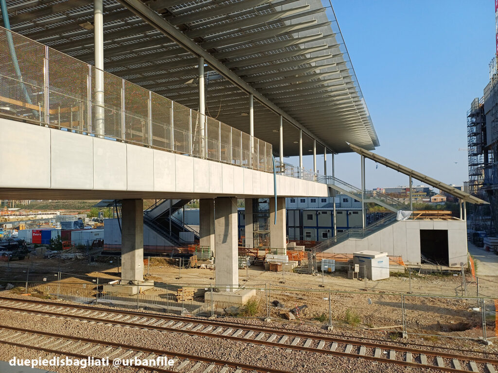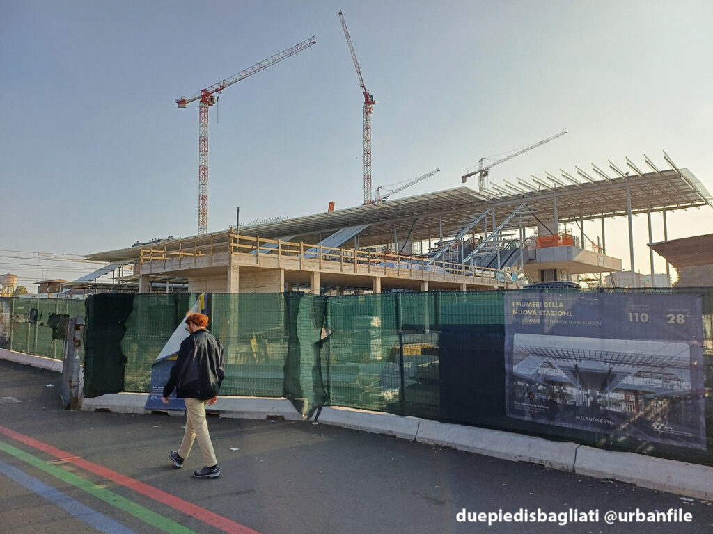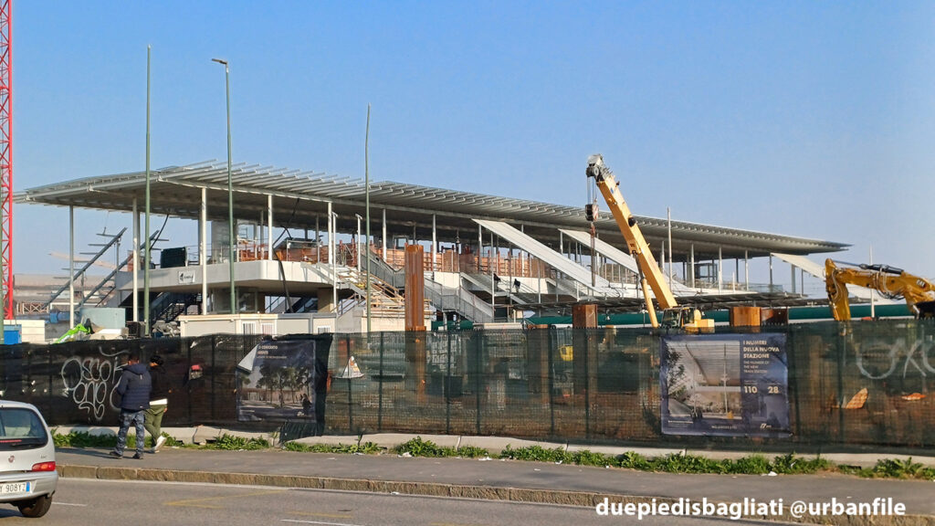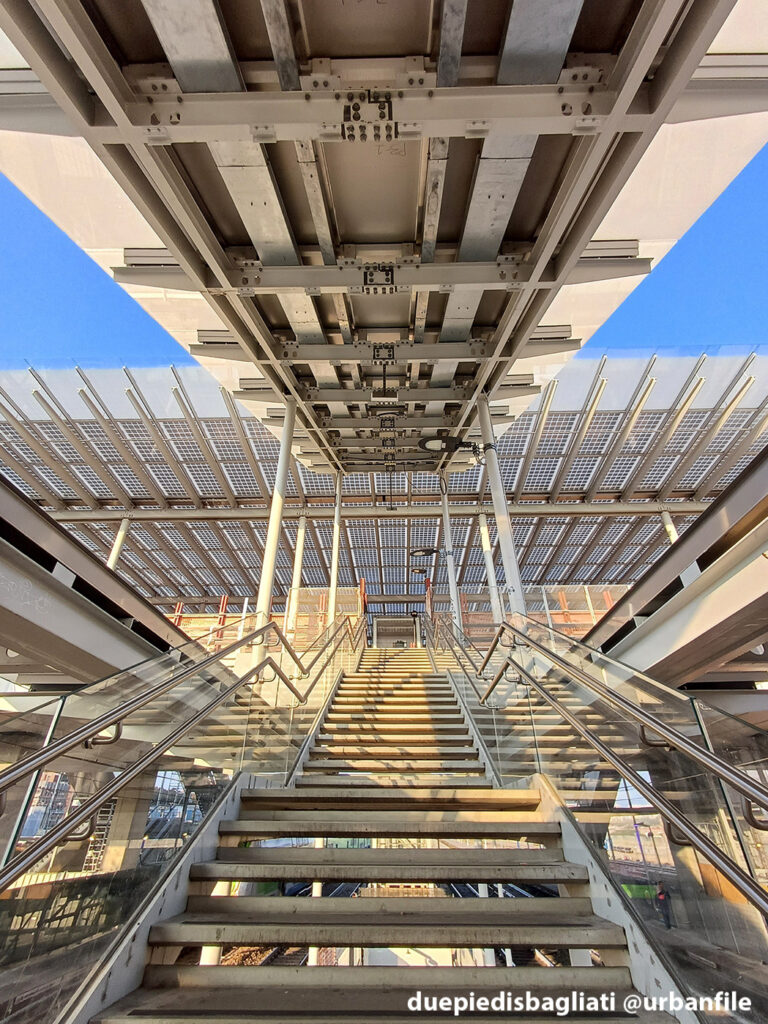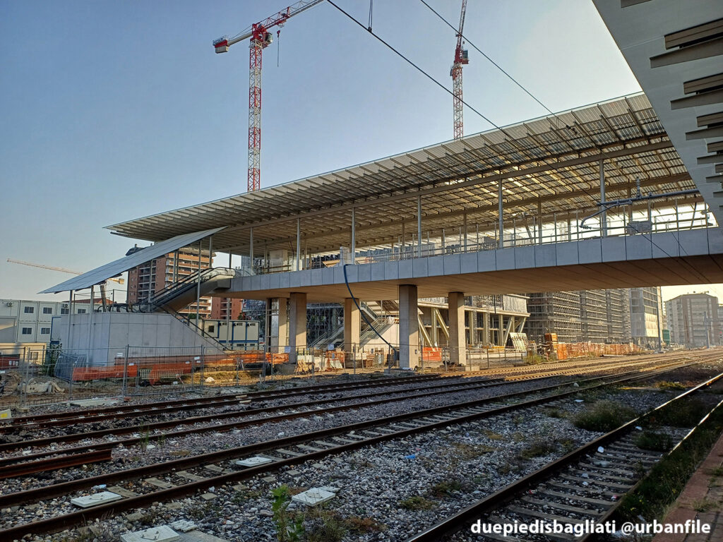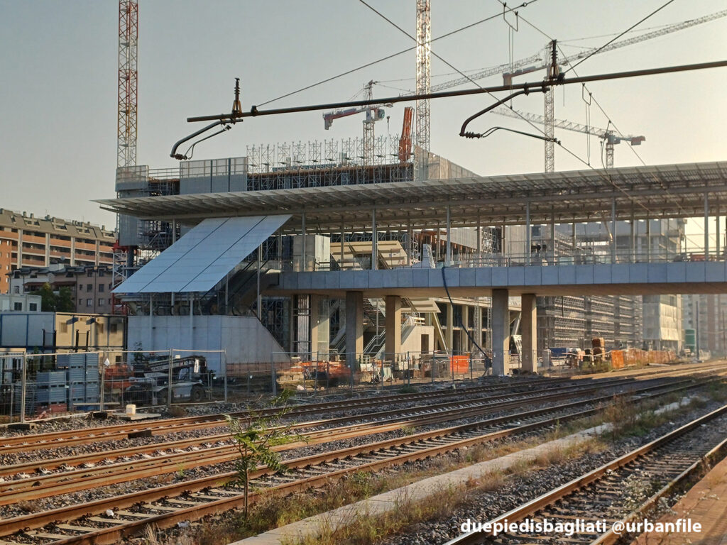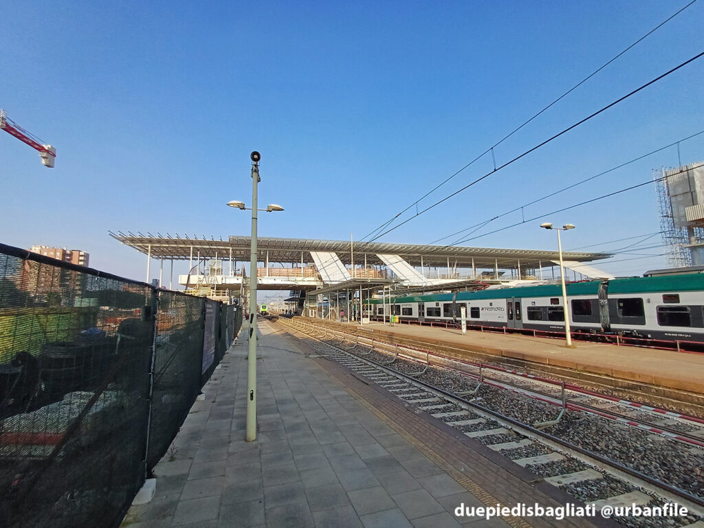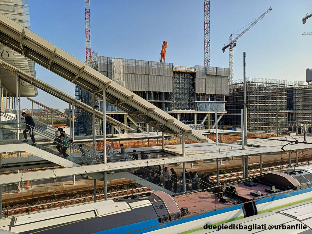 Mentre la stazione di Sesto San Giovanni ha proseguito nello svolgere la sua funzione i lavori, come si vede, sono andati avanti. Si percepisce bene la firma di Renzo piano, con la sua architettura “tecnica” e leggera. Noterete anche che la struttura a ponte ha una maglia metallica invece dei parapetti in cristallo, sicuramente una soluzione esteticamente meno bella, ma posta forse a evitare atti vandalici come scritte e scarabocchi.