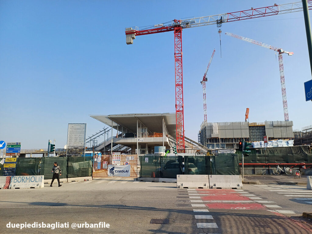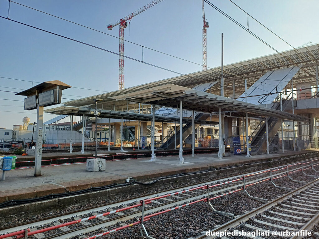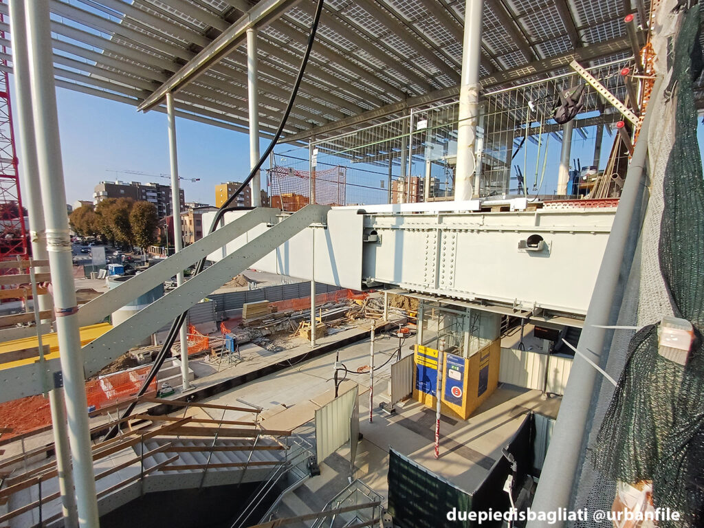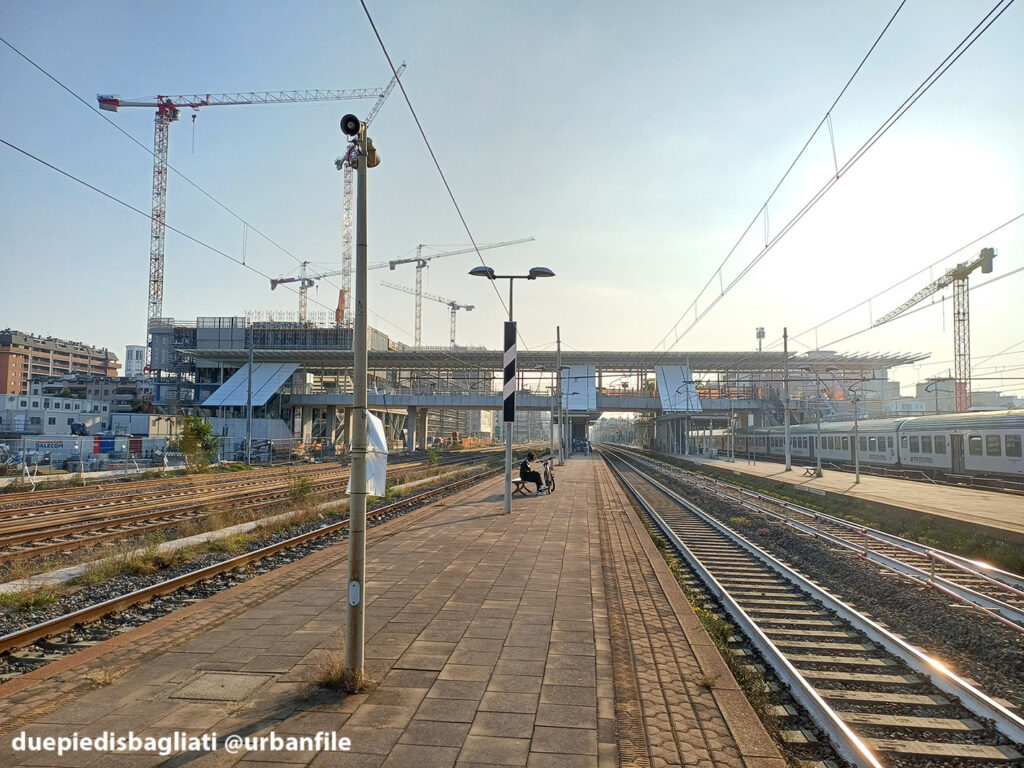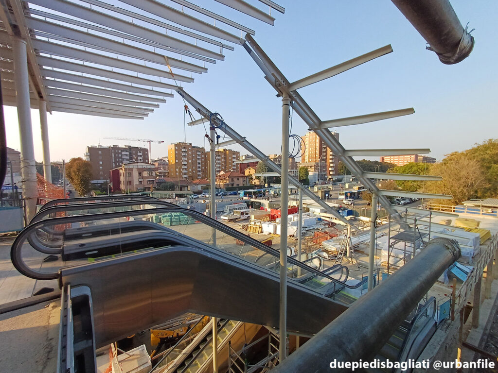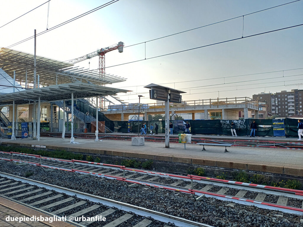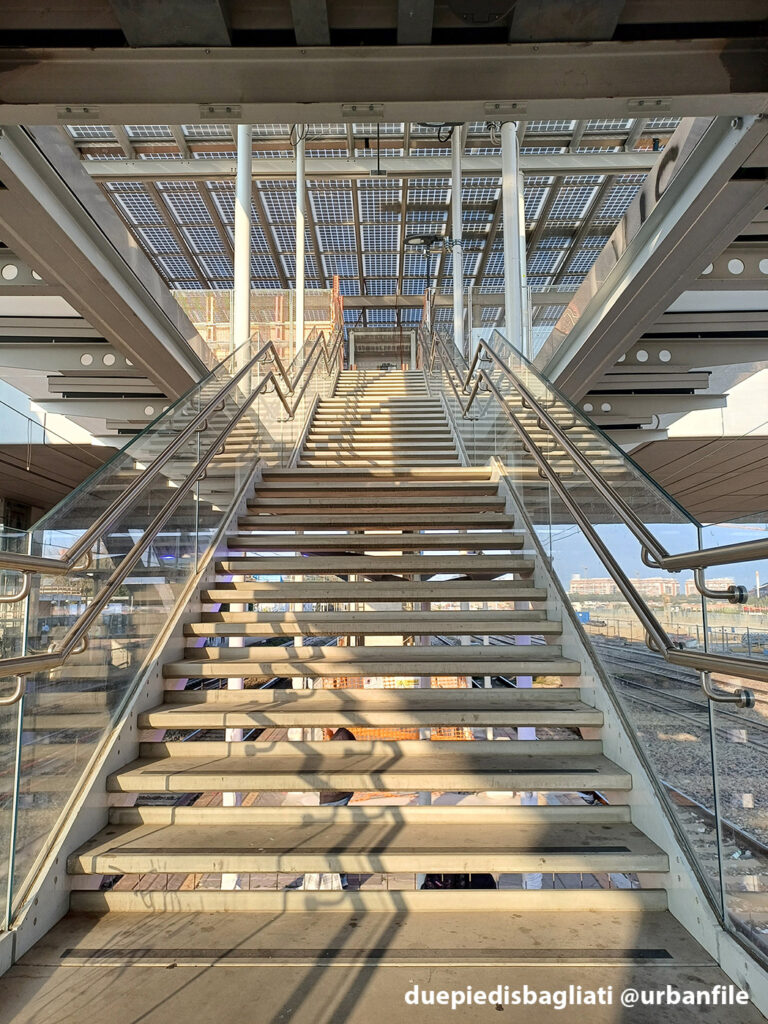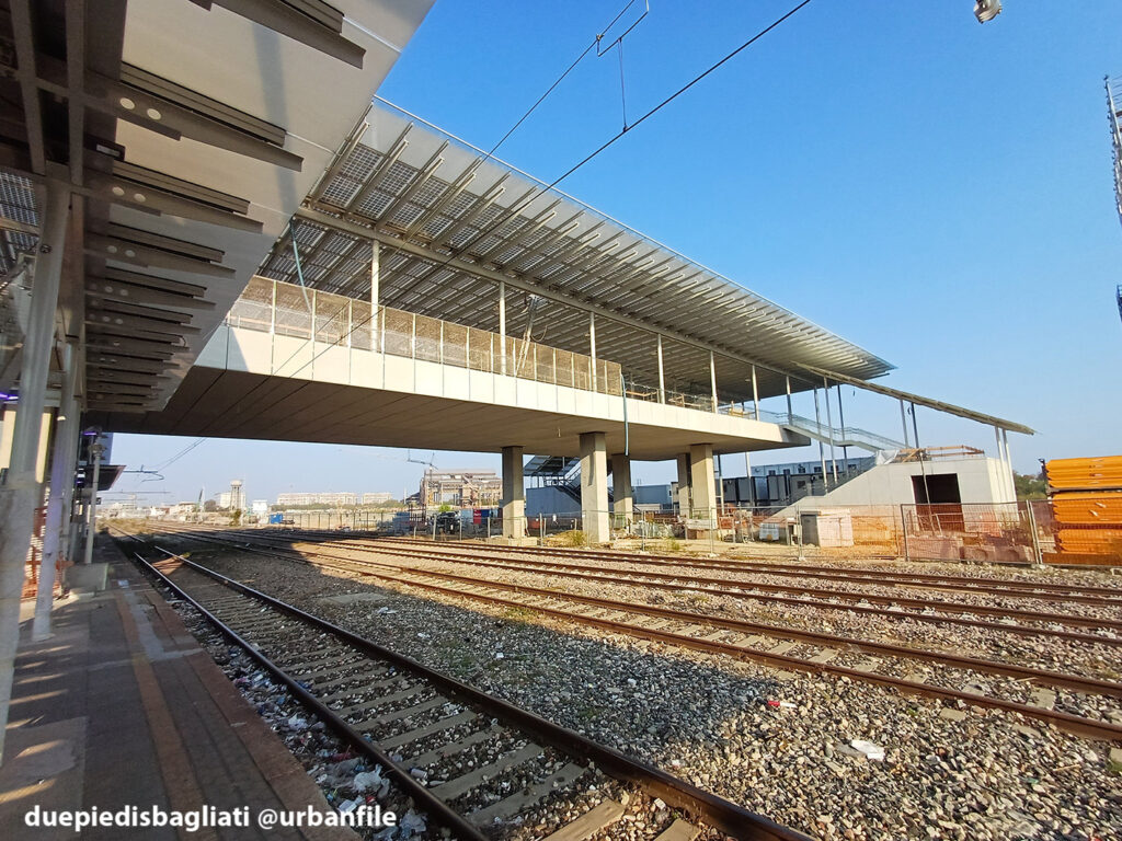 Mentre la stazione di Sesto San Giovanni ha proseguito nello svolgere la sua funzione i lavori, come si vede, sono andati avanti. Si percepisce bene la firma di Renzo piano, con la sua architettura “tecnica” e leggera. Noterete anche che la struttura a ponte ha una maglia metallica invece dei parapetti in cristallo, sicuramente una soluzione esteticamente meno bella, ma posta forse a evitare atti vandalici come scritte e scarabocchi.