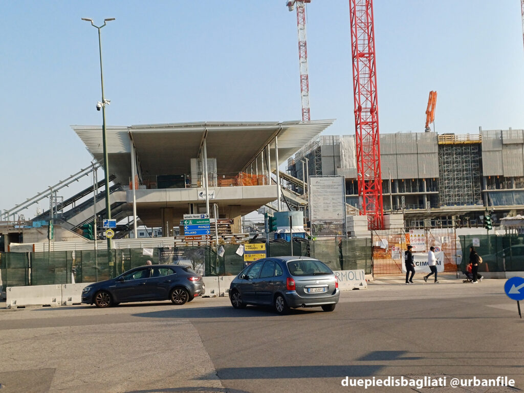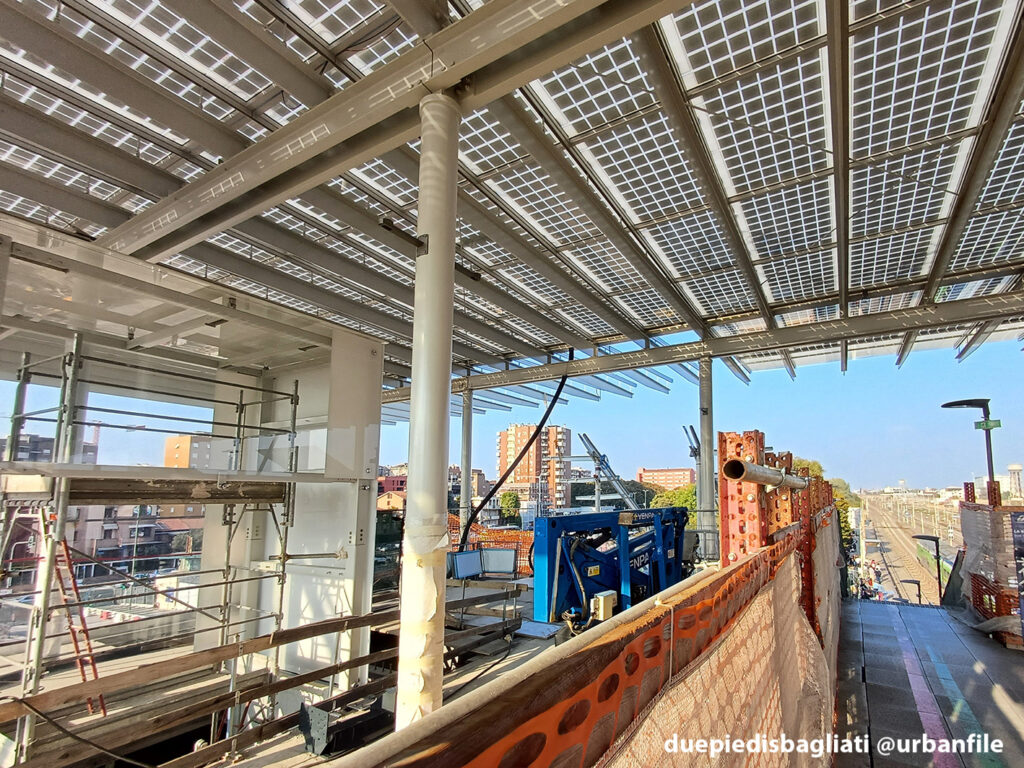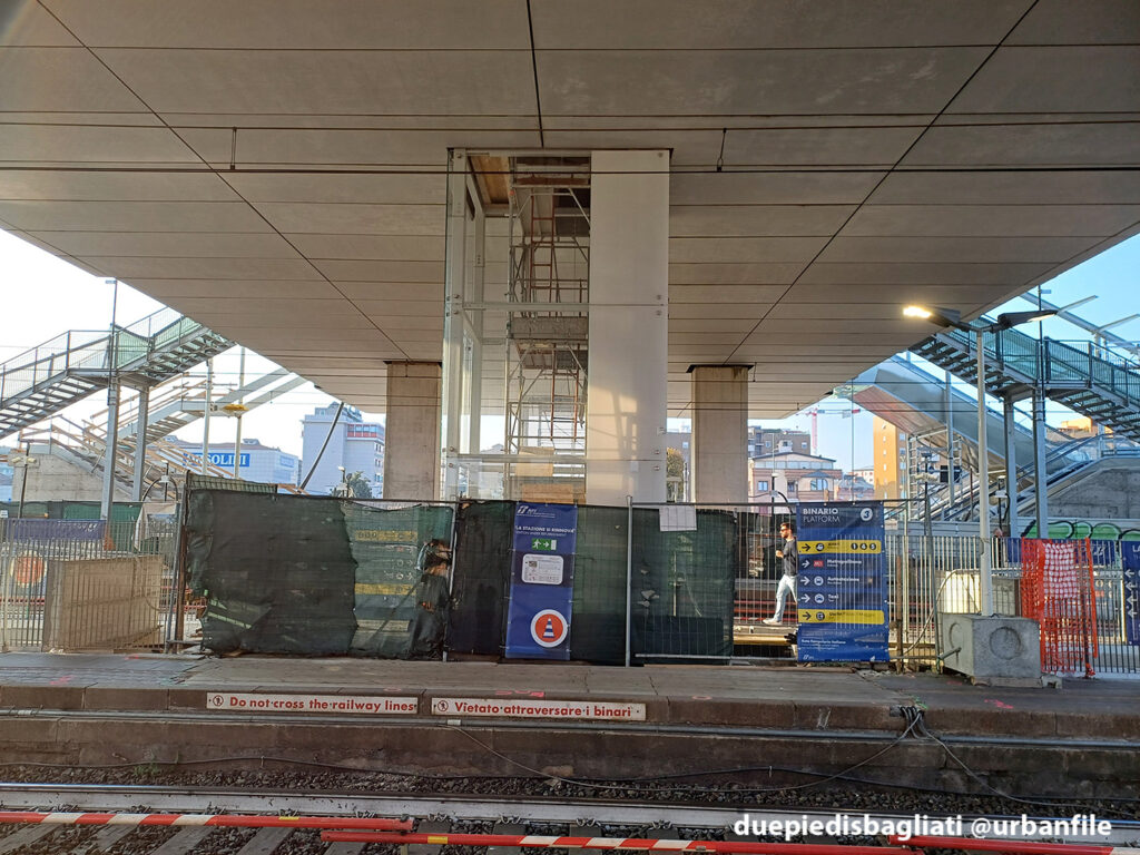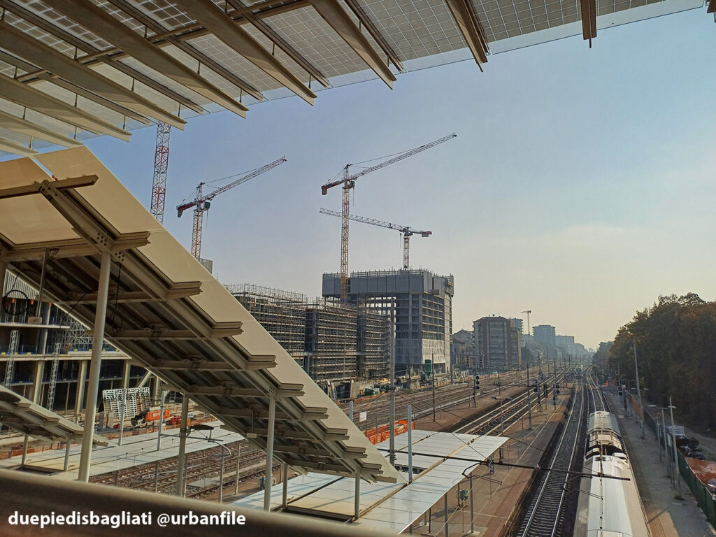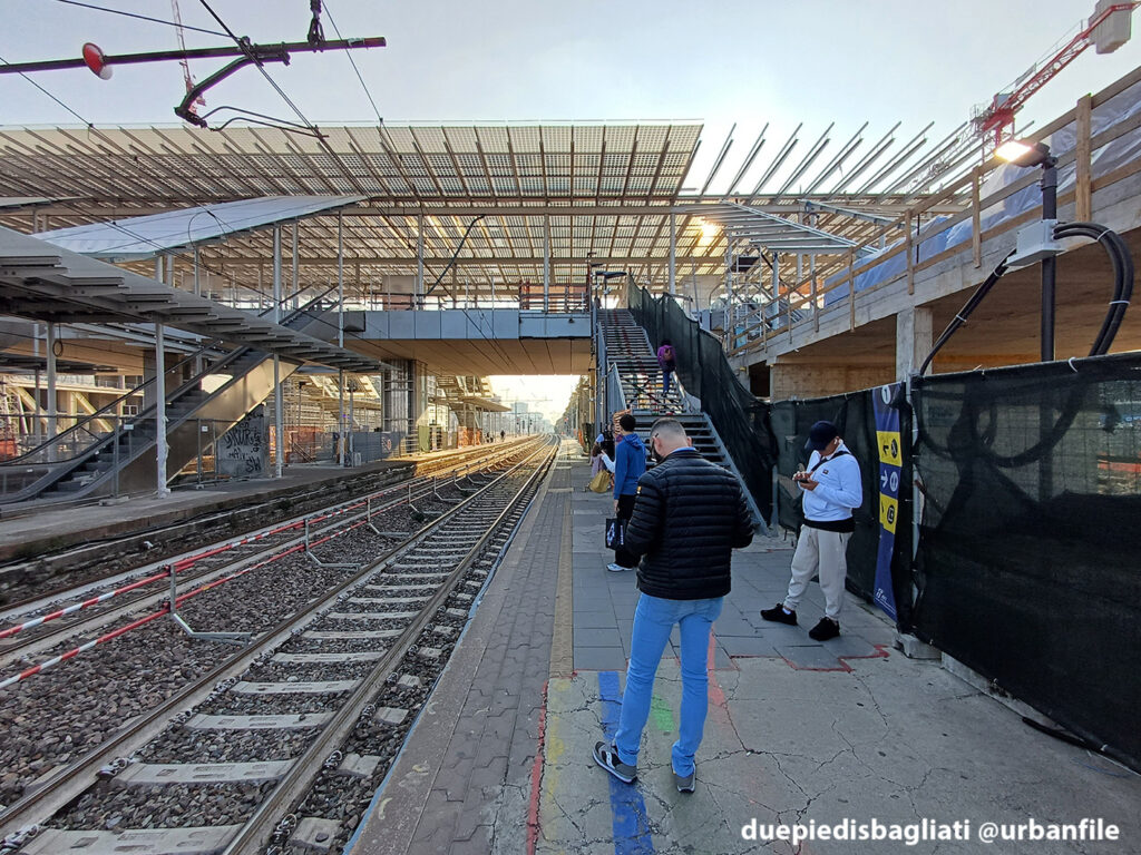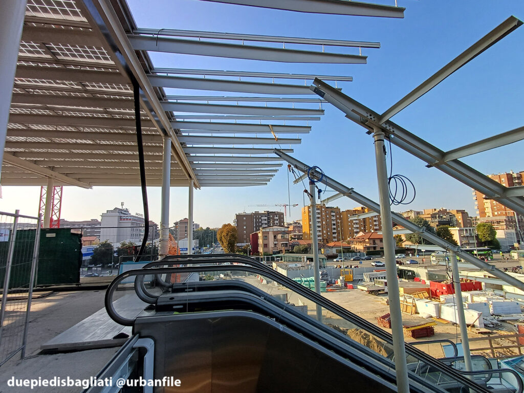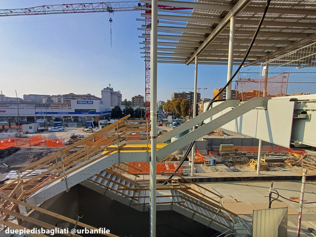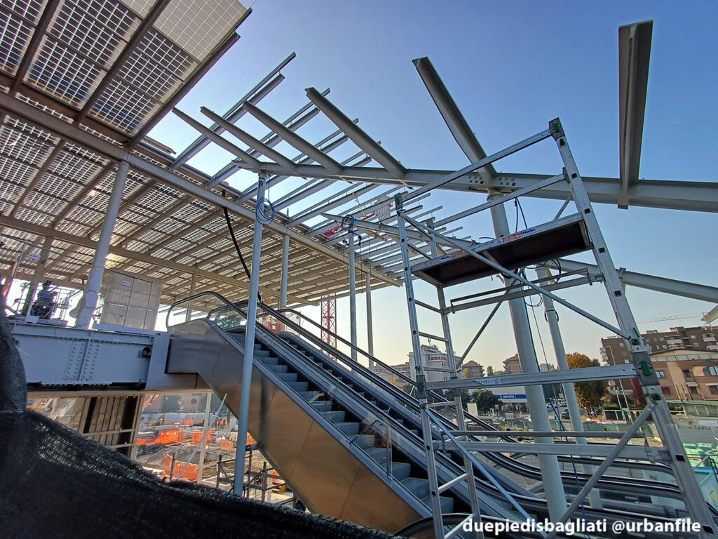 Mentre la stazione di Sesto San Giovanni ha proseguito nello svolgere la sua funzione i lavori, come si vede, sono andati avanti. Si percepisce bene la firma di Renzo piano, con la sua architettura “tecnica” e leggera. Noterete anche che la struttura a ponte ha una maglia metallica invece dei parapetti in cristallo, sicuramente una soluzione esteticamente meno bella, ma posta forse a evitare atti vandalici come scritte e scarabocchi.