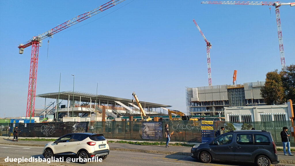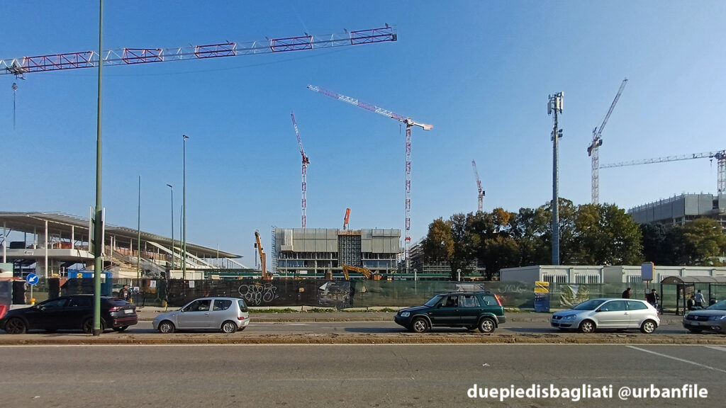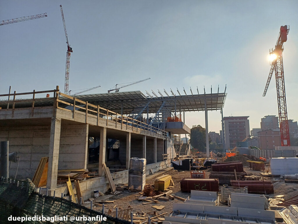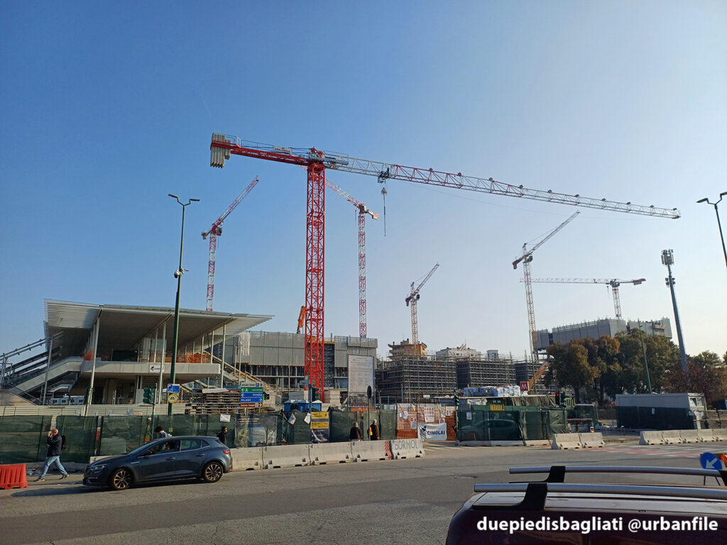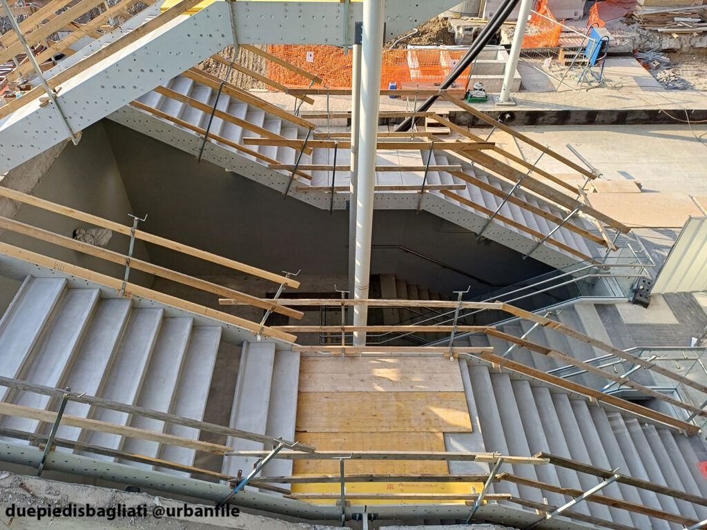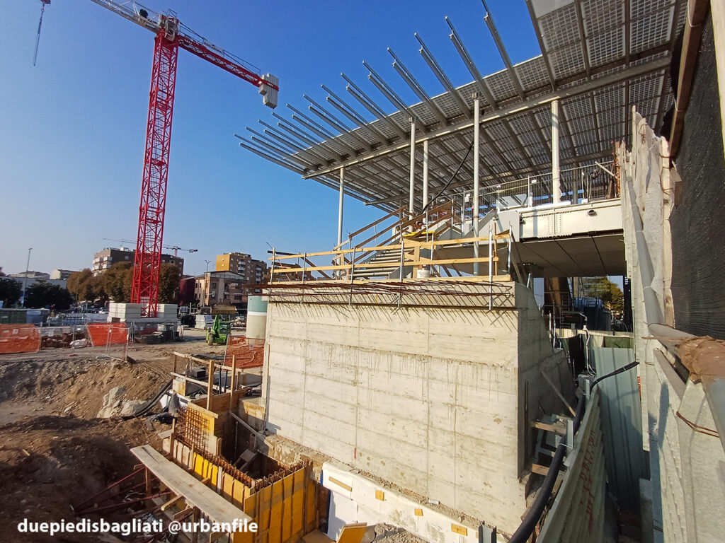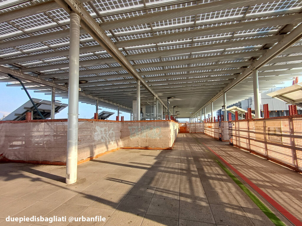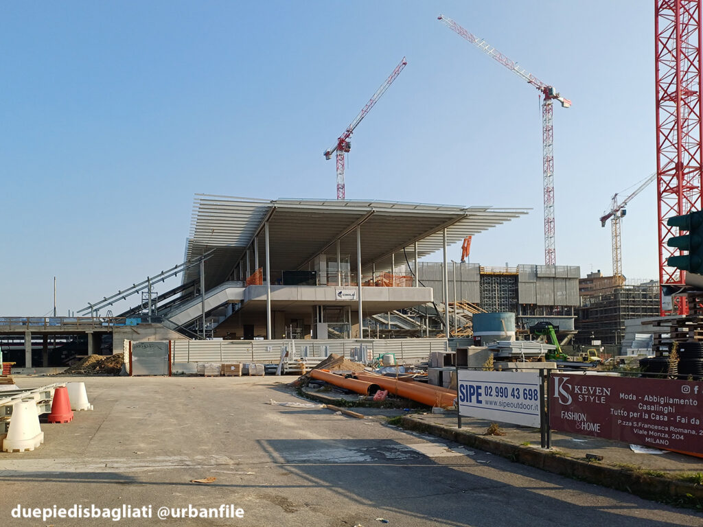 Mentre la stazione di Sesto San Giovanni ha proseguito nello svolgere la sua funzione i lavori, come si vede, sono andati avanti. Si percepisce bene la firma di Renzo piano, con la sua architettura “tecnica” e leggera. Noterete anche che la struttura a ponte ha una maglia metallica invece dei parapetti in cristallo, sicuramente una soluzione esteticamente meno bella, ma posta forse a evitare atti vandalici come scritte e scarabocchi.