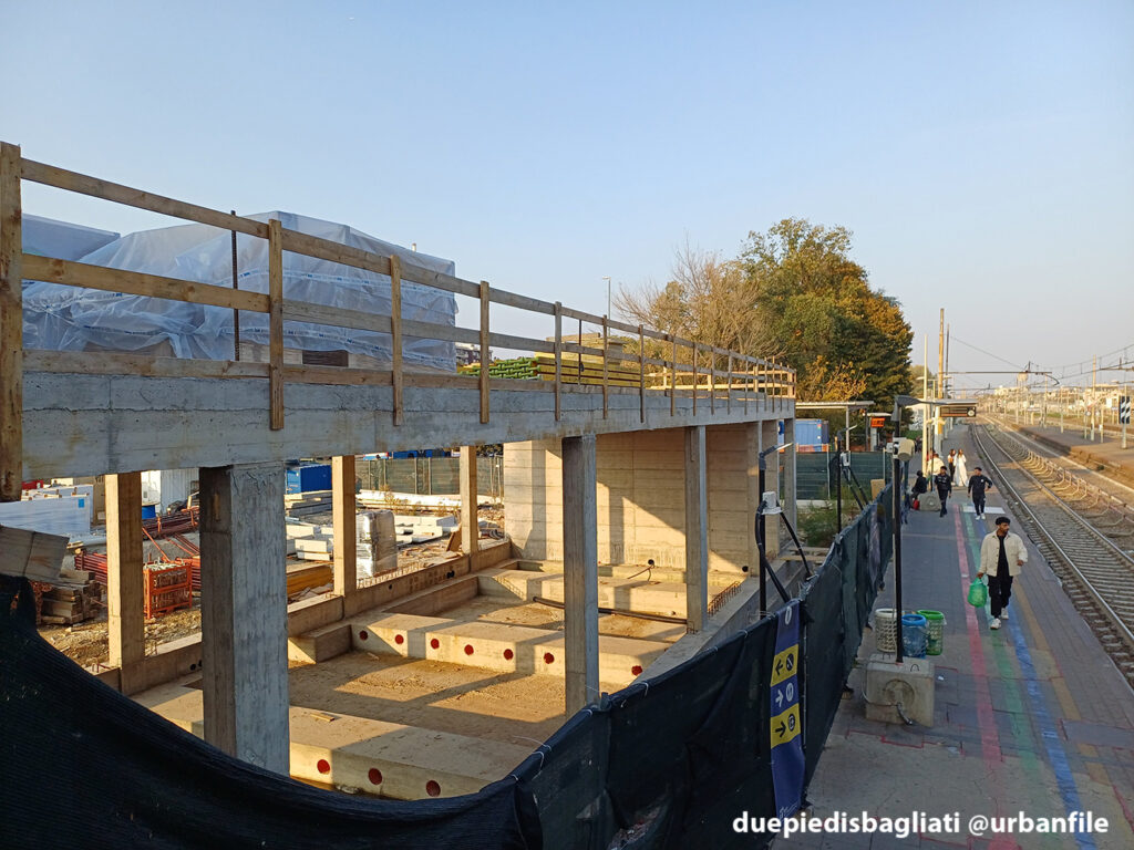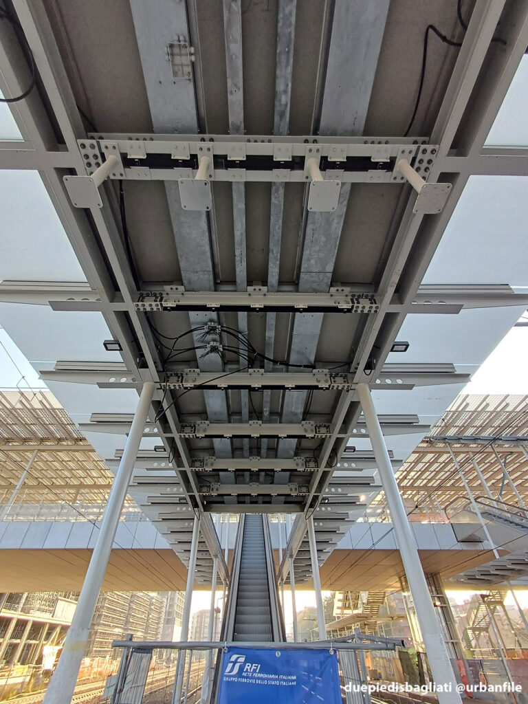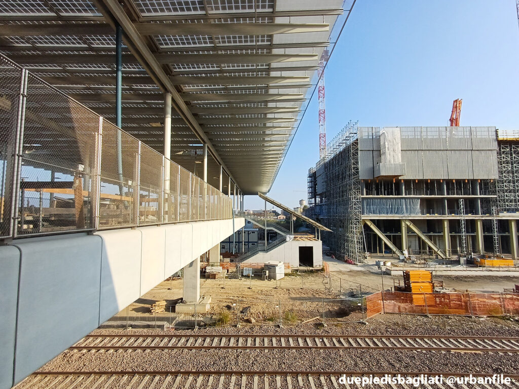 Qui di seguito molte immagini dal cantiere dove si vede bene la lunga passerella di 89 metri di lunghezza per 18 di larghezza, posta al di sopra della linea ferroviaria esistente, dove sono in corso le operazioni per completare la nuova infrastruttura. La copertura della struttura è completamente vetrata e supporta 2.400 mq di celle fotovoltaiche che renderanno il nuovo edificio autonomo dal punto di vista energetico.