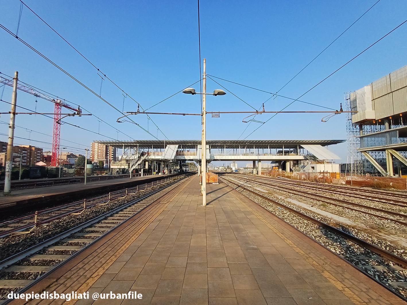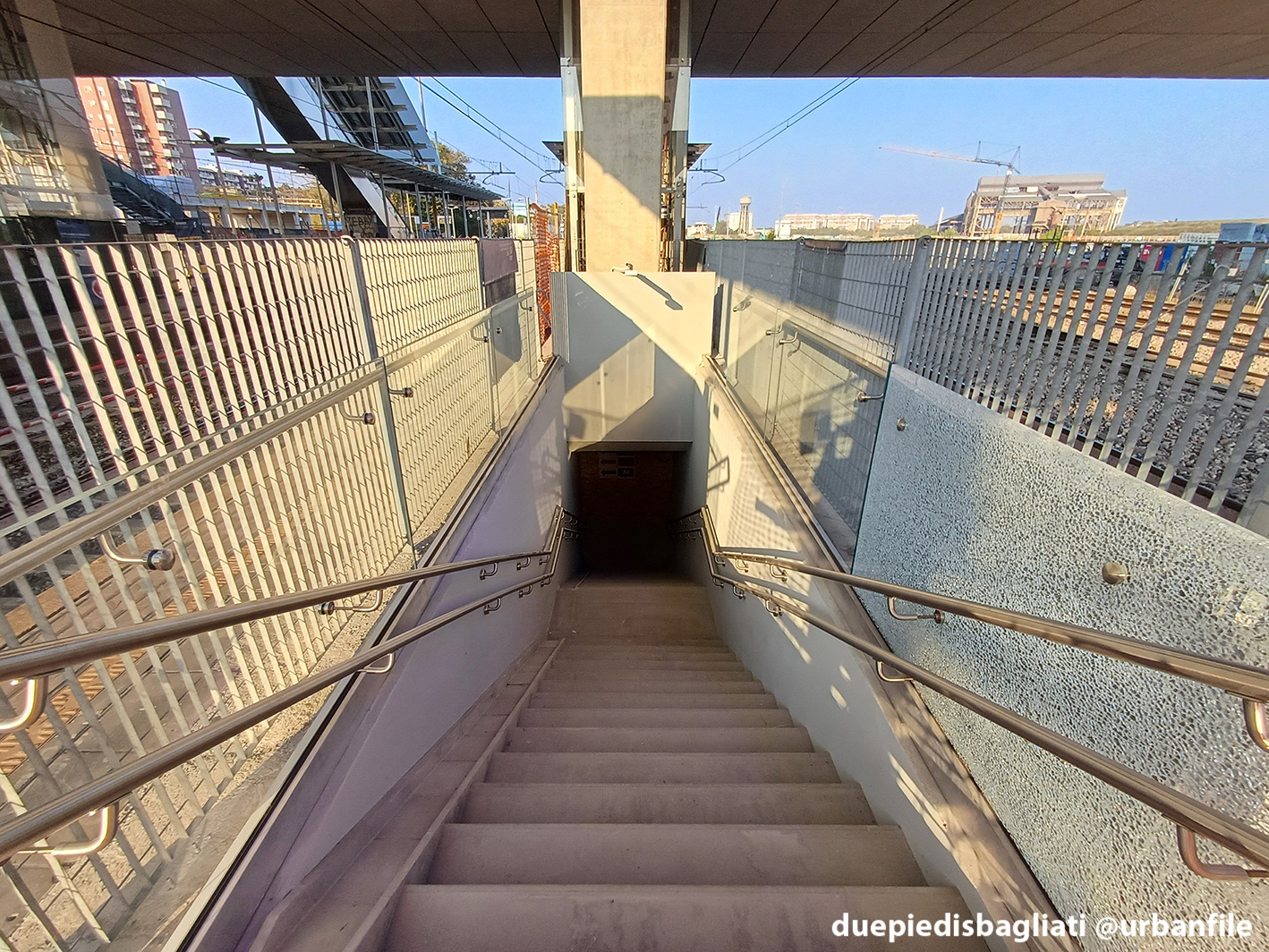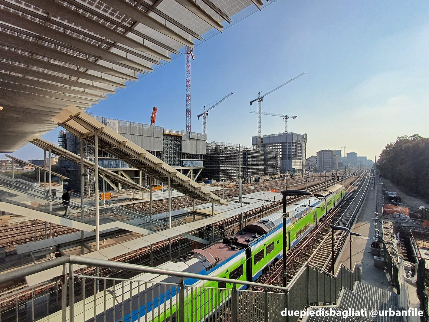 Mentre la stazione di Sesto San Giovanni ha proseguito nello svolgere la sua funzione i lavori, come si vede, sono andati avanti. Si percepisce bene la firma di Renzo piano, con la sua architettura “tecnica” e leggera. Noterete anche che la struttura a ponte ha una maglia metallica invece dei parapetti in cristallo, sicuramente una soluzione esteticamente meno bella, ma posta forse a evitare atti vandalici come scritte e scarabocchi.