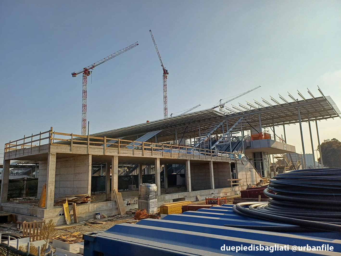 Qui di seguito molte immagini dal cantiere dove si vede bene la lunga passerella di 89 metri di lunghezza per 18 di larghezza, posta al di sopra della linea ferroviaria esistente, dove sono in corso le operazioni per completare la nuova infrastruttura. La copertura della struttura è completamente vetrata e supporta 2.400 mq di celle fotovoltaiche che renderanno il nuovo edificio autonomo dal punto di vista energetico.