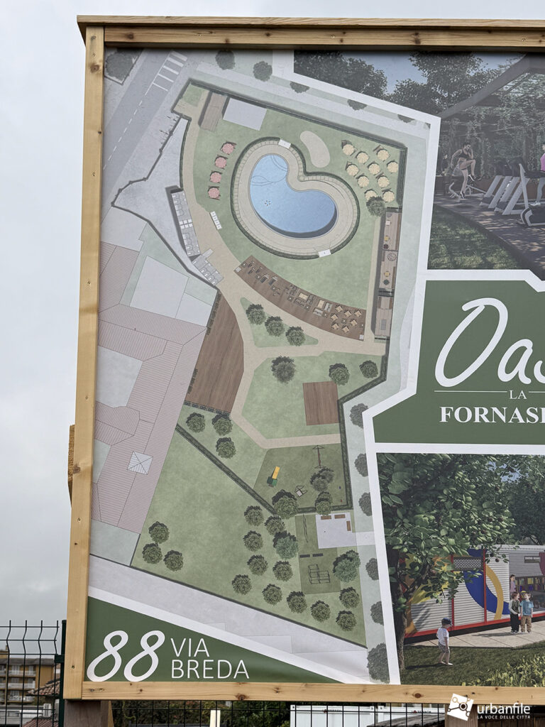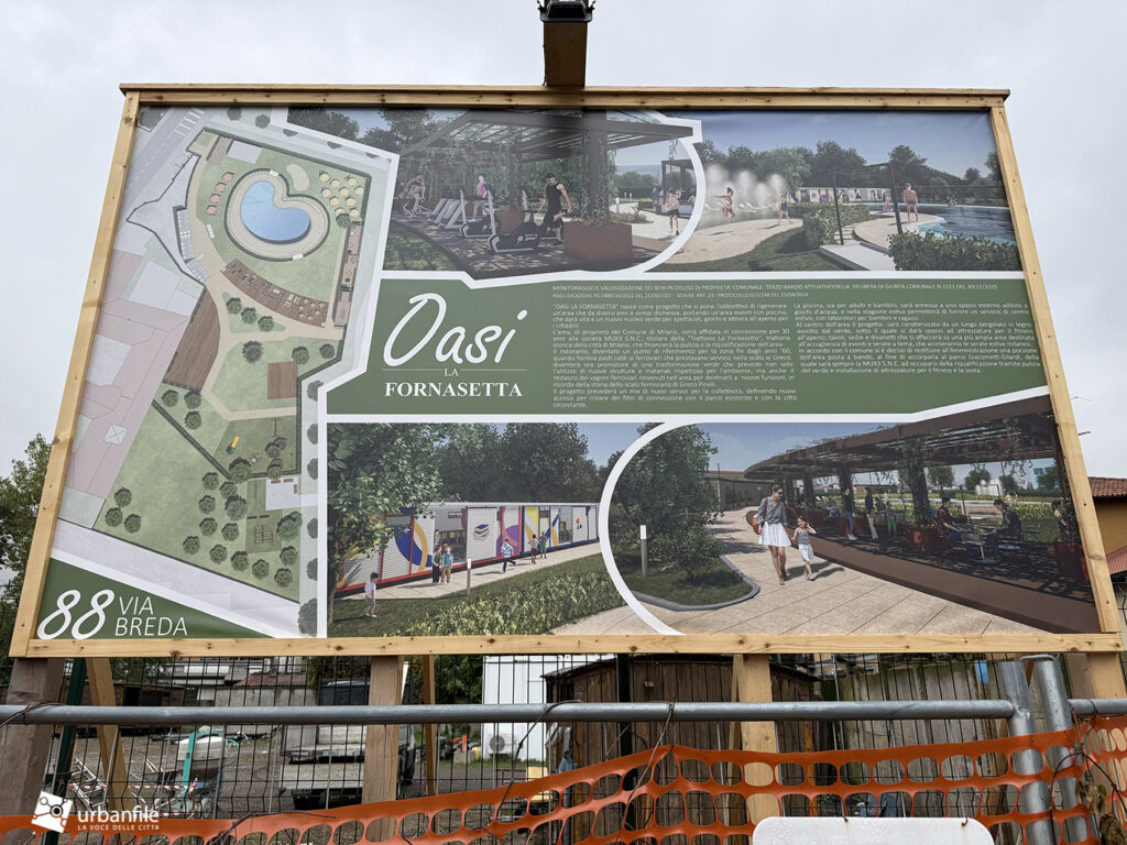 Sul retro, verso Precotto, si trova da sempre un terreno in abbandono di proprietà comunale. In quest’area sta prendendo forma L’Oasi La Fornasetta, un nuovo spazio verde con una piscina.
