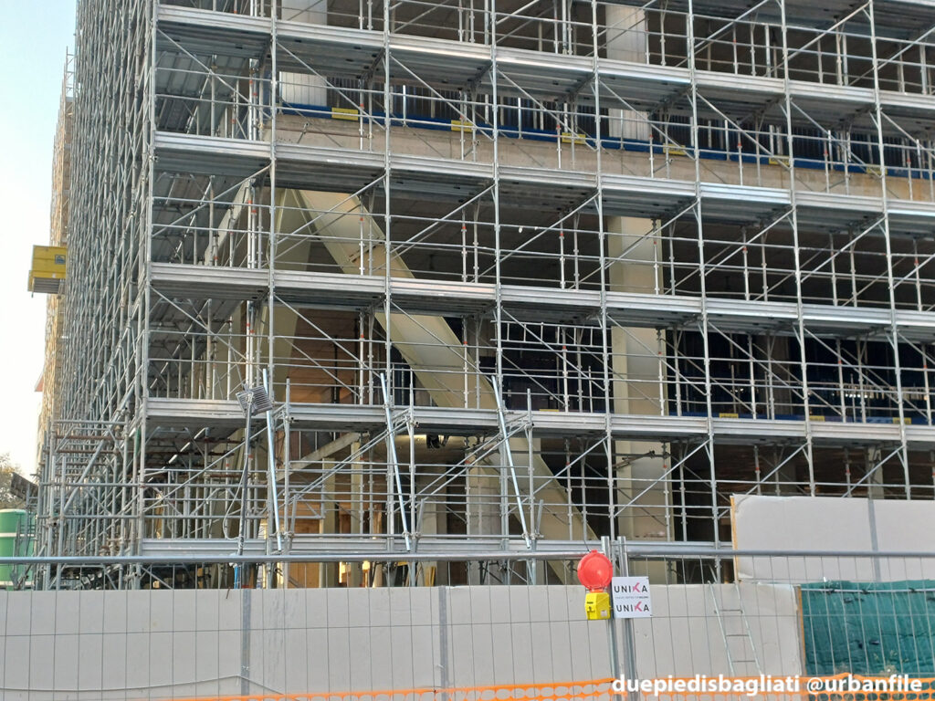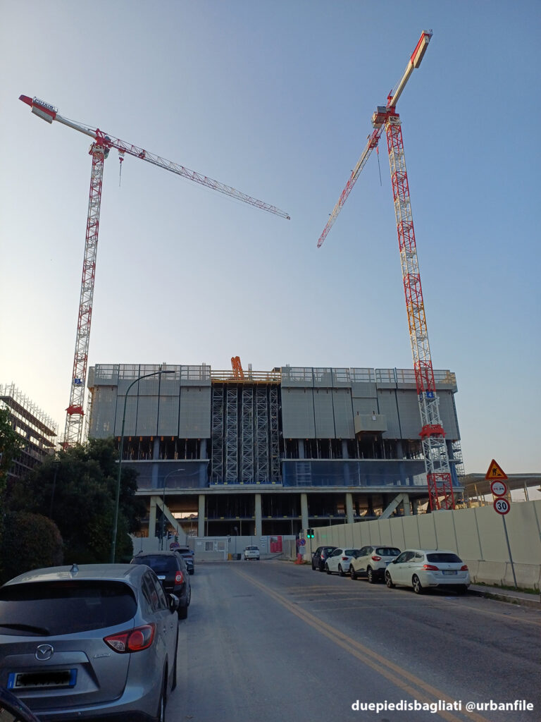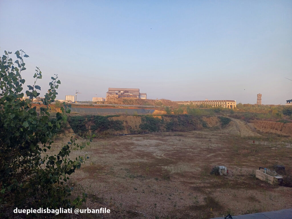 Il cantiere è ripreso da lontano, perché impossibile al momento avere una visione migliore. Su tutto domina la struttura della vecchia acciaieria che sarà mantenuta e restaurata.