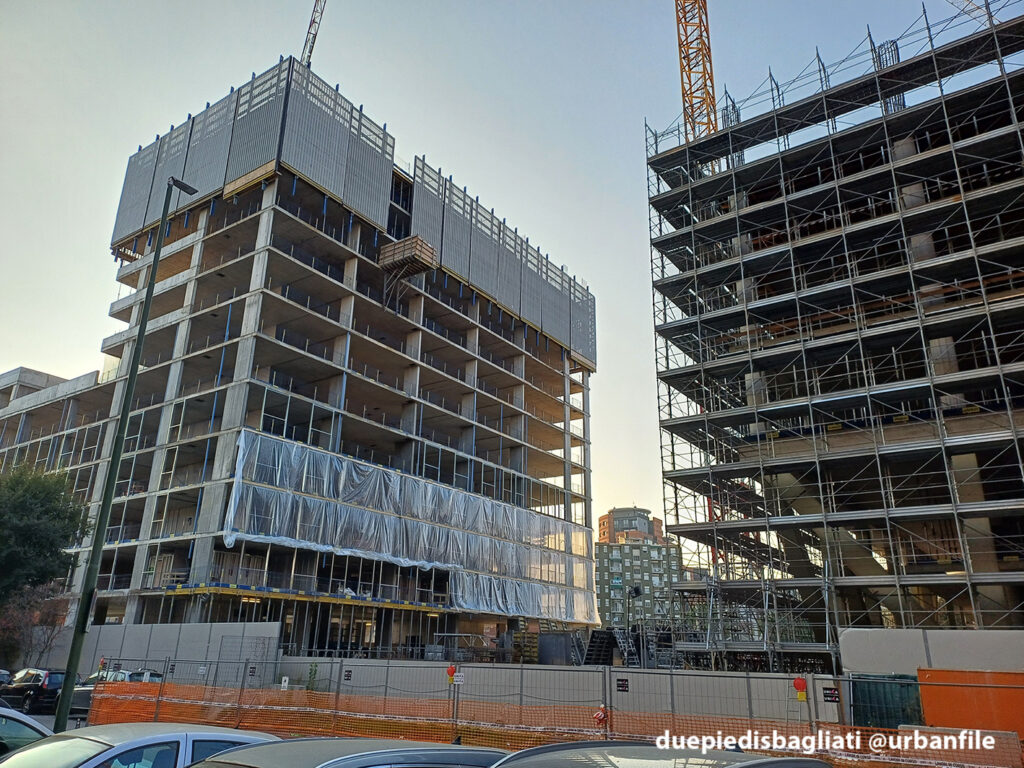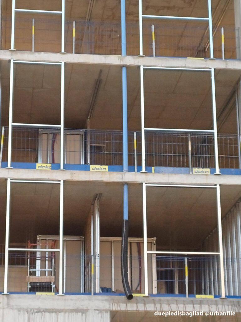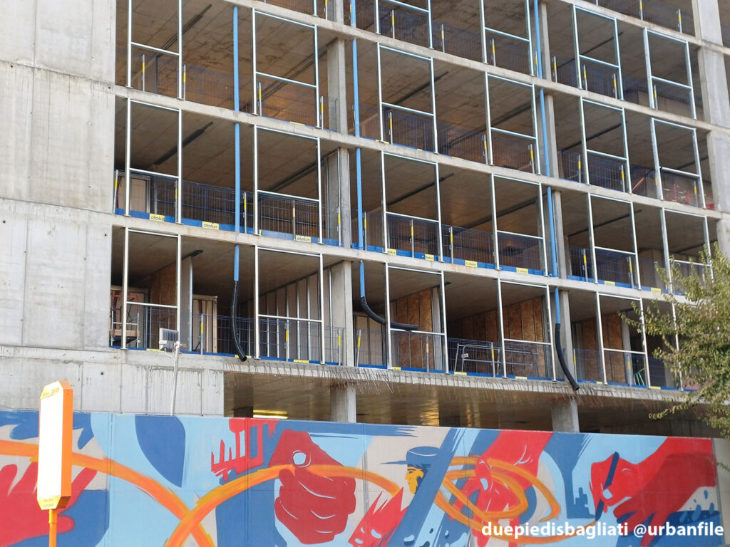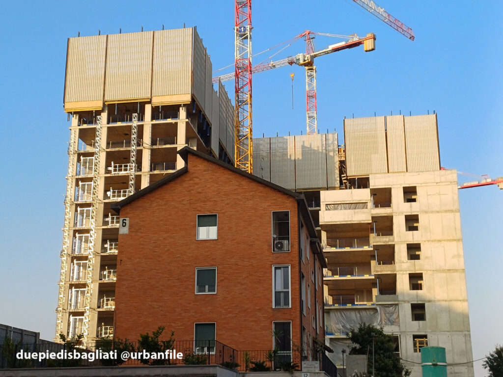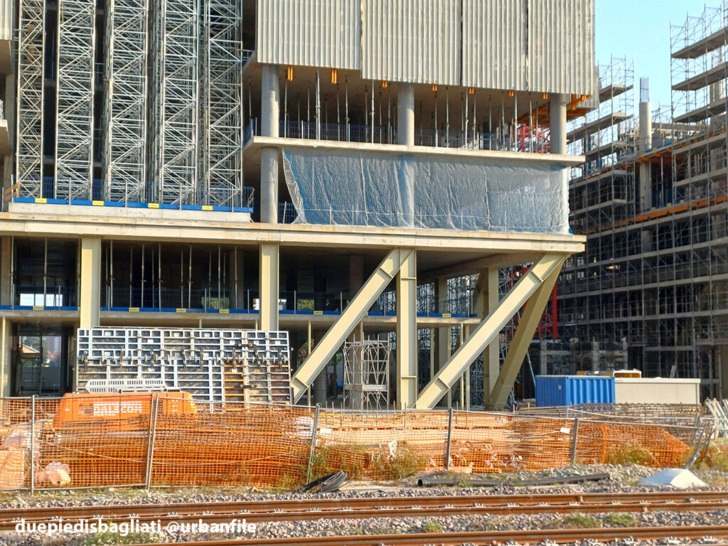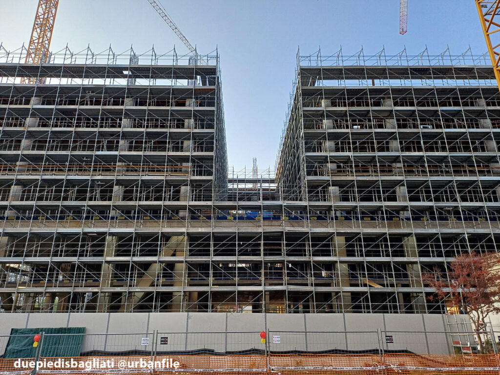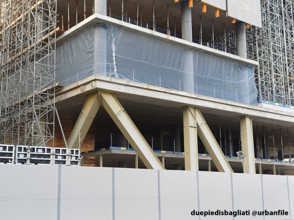 I due palazzi proseguono nella loro salita. Particolarmente interessanti i pilastri inclinati di entrambi gli edifici.