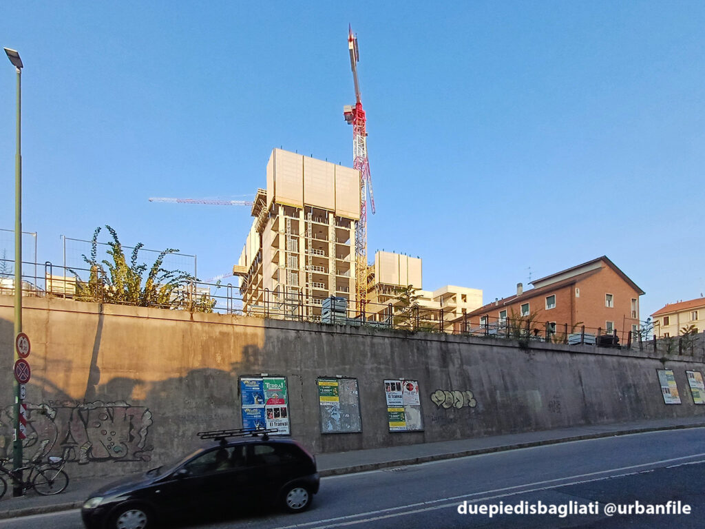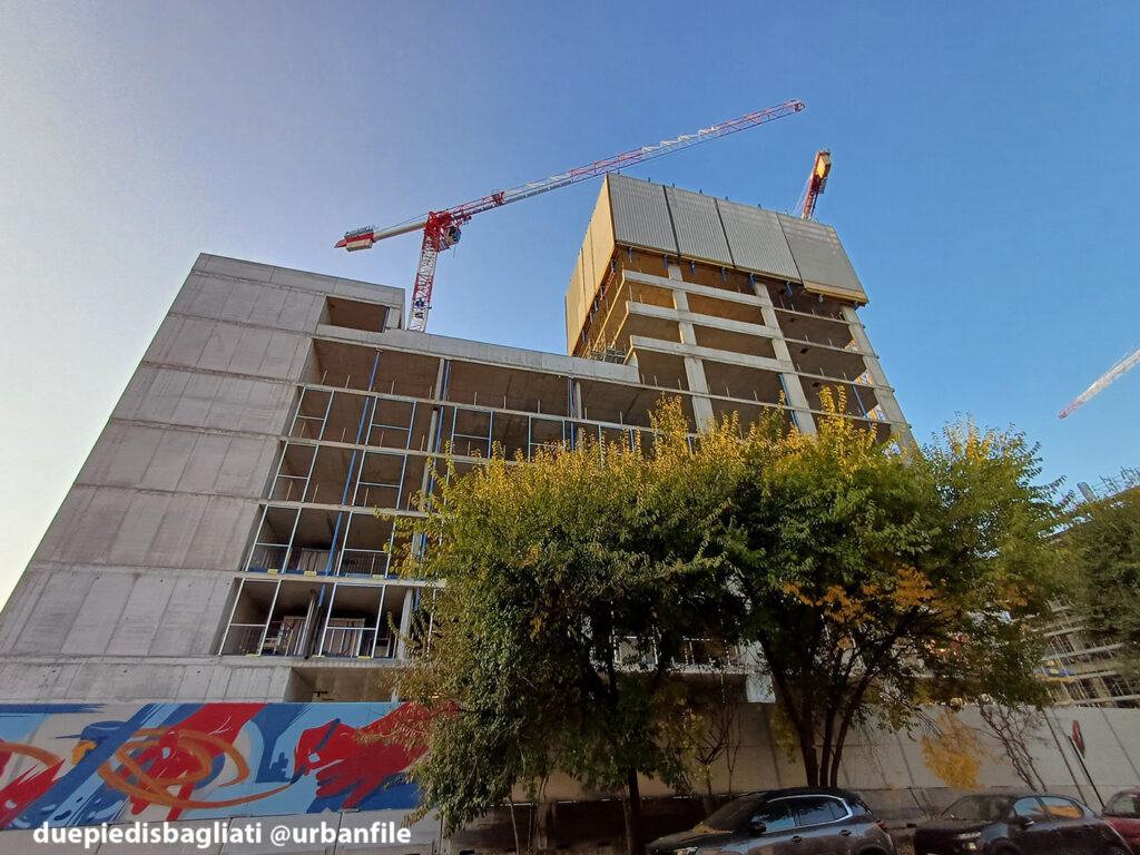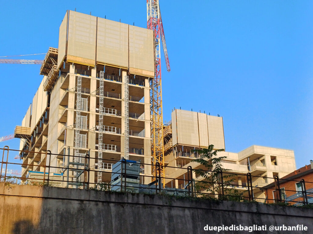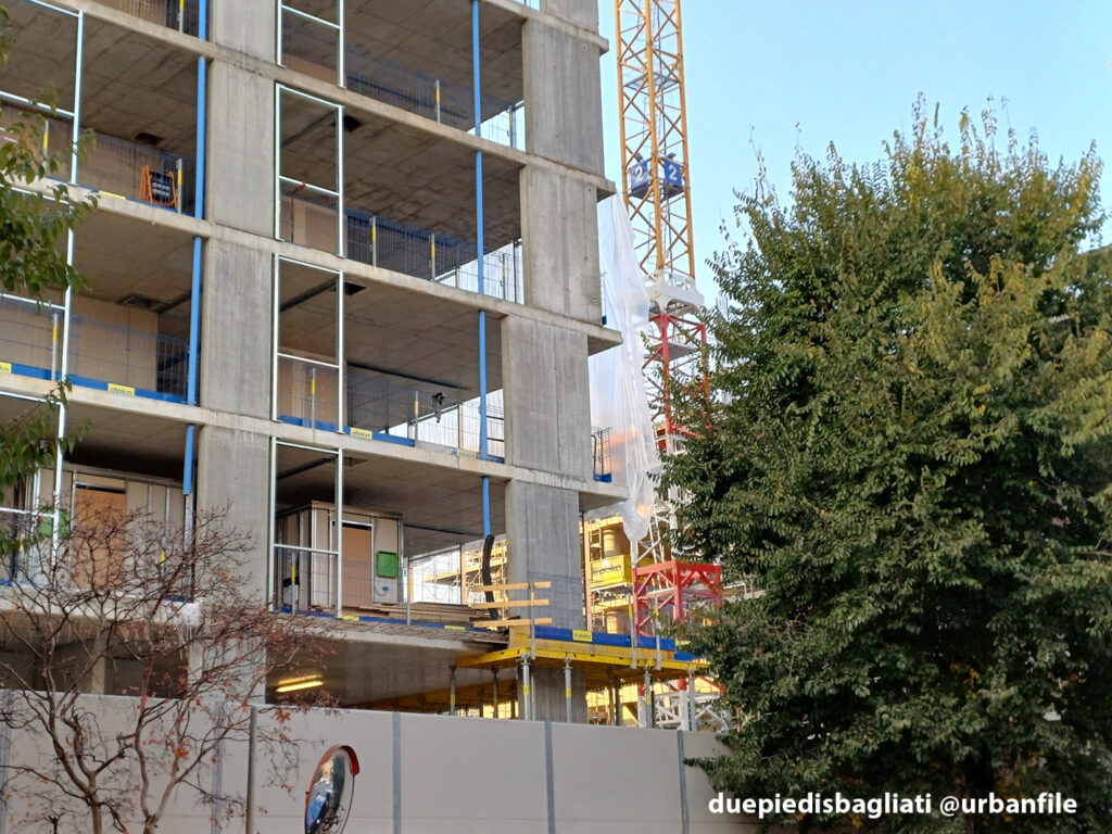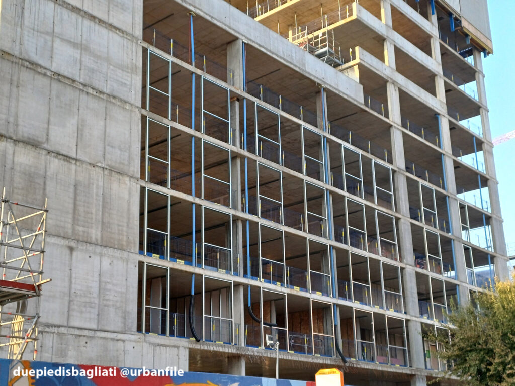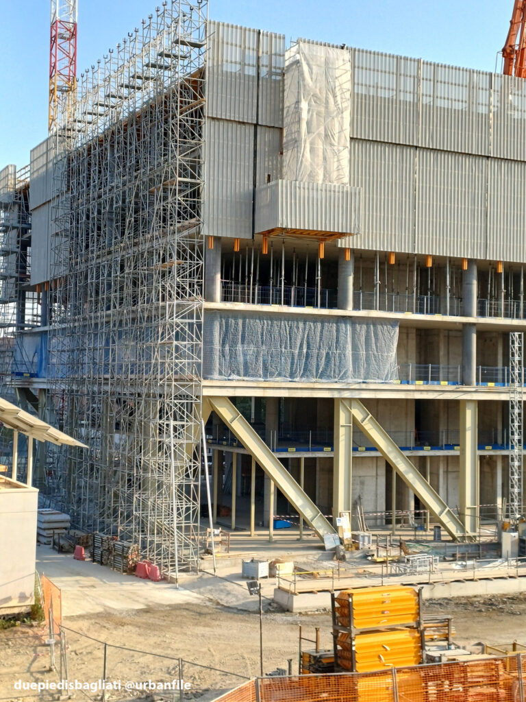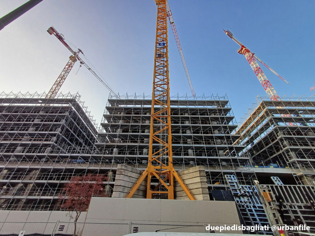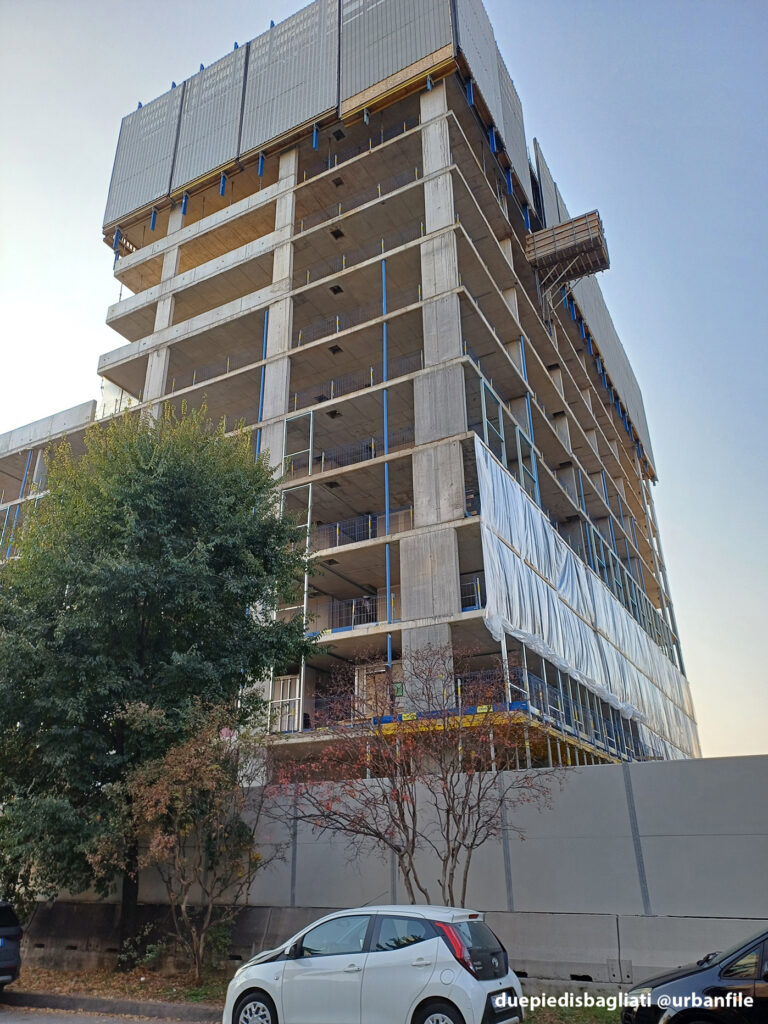 I due palazzi proseguono nella loro salita. Particolarmente interessanti i pilastri inclinati di entrambi gli edifici.
