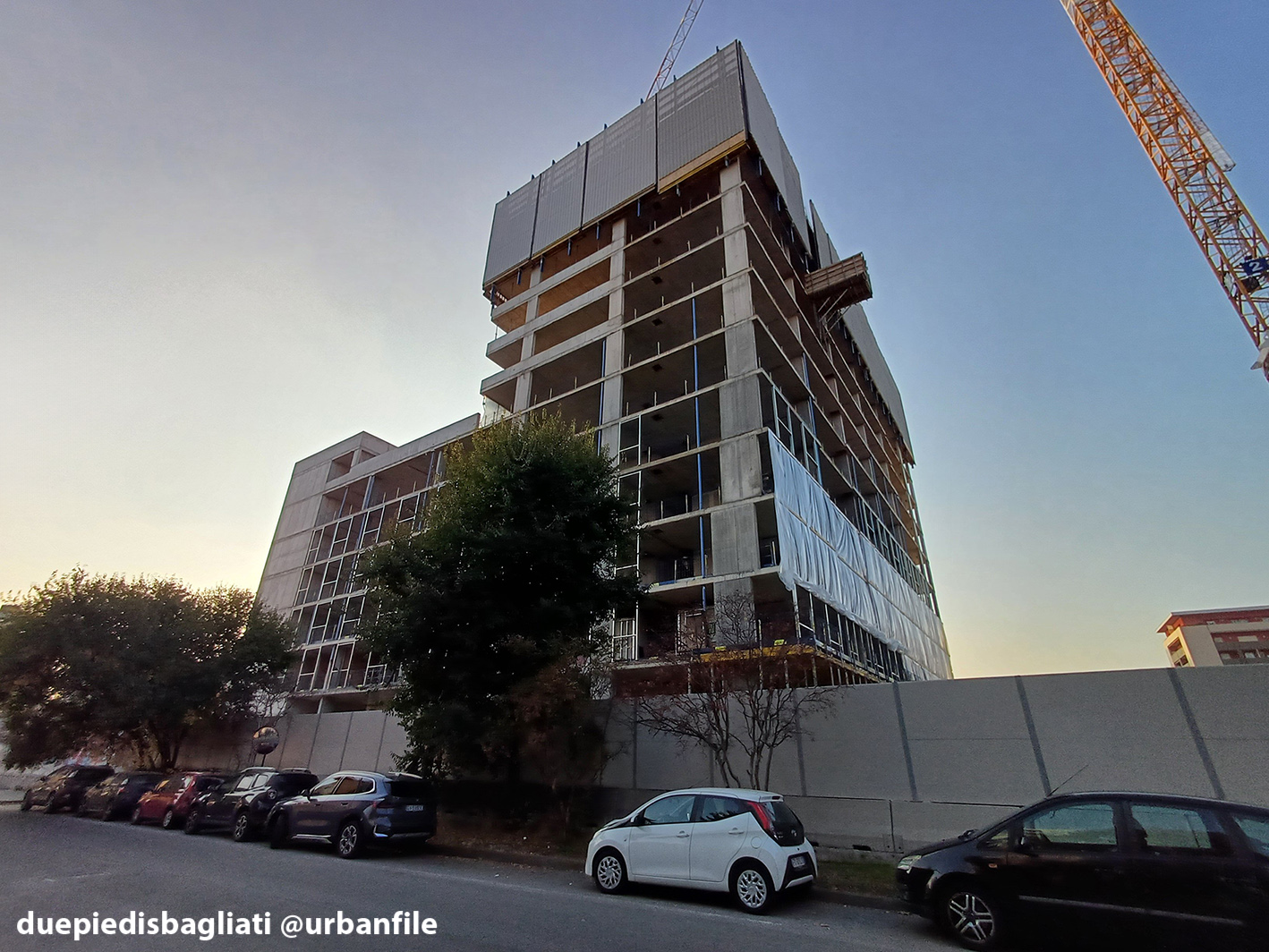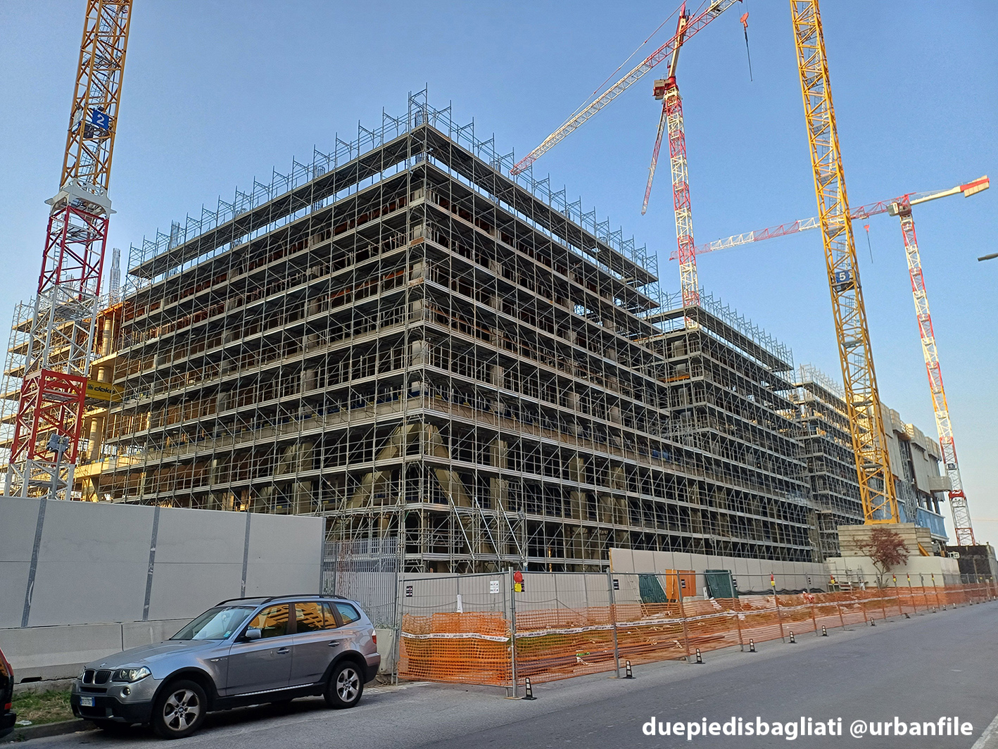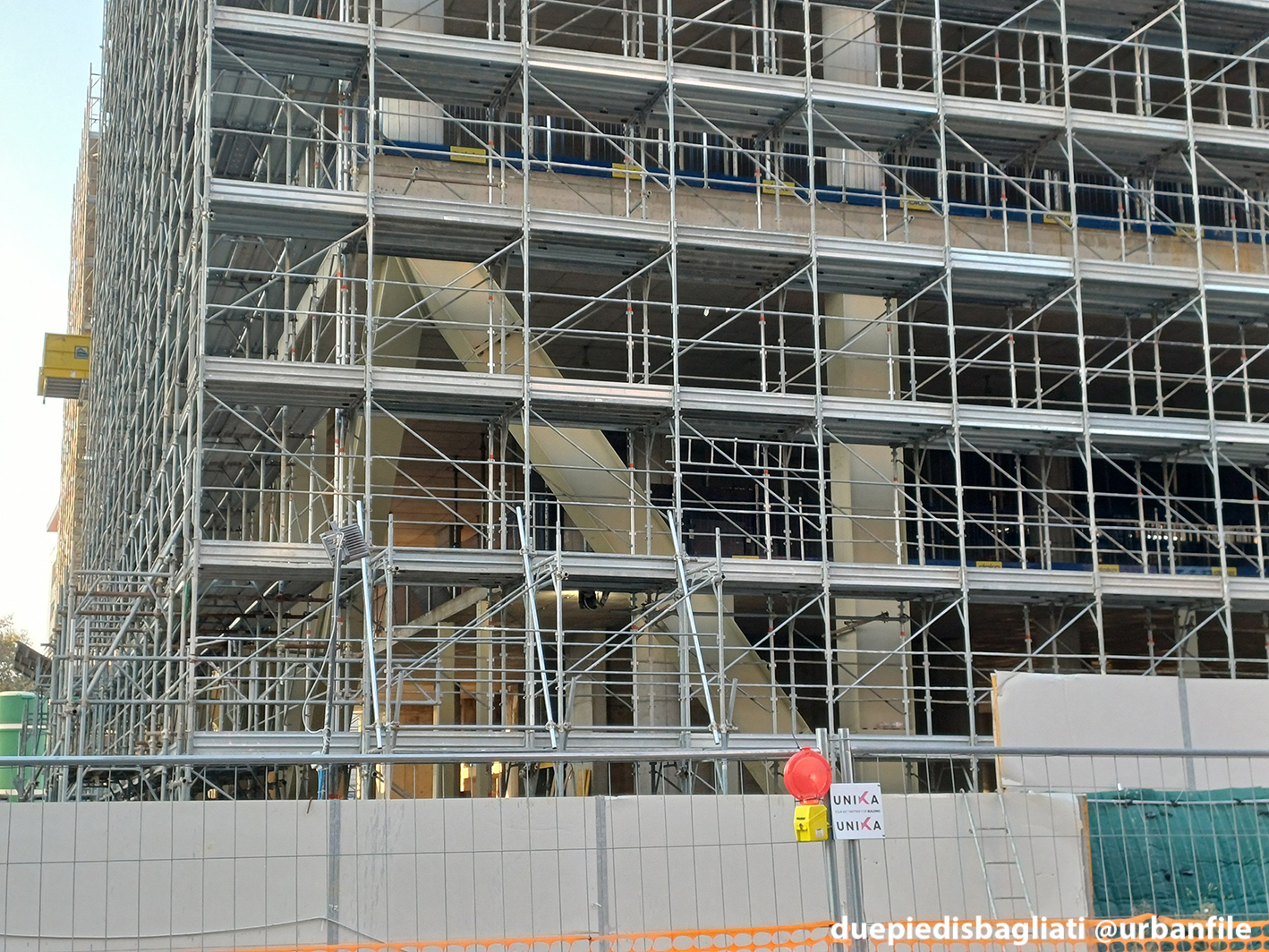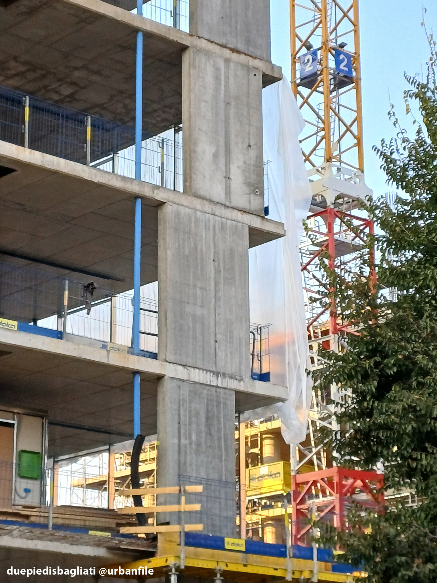 I due palazzi proseguono nella loro salita. Particolarmente interessanti i pilastri inclinati di entrambi gli edifici.