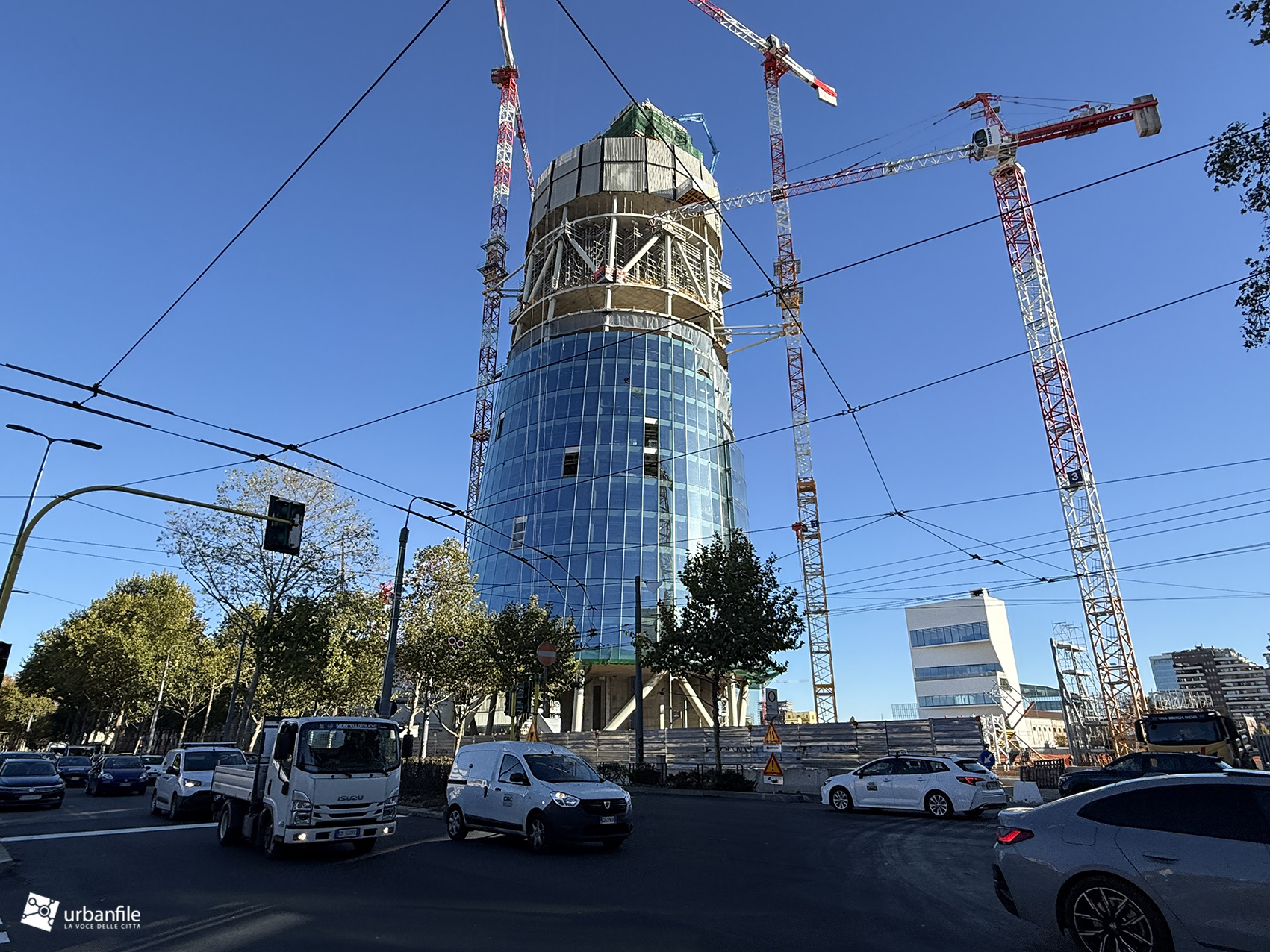 La torre cilindrica e rastremata avrà una pianta circolare e prevederà i primi 12 piani ad uso uffici, uno Sky Garden a 60 metri di altezza e aperto su uno dei suoi lati, seguiranno altri 10 piani di uffici ed un belvedere, accessibile dal pubblico, posto sulla sommità della torre. L’impresa che sta costruendo la torre è CMB con Colombo Costruzioni.
