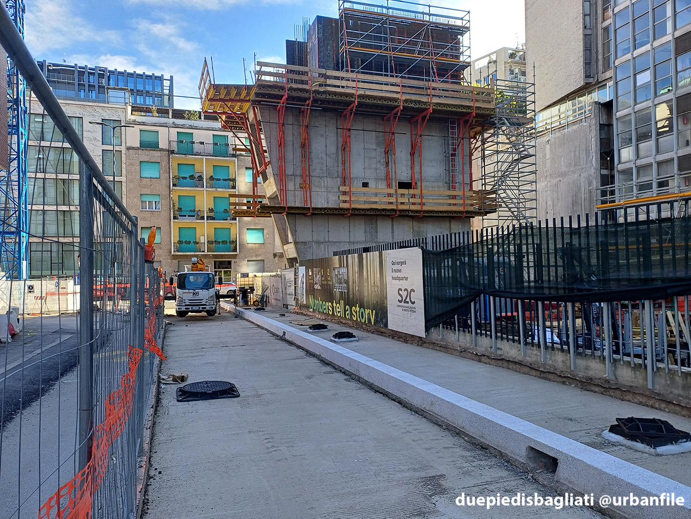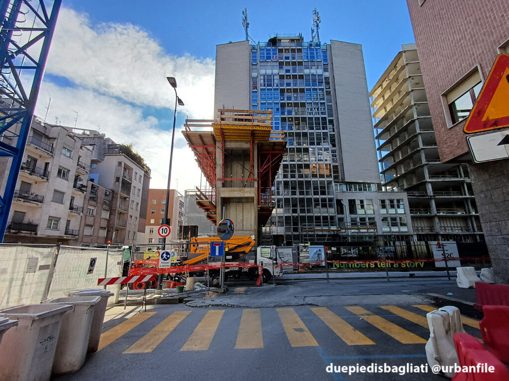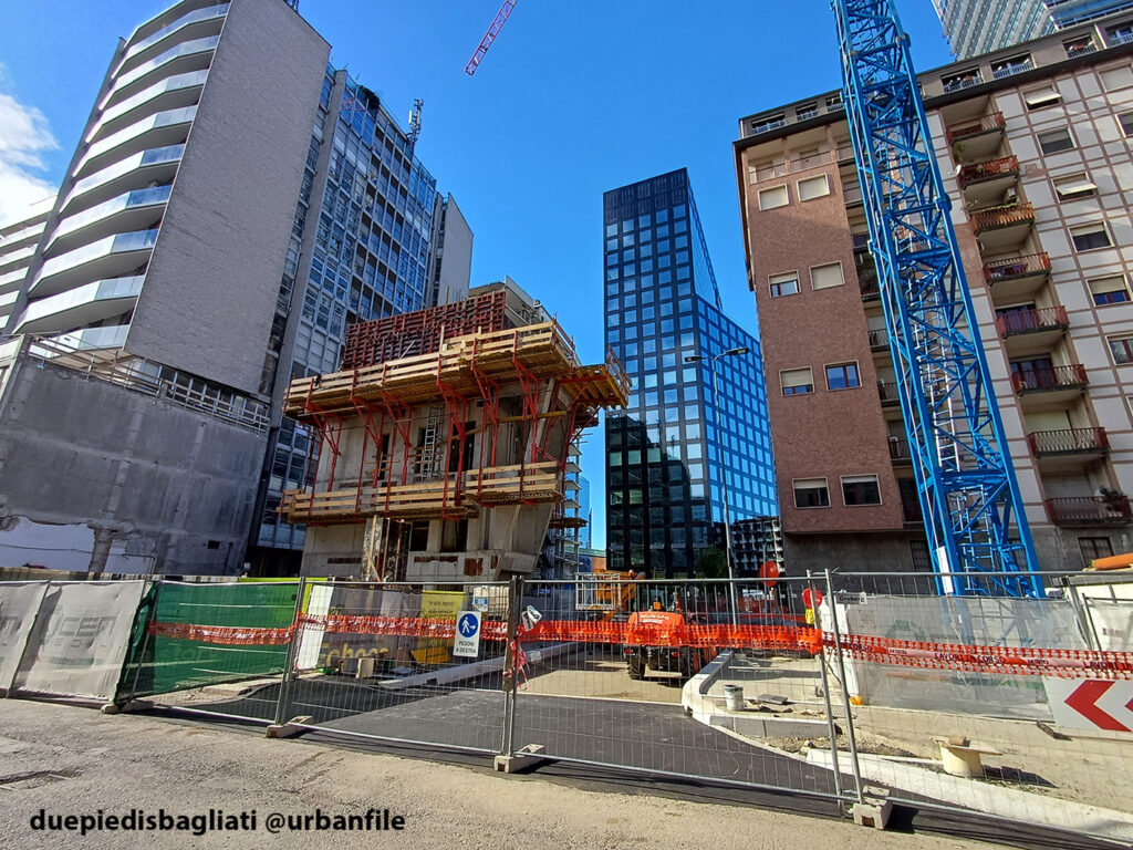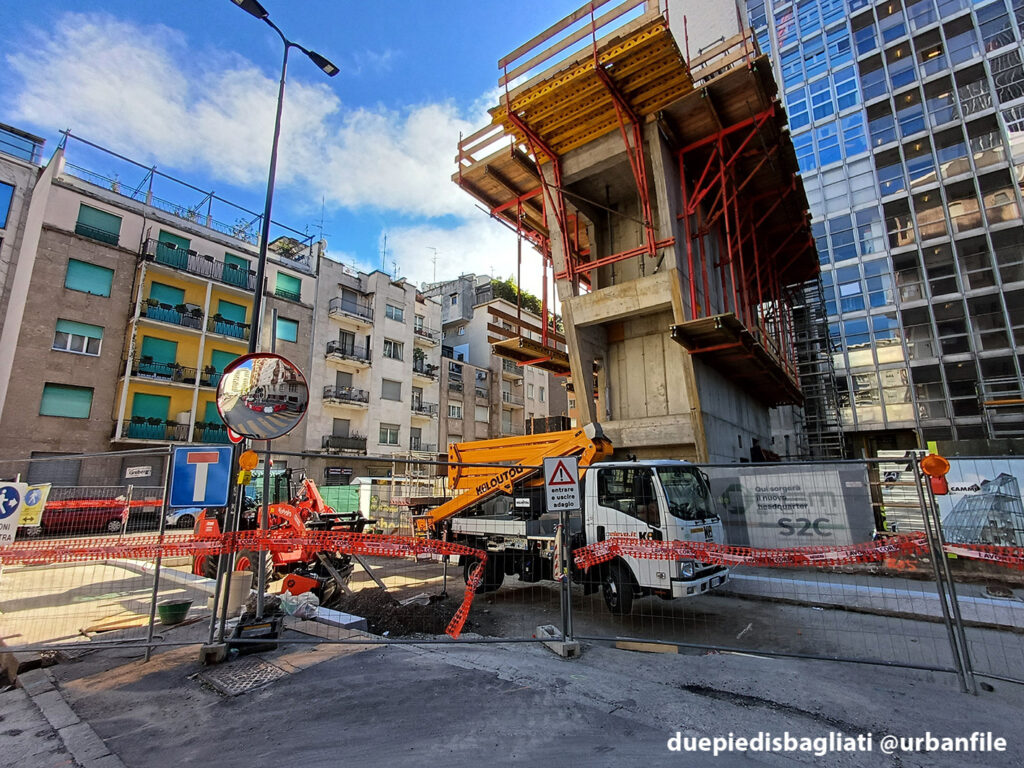 Come si vede dalle foto, il piccolo “core” in cemento armato ha già raggiunto il terzo e quarto livello. Si nota anche le due “mensole” che consentono alla struttura di allargarsi un po’ salendo, dandole la forma “scomposta”. Nel frattempo si vede bene che stanno ricostruendo i marciapiedi di Via Clelia del Grillo Borromeo “distrutti” per le attività di cantiere del confinante cantiere dei Portali di via Gioia 20.