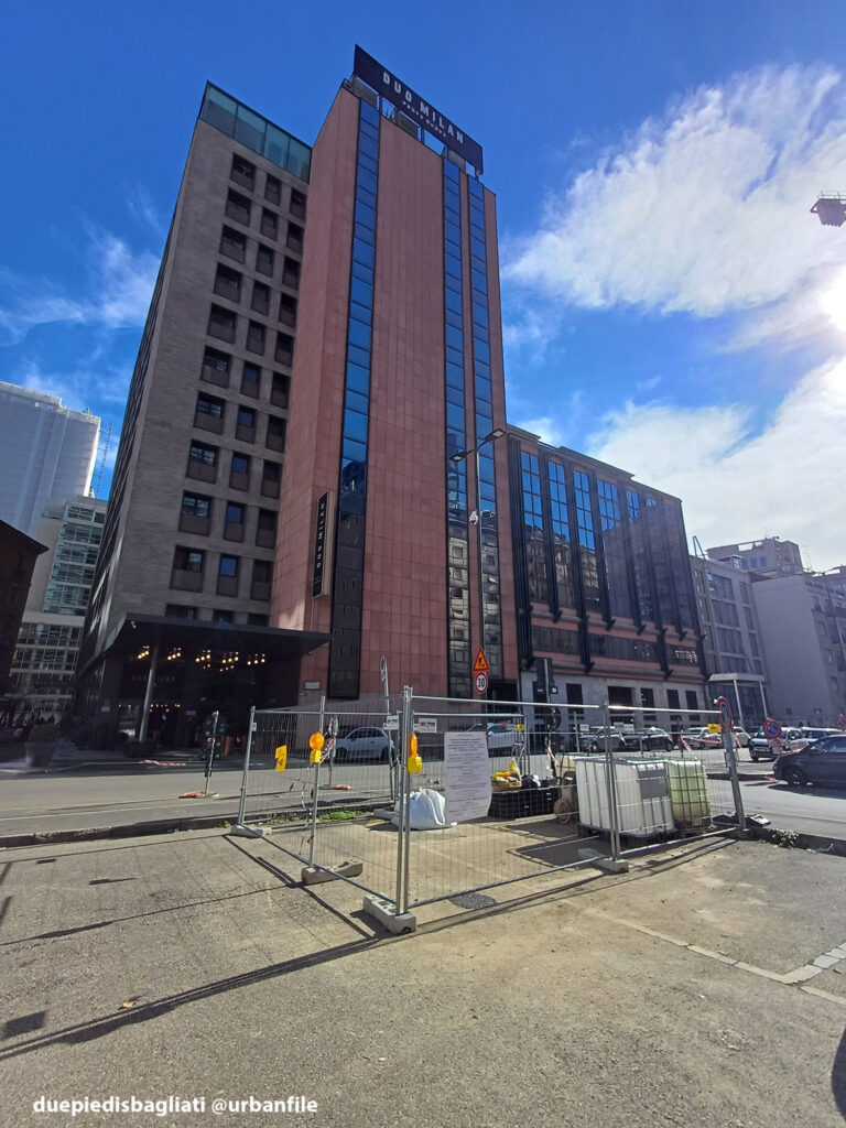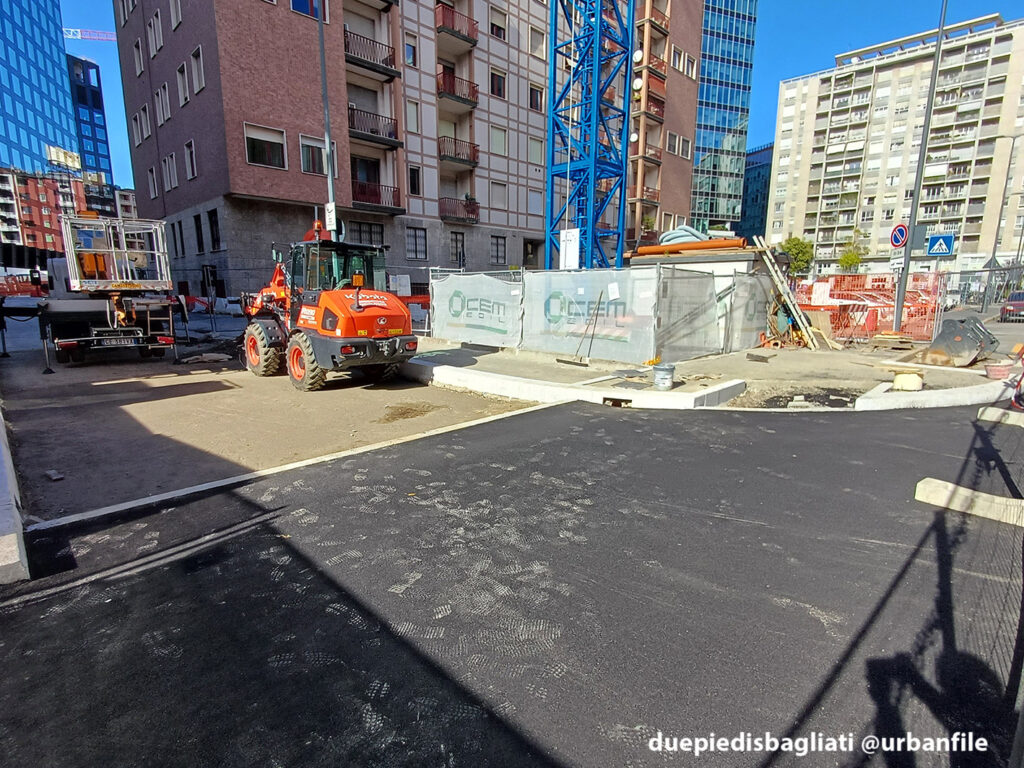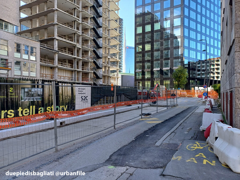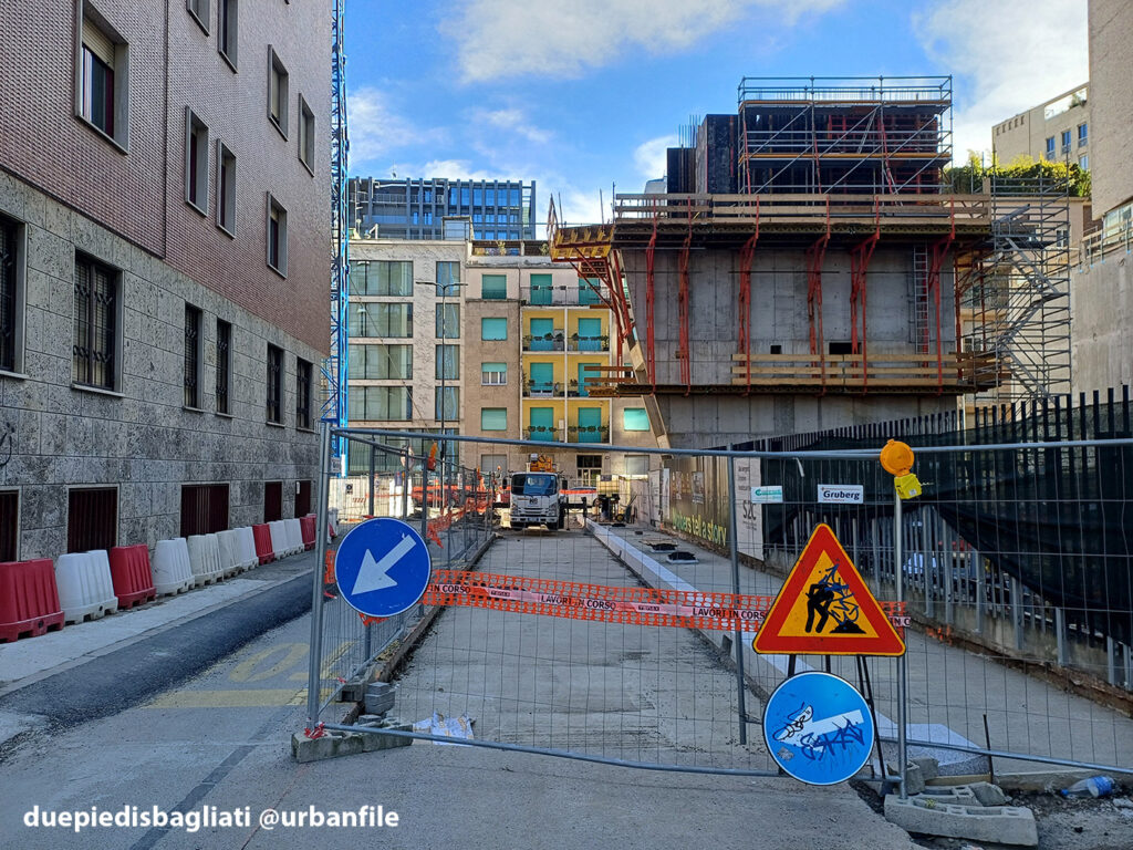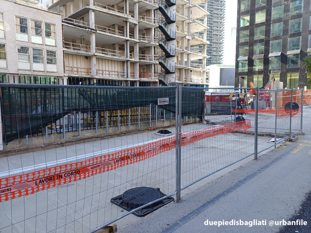 Come si vede dalle foto, il piccolo “core” in cemento armato ha già raggiunto il terzo e quarto livello. Si nota anche le due “mensole” che consentono alla struttura di allargarsi un po’ salendo, dandole la forma “scomposta”. Nel frattempo si vede bene che stanno ricostruendo i marciapiedi di Via Clelia del Grillo Borromeo “distrutti” per le attività di cantiere del confinante cantiere dei Portali di via Gioia 20.